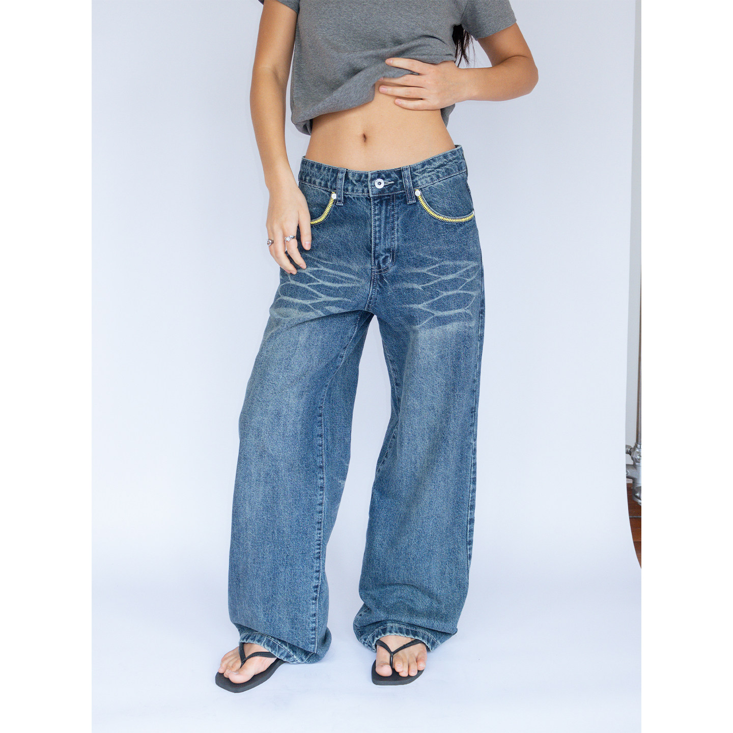 --------------------- FUNKYFUN 美式复古做旧撞色刺绣洗水牛仔裤廓形直筒阔腿中腰长裤 【原售价】155元 【现售价】107元 【推荐理由】