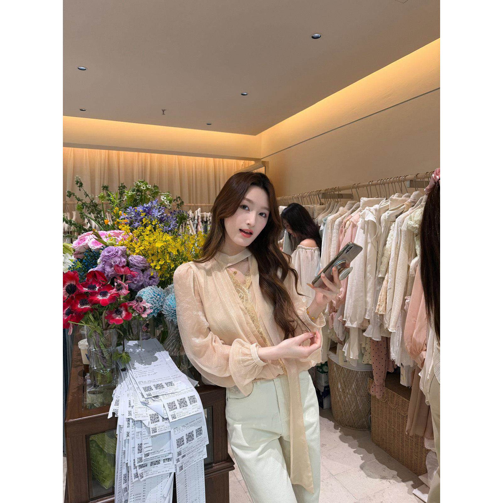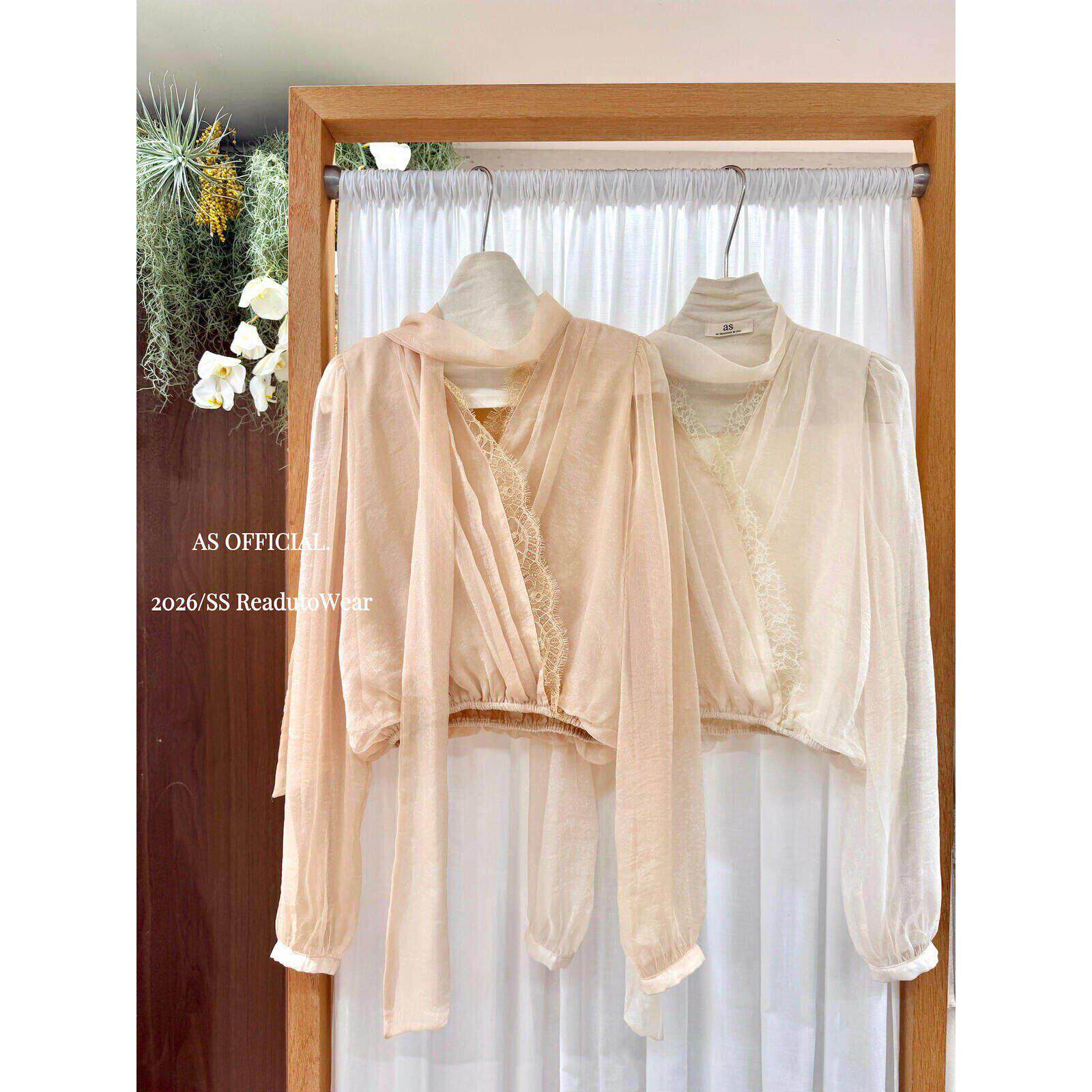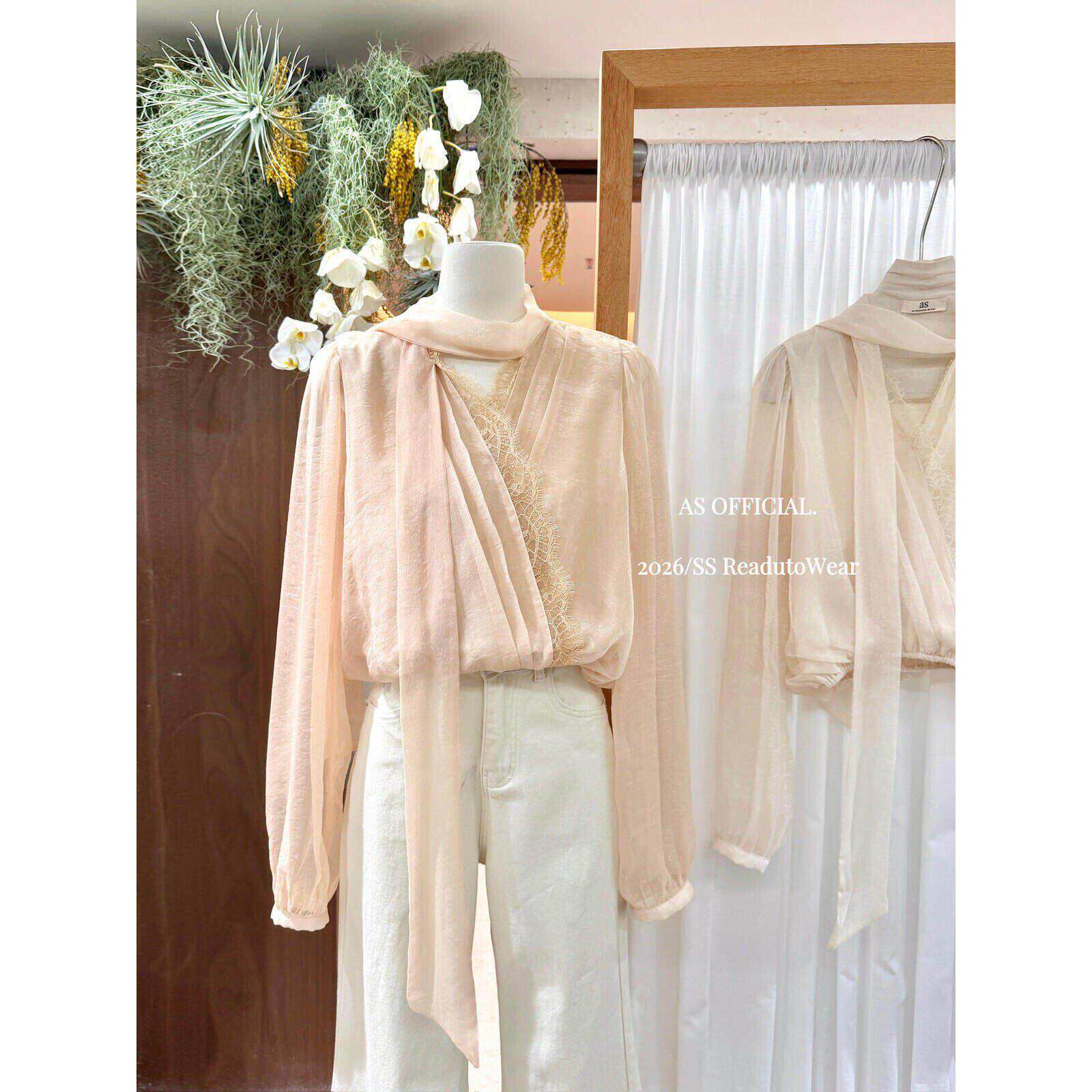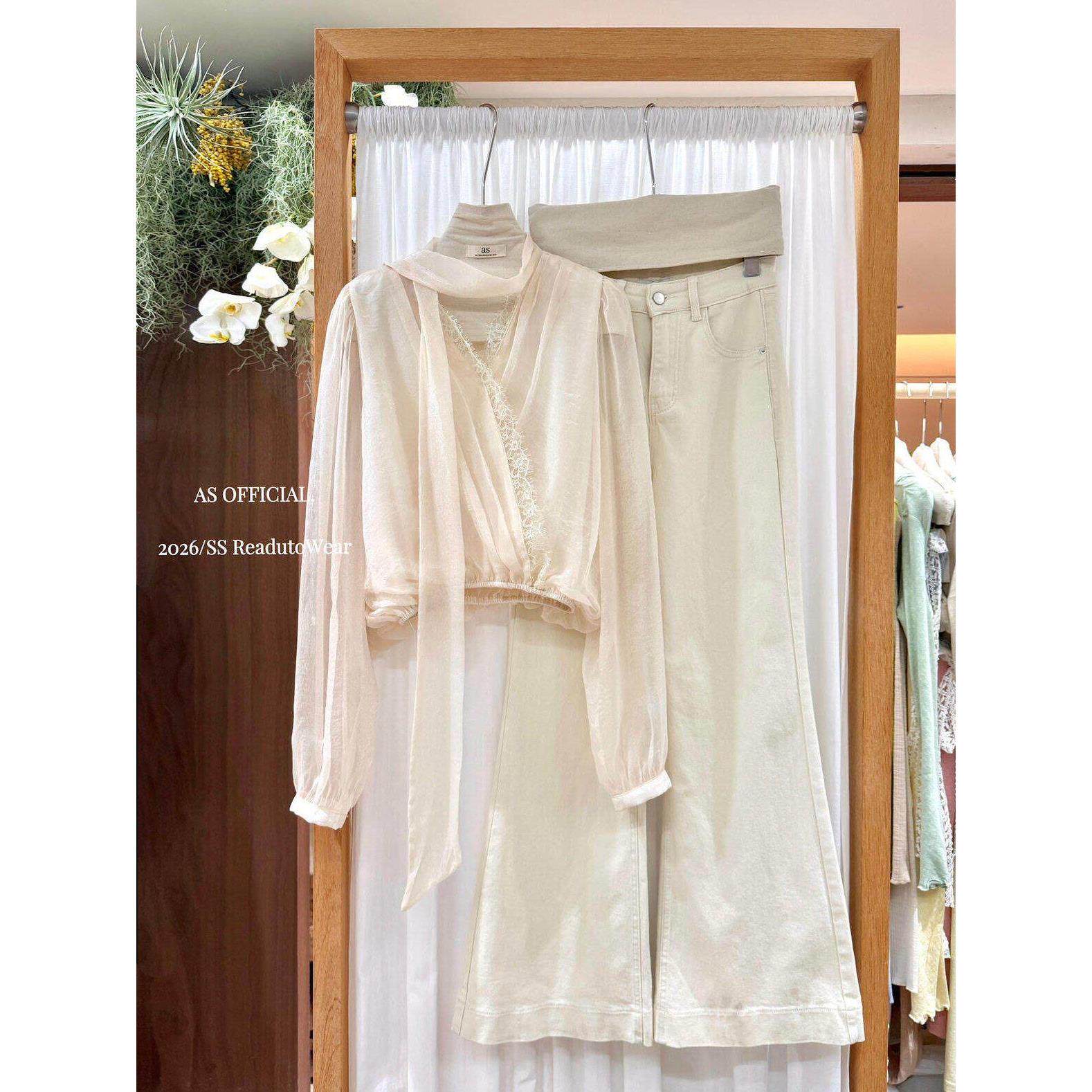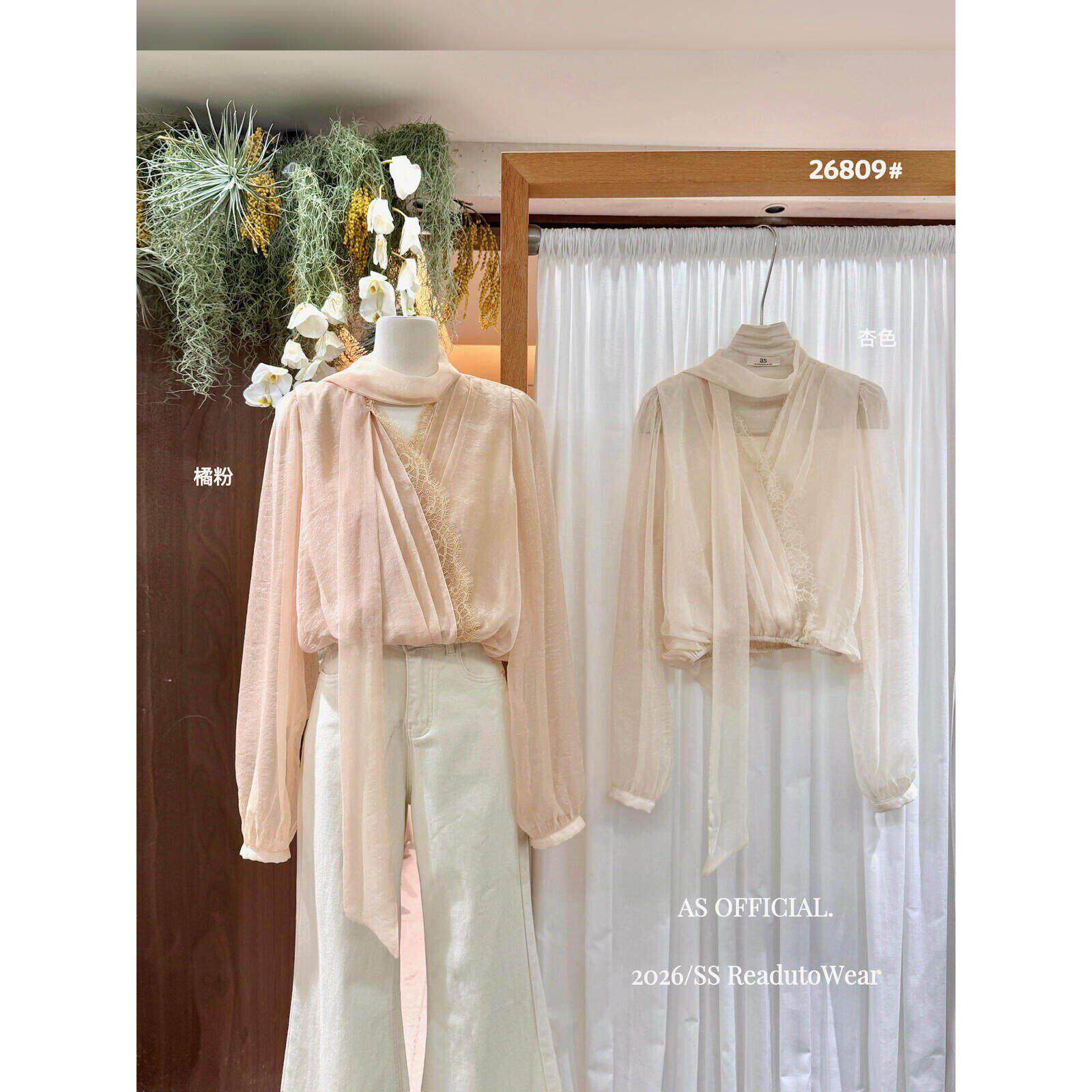 十三行 AS OFFICIAL韩女蕾丝飘带领雪纺小衫女2026春短款衬衫上衣