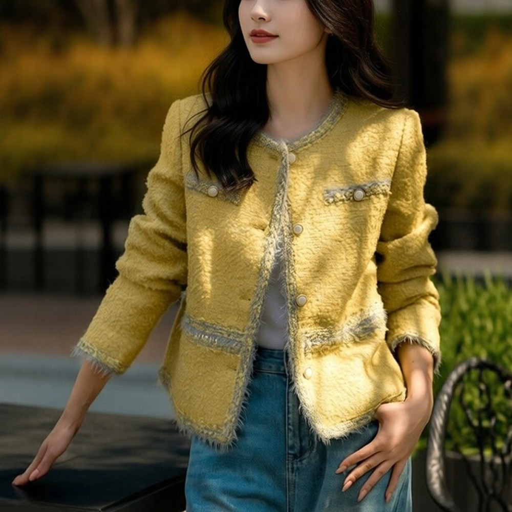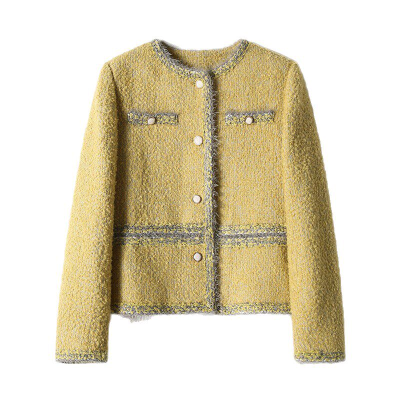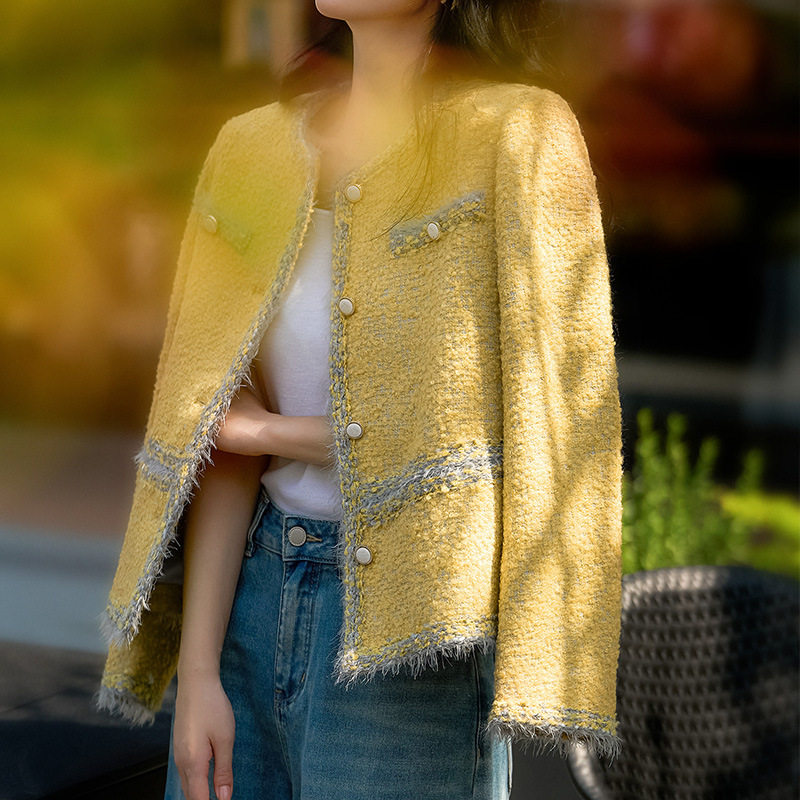 【乳酪芝士】春秋新款羊毛马海毛圆领小香风粗花呢黄色短外套女