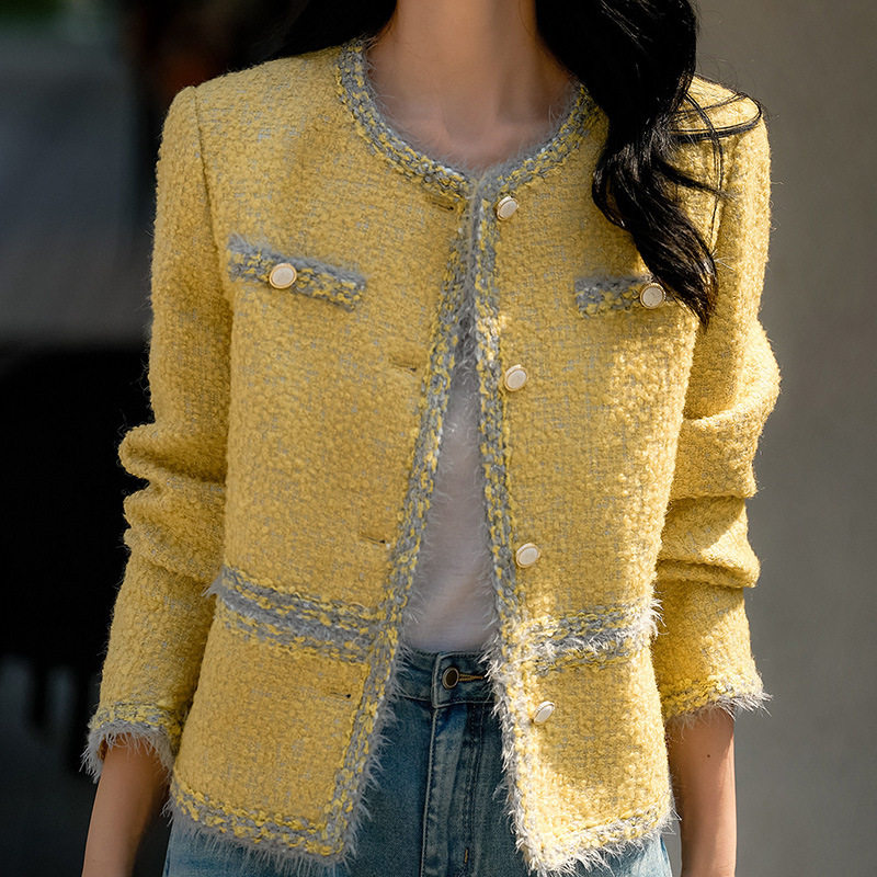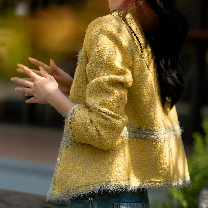 --------------------- 【乳酪芝士】春秋新款羊毛马海毛圆领小香风粗花呢黄色短外套女 【原售价】418元 【现售价】367元 【推荐理由】