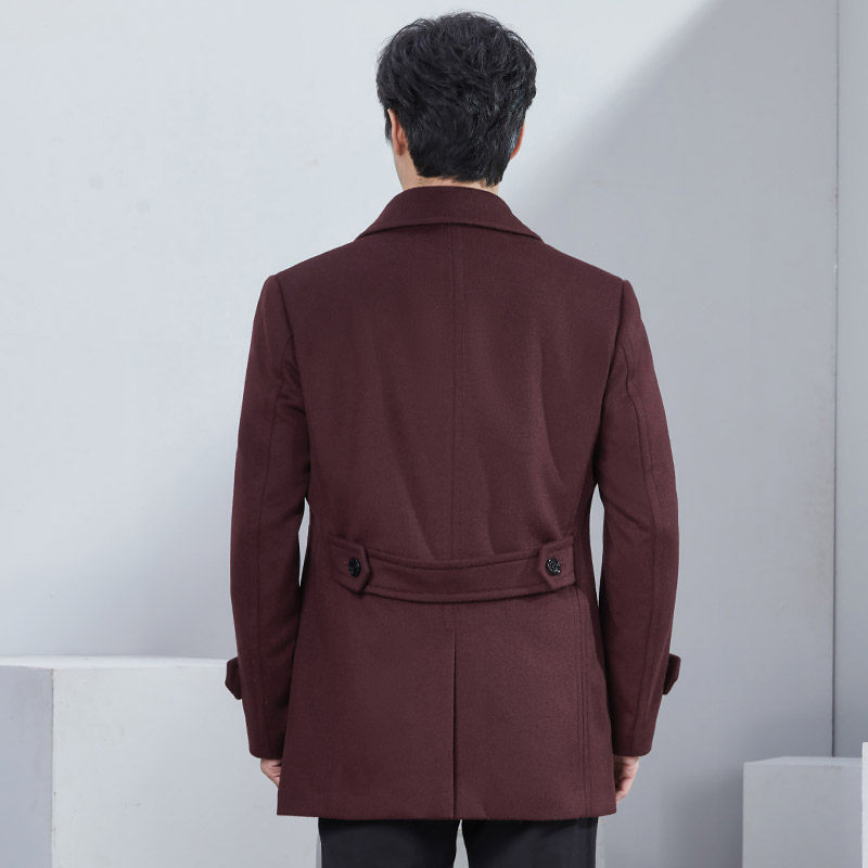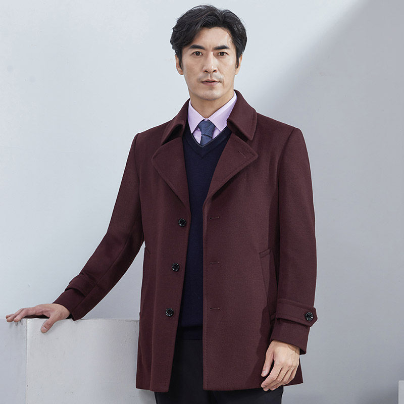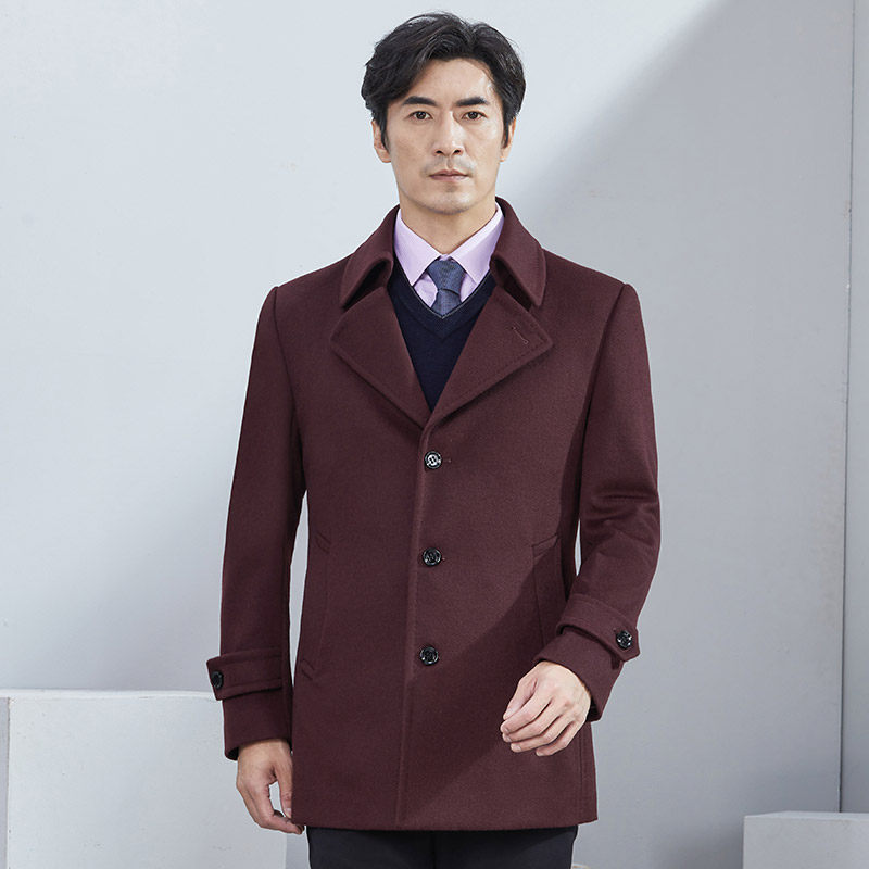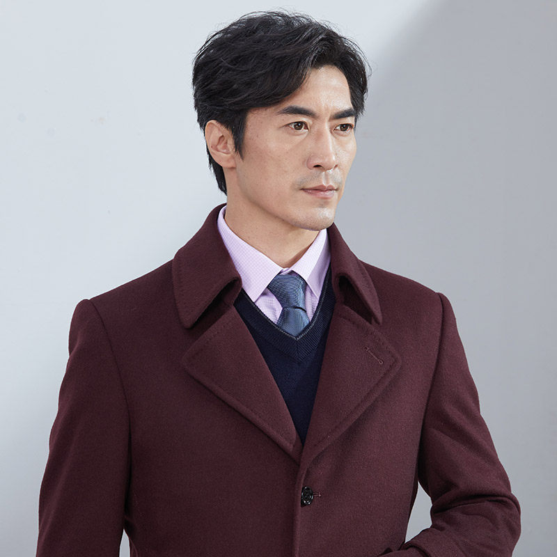 红都新款羊毛大衣中长款系扣时尚修身西服领爸爸羊毛外套