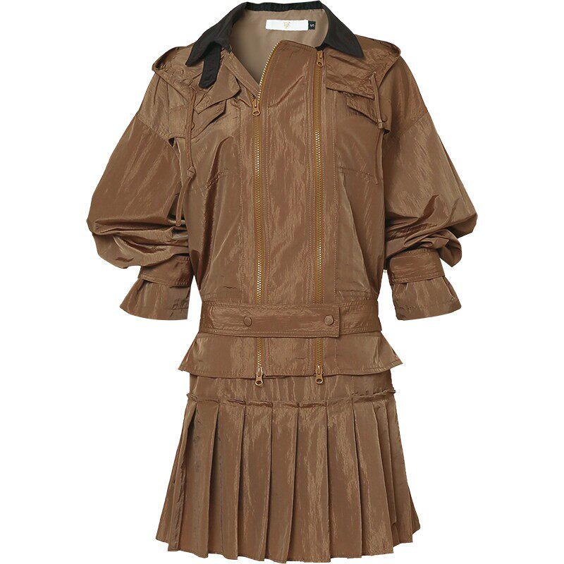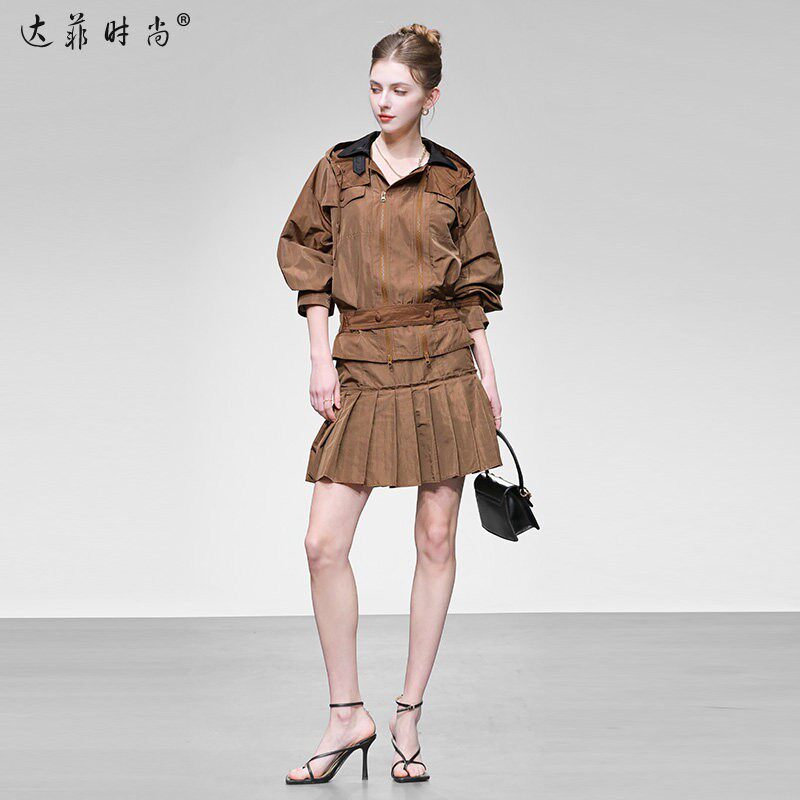 淘宝2026春季新款复古美拉德拼色连帽风衣外套+高腰百褶A字短裙套装女