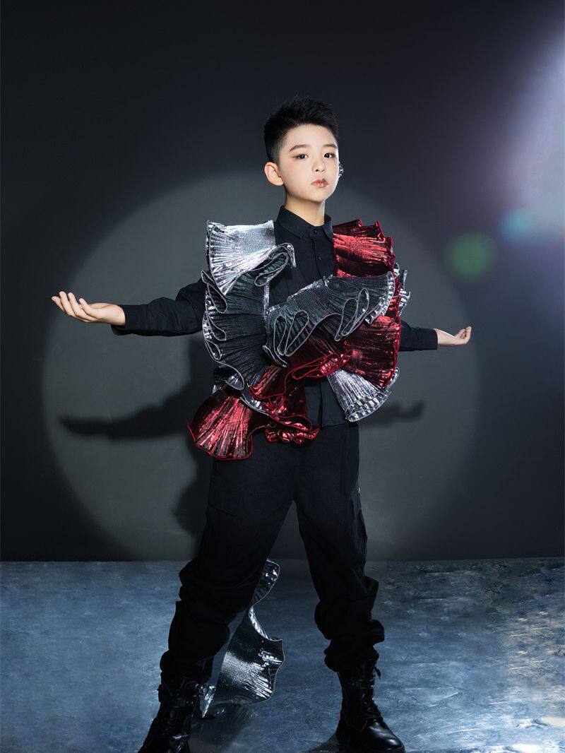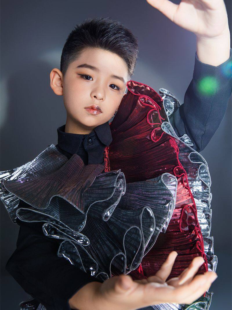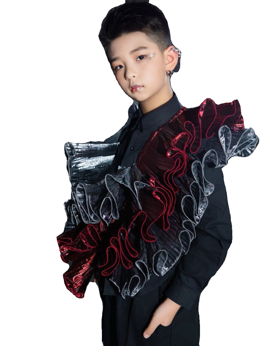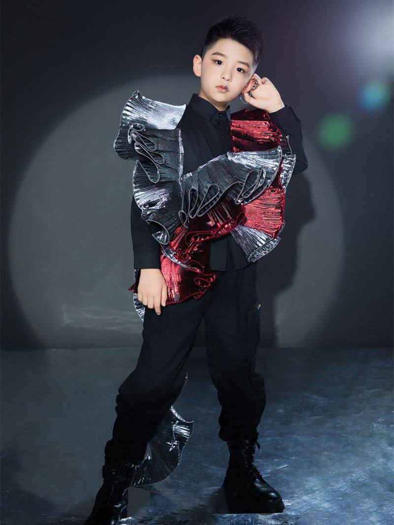 多巴胺男童木耳边衬衫套装表演服潮服走秀服儿童酷帅风机车服童装
