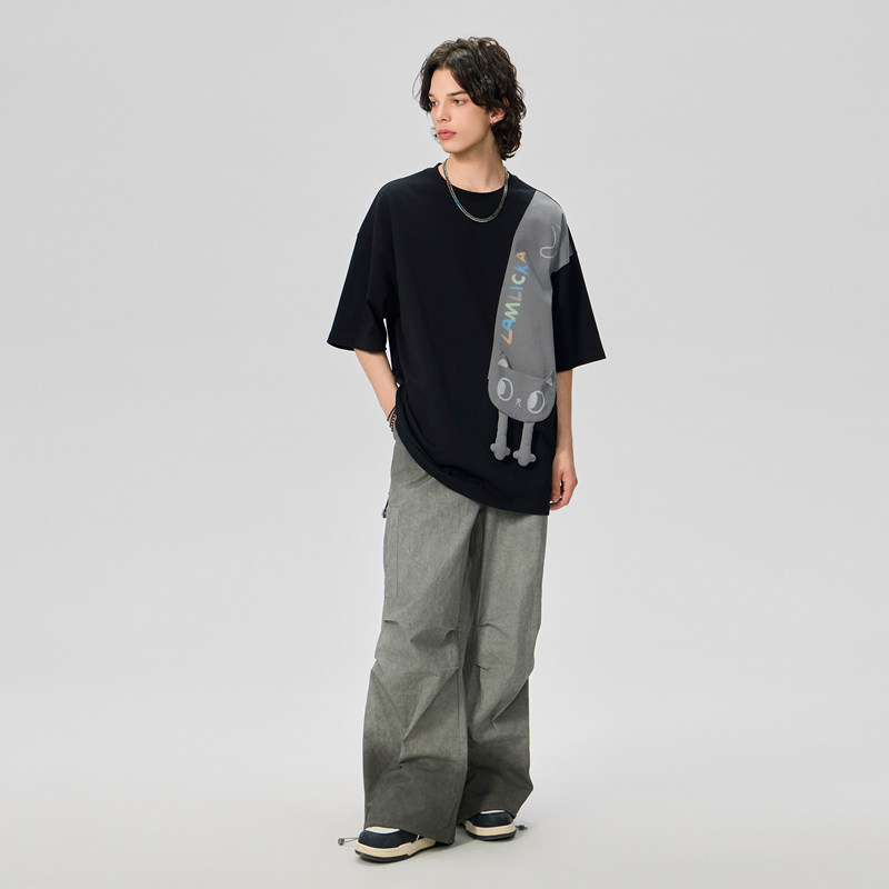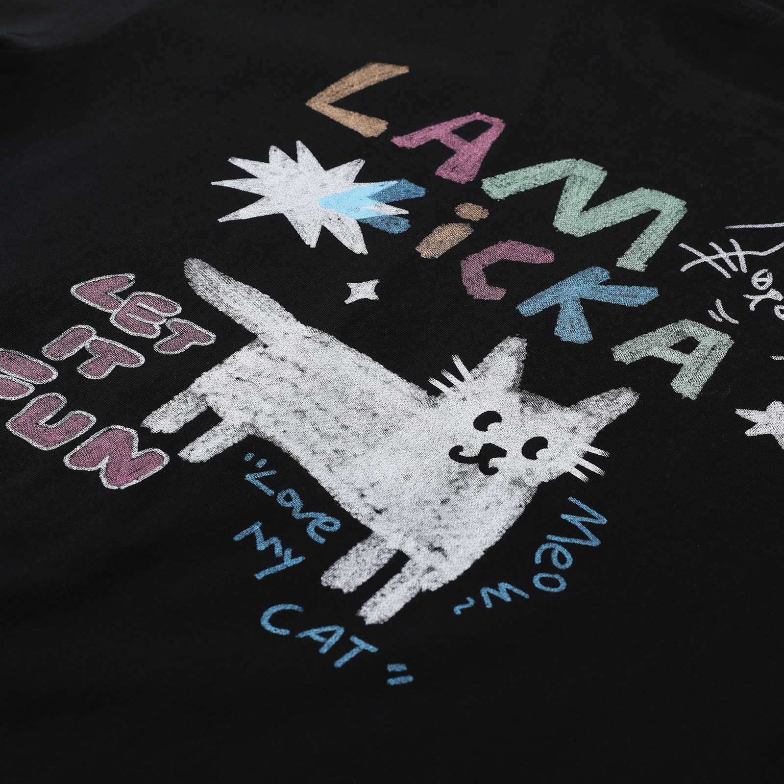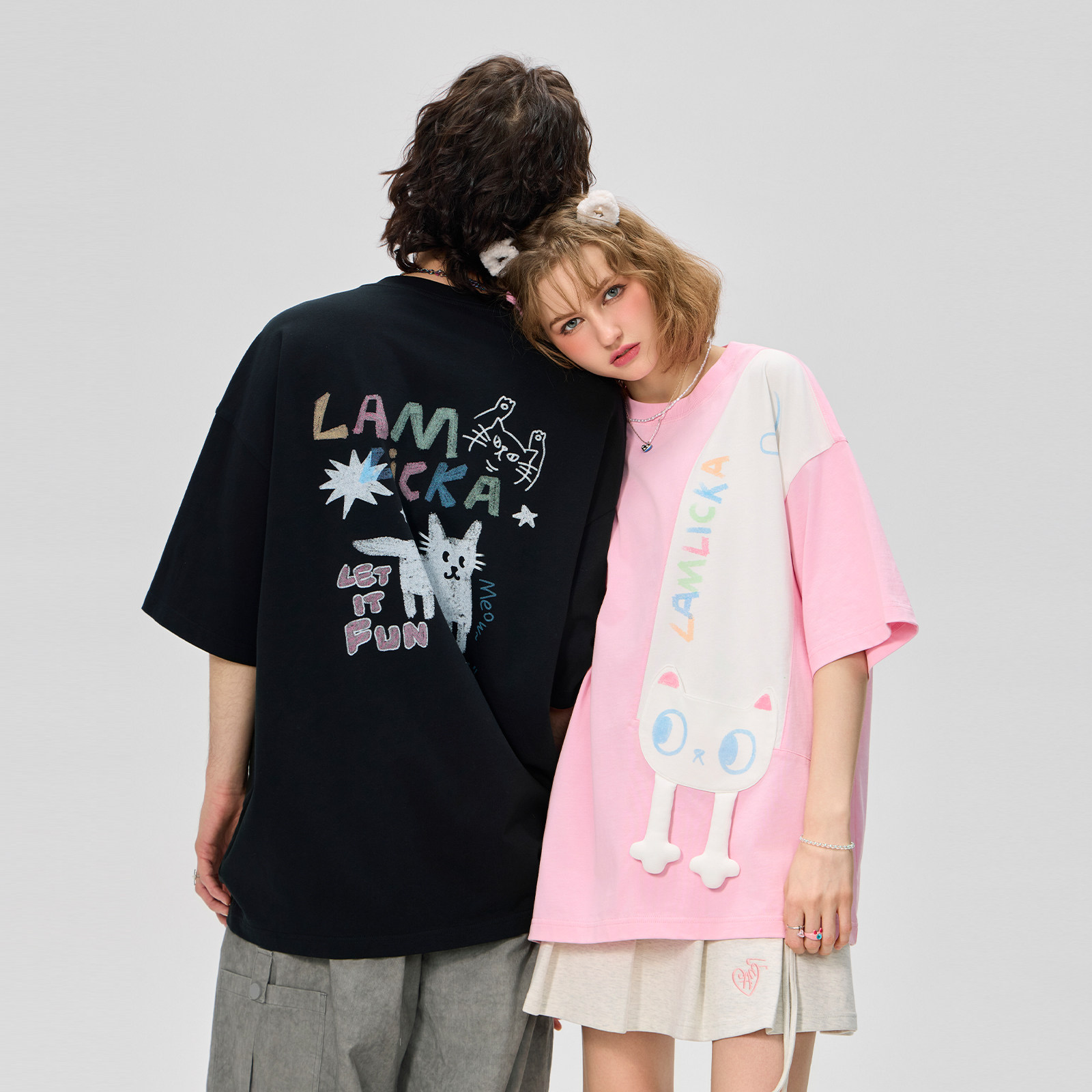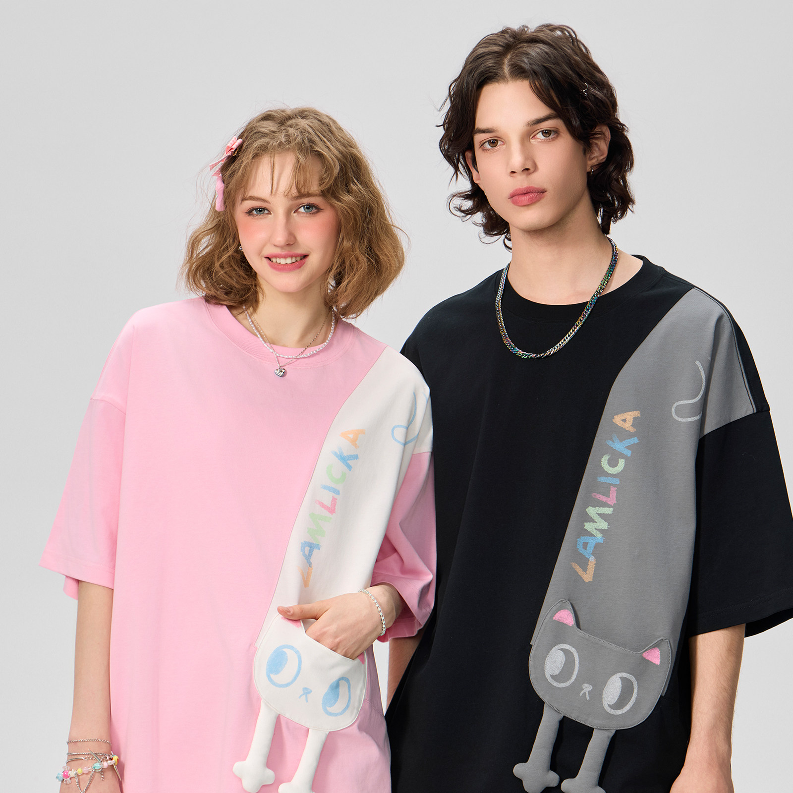 LAMLICKA口袋小猫短袖女t恤夏季潮牌多巴胺宽松圆领短袖黑色男款