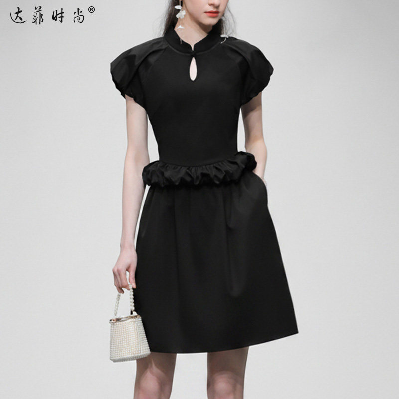 2026夏季新款时尚气质国潮立领泡泡袖收腰大摆短款黑色连衣裙女装
