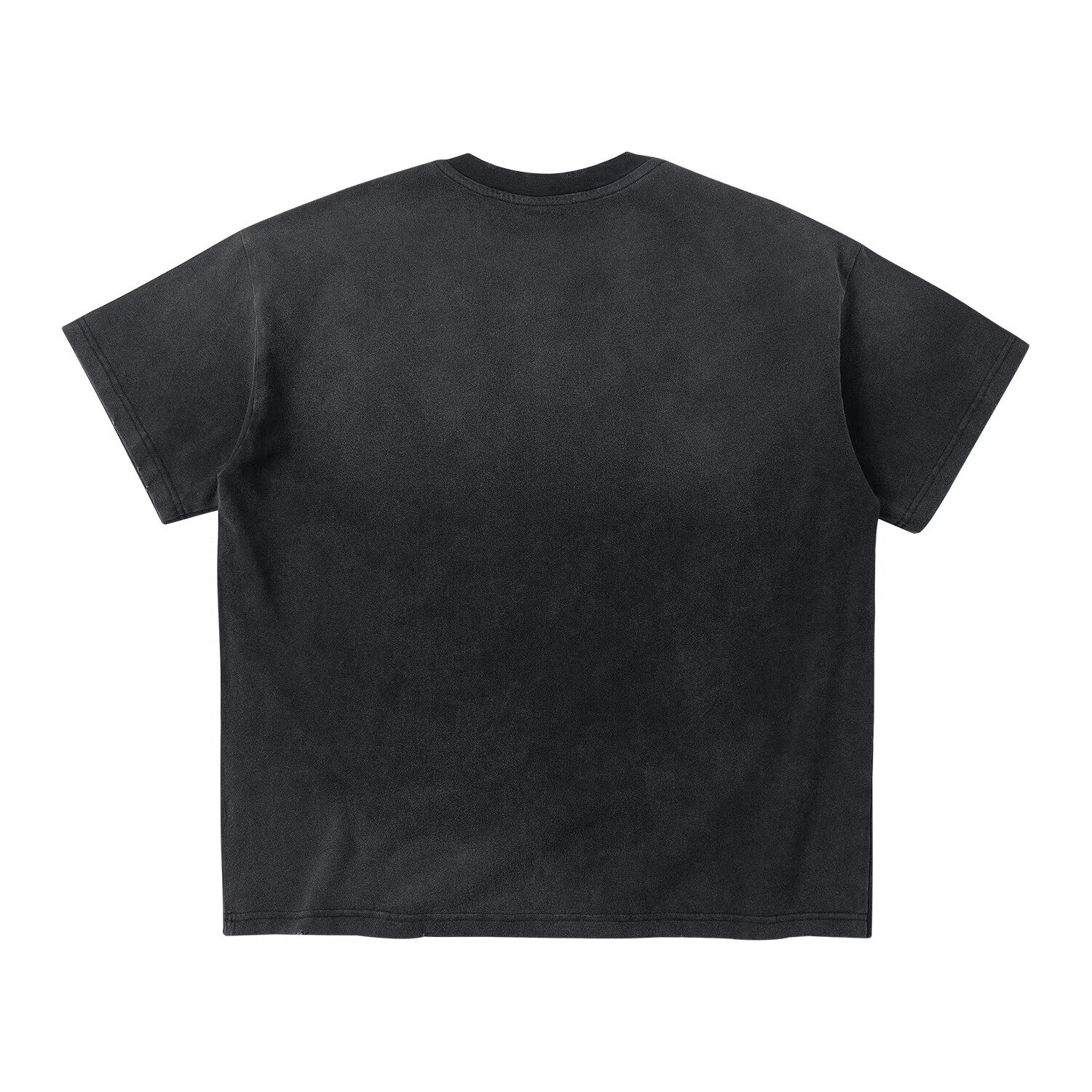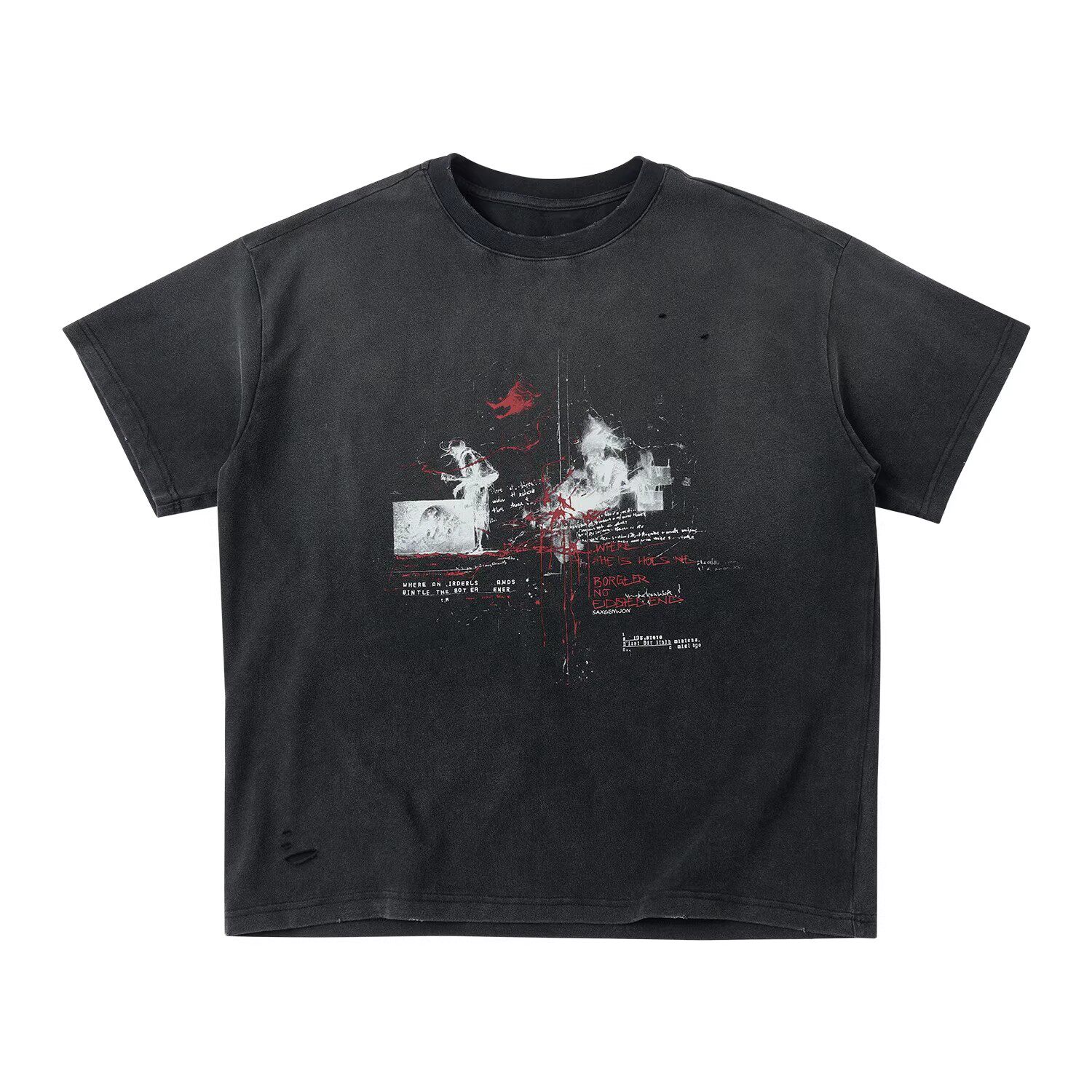 SAXGENWON「恶魔低语」水洗自然做旧街头印花圆领短宽版型短袖T恤