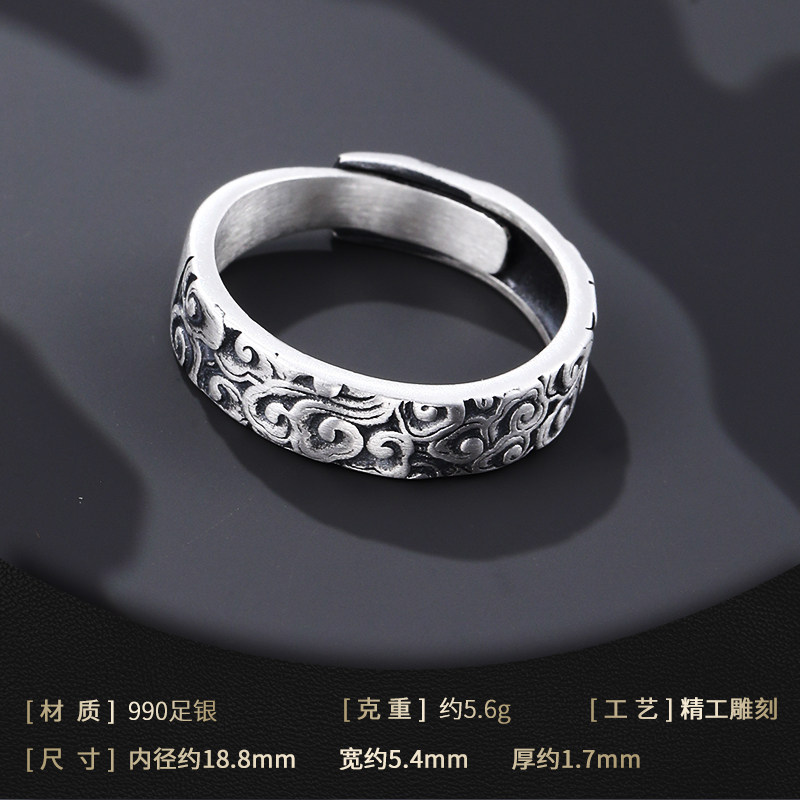 老银匠s990足银男戒祥云复古民族风新国潮开口做旧纯银戒指银指环