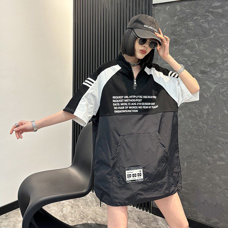 加大码女装立领拉链拼接撞色短袖胖妹妹2024春秋新款百搭休闲上衣