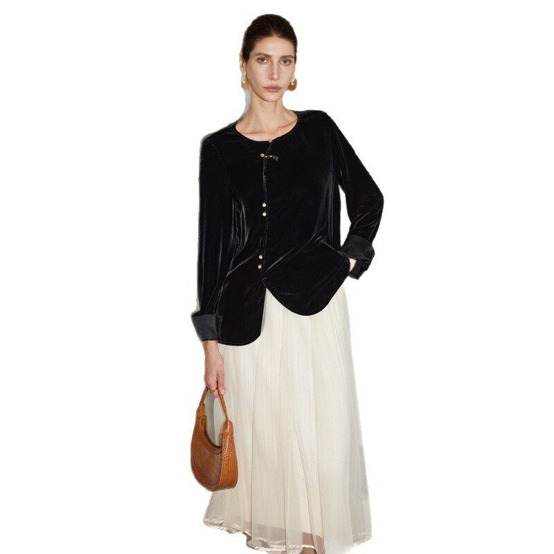 真丝丝绒上衣女2026秋冬外穿圆领新中式国风纯色桑蚕丝短外套