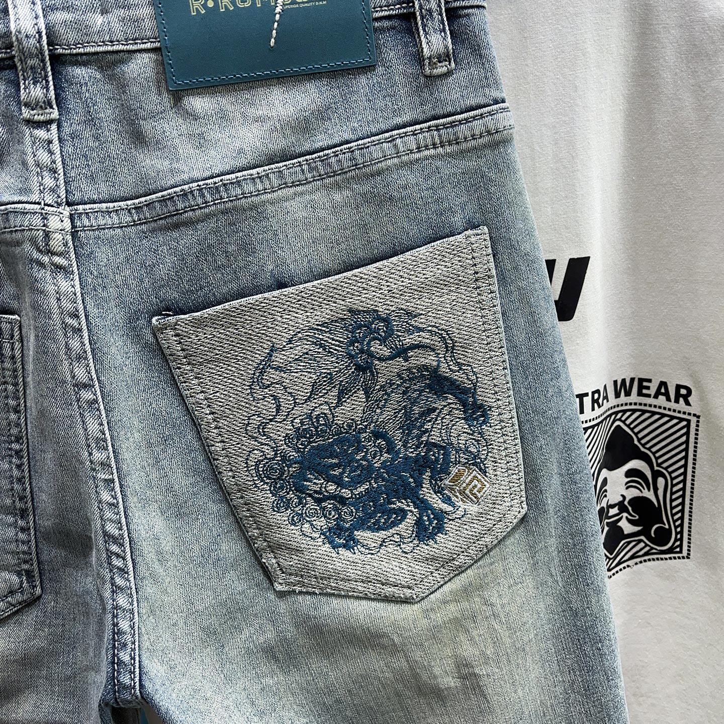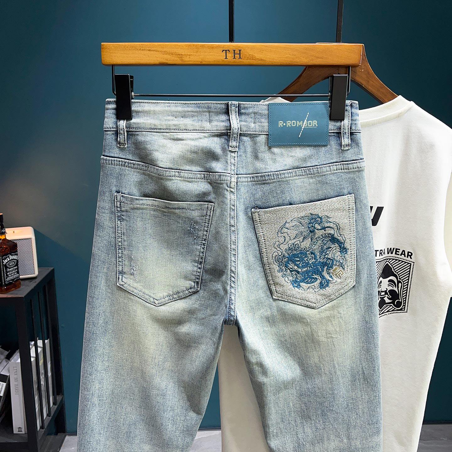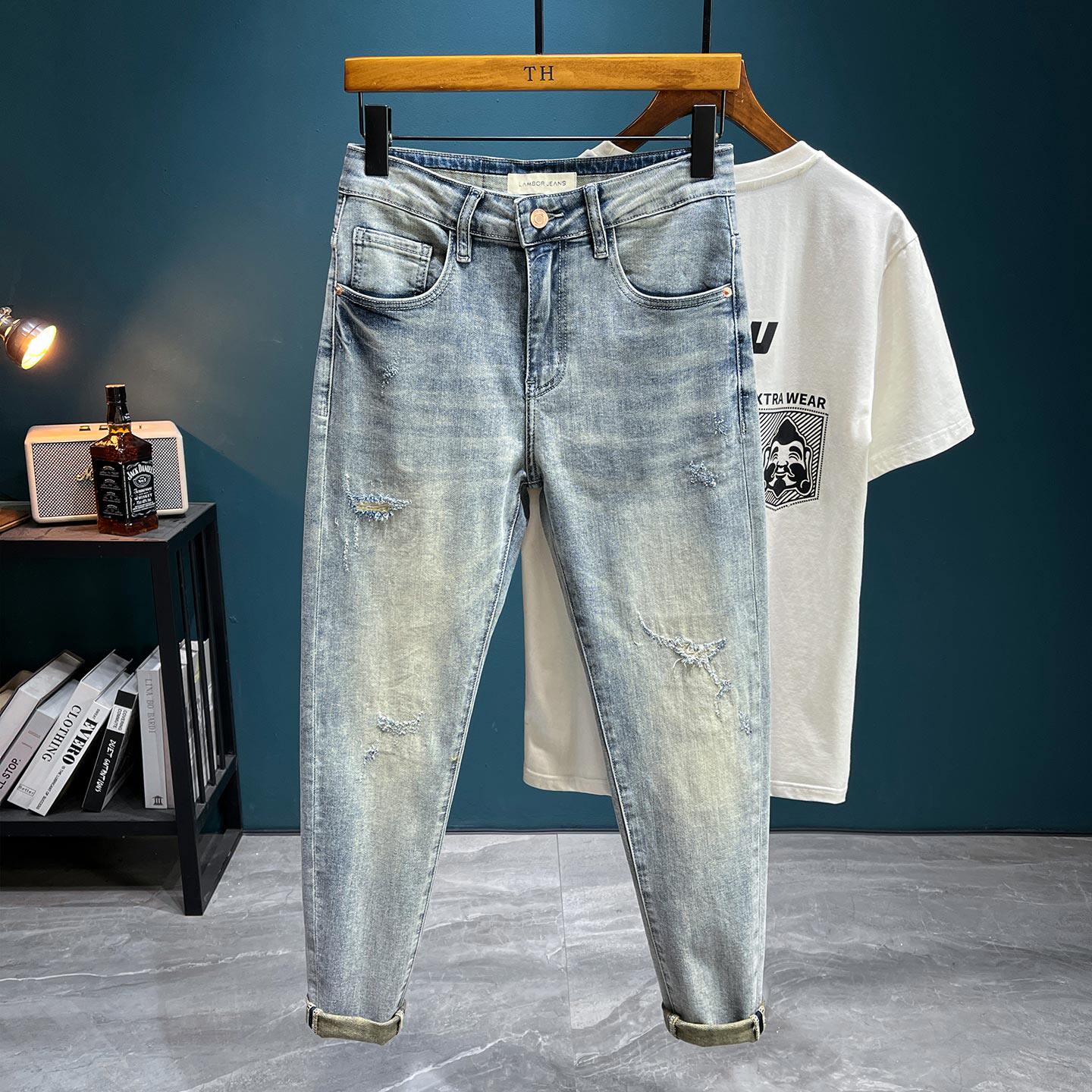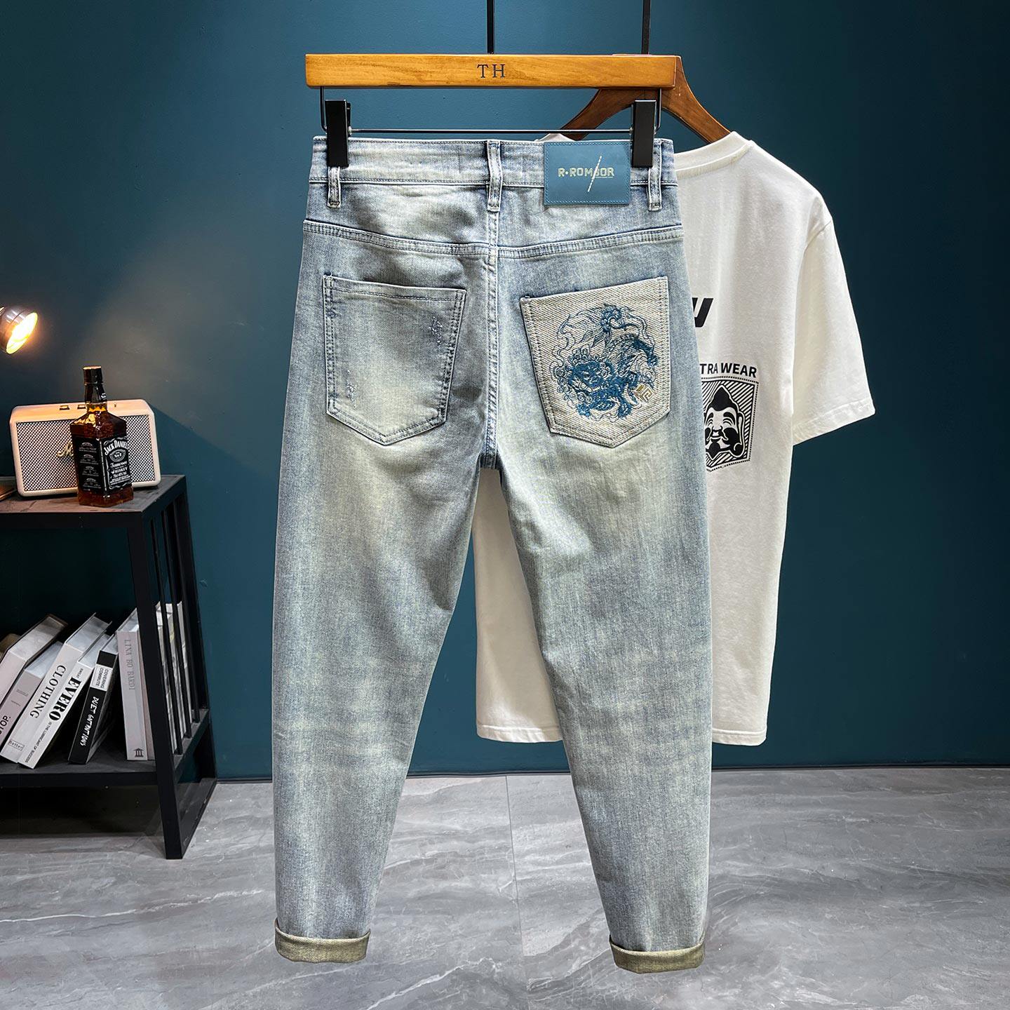 --------------------- 春夏季牛仔裤男款修身小脚刺绣浅色裤子广州新塘水洗做旧破洞长裤 【原售价】119元 【现售价】104元 【推荐理由】