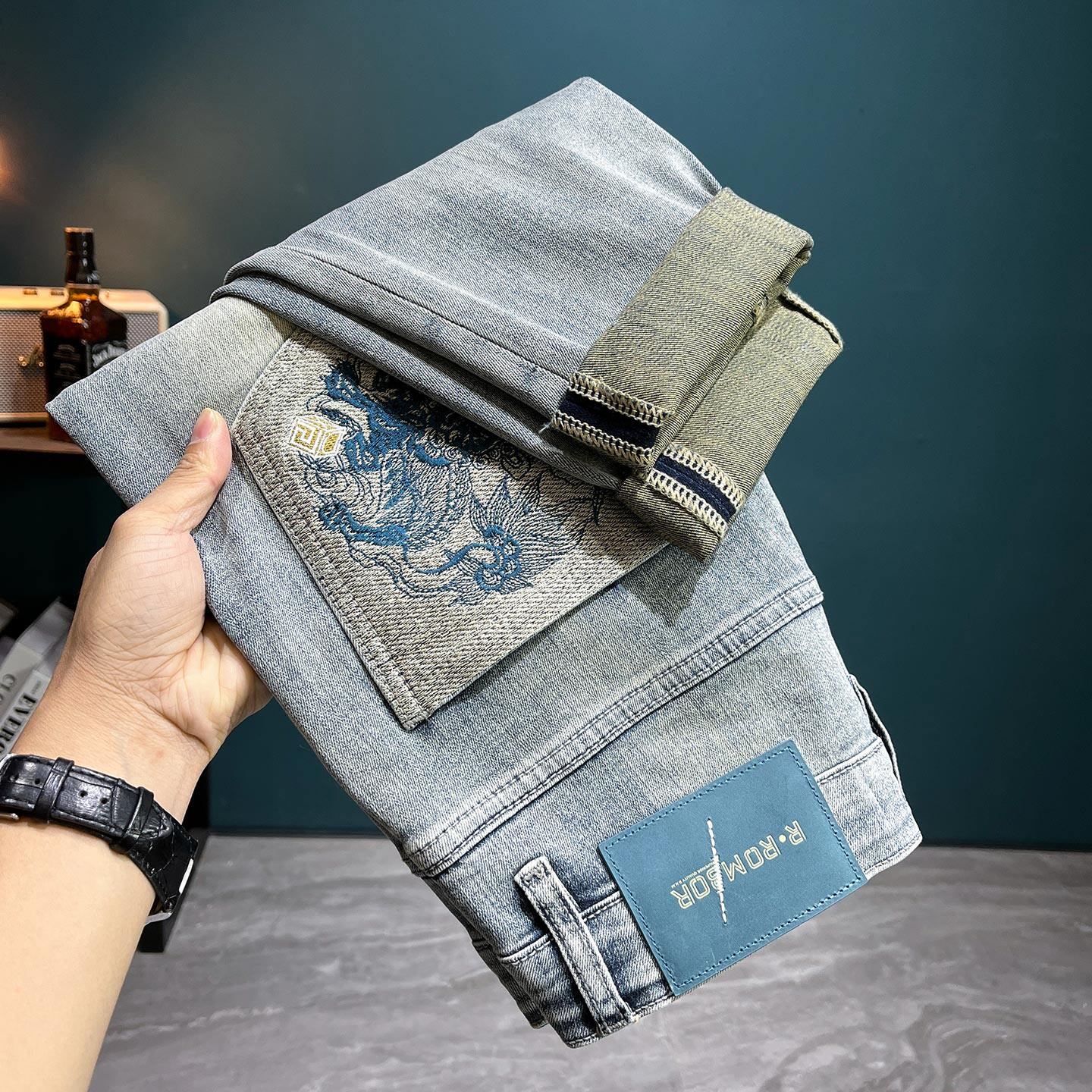 春夏季牛仔裤男款修身小脚刺绣浅色裤子广州新塘水洗做旧破洞长裤