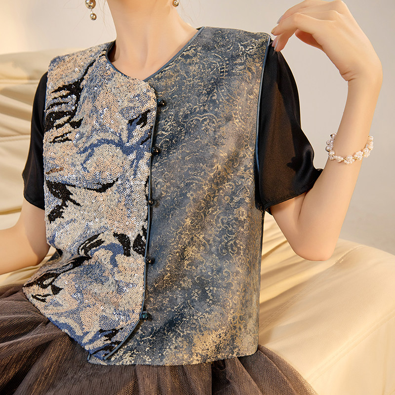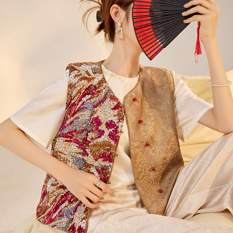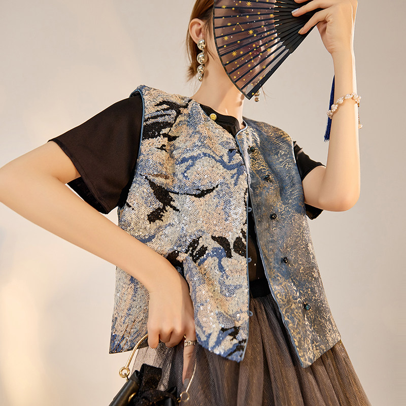 --------------------- 新中式国风版轻奢时尚气质背心亮片刺绣设计感人丝无袖马甲 N3105 【原售价】327元 【现售价】243.95元 【推荐理由】