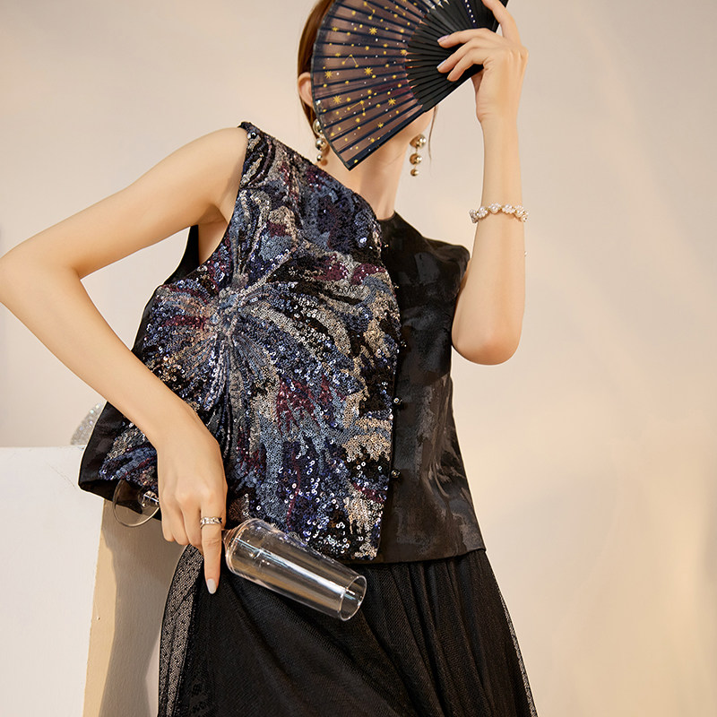 新中式国风版轻奢时尚气质背心亮片刺绣设计感人丝无袖马甲 N3105