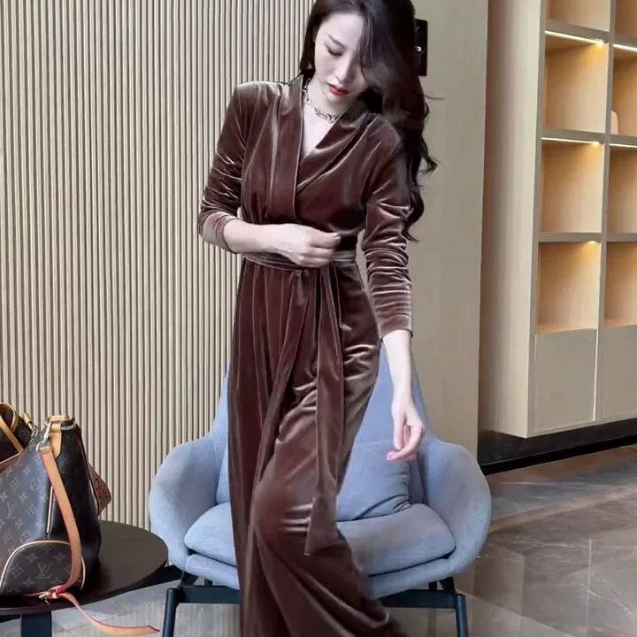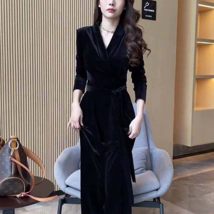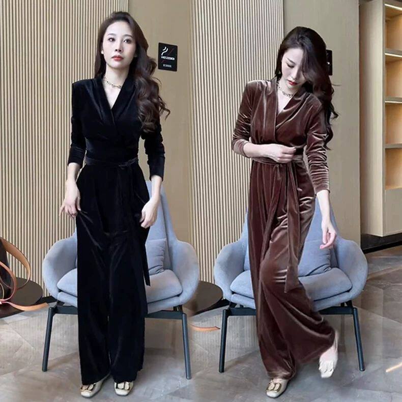 2026早春新款法式轻熟风金丝绒v领长袖上衣连体裤套装女时尚百搭