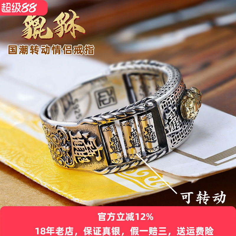 淘宝原创设计路路款霸气貔貅戒指纯银男士复古转动珠戒子情侣潮人个性