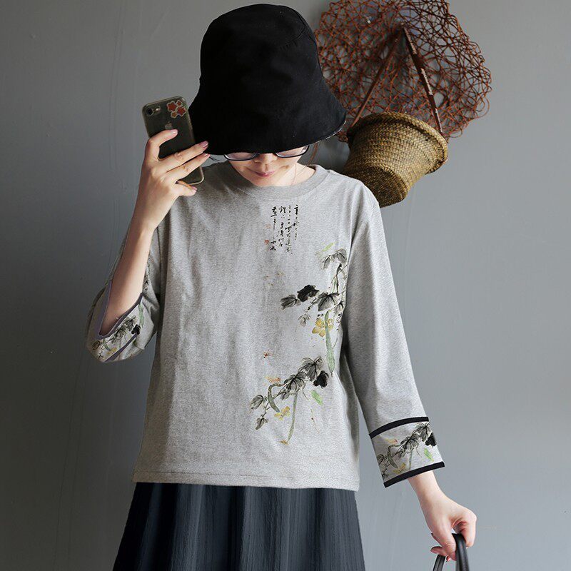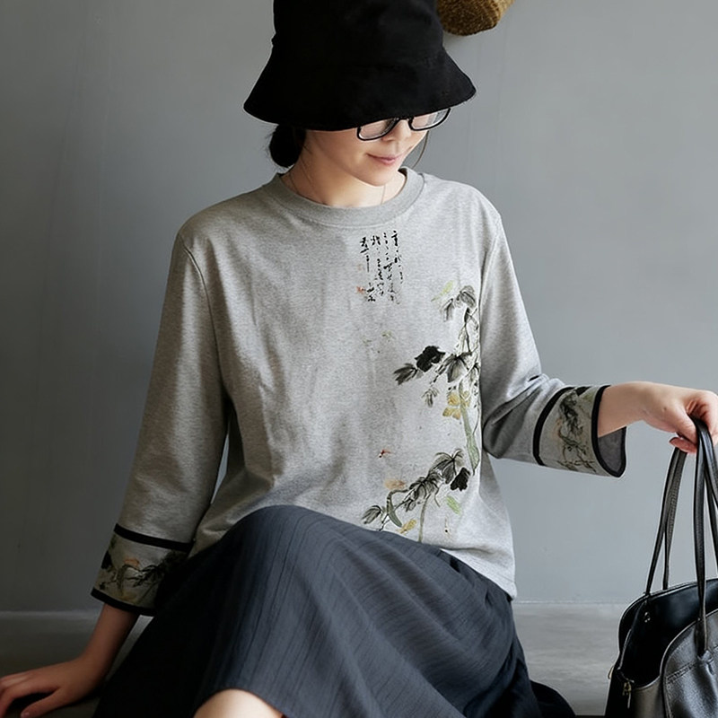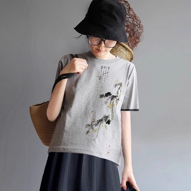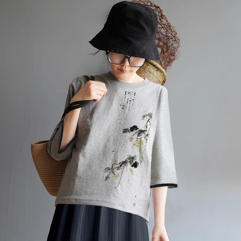 水墨沐暖100%棉手绘国画打底衫文艺软糯上衣新中式上衣大码国风