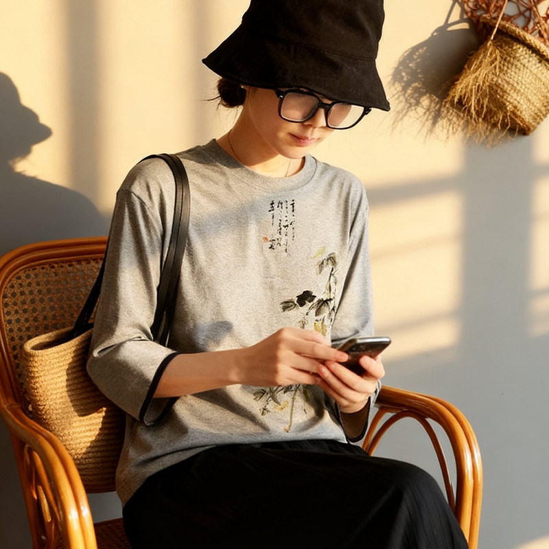 --------------------- 水墨沐暖100%棉手绘国画打底衫文艺软糯上衣新中式上衣大码国风 【原售价】169元 【现售价】152元 【推荐理由】