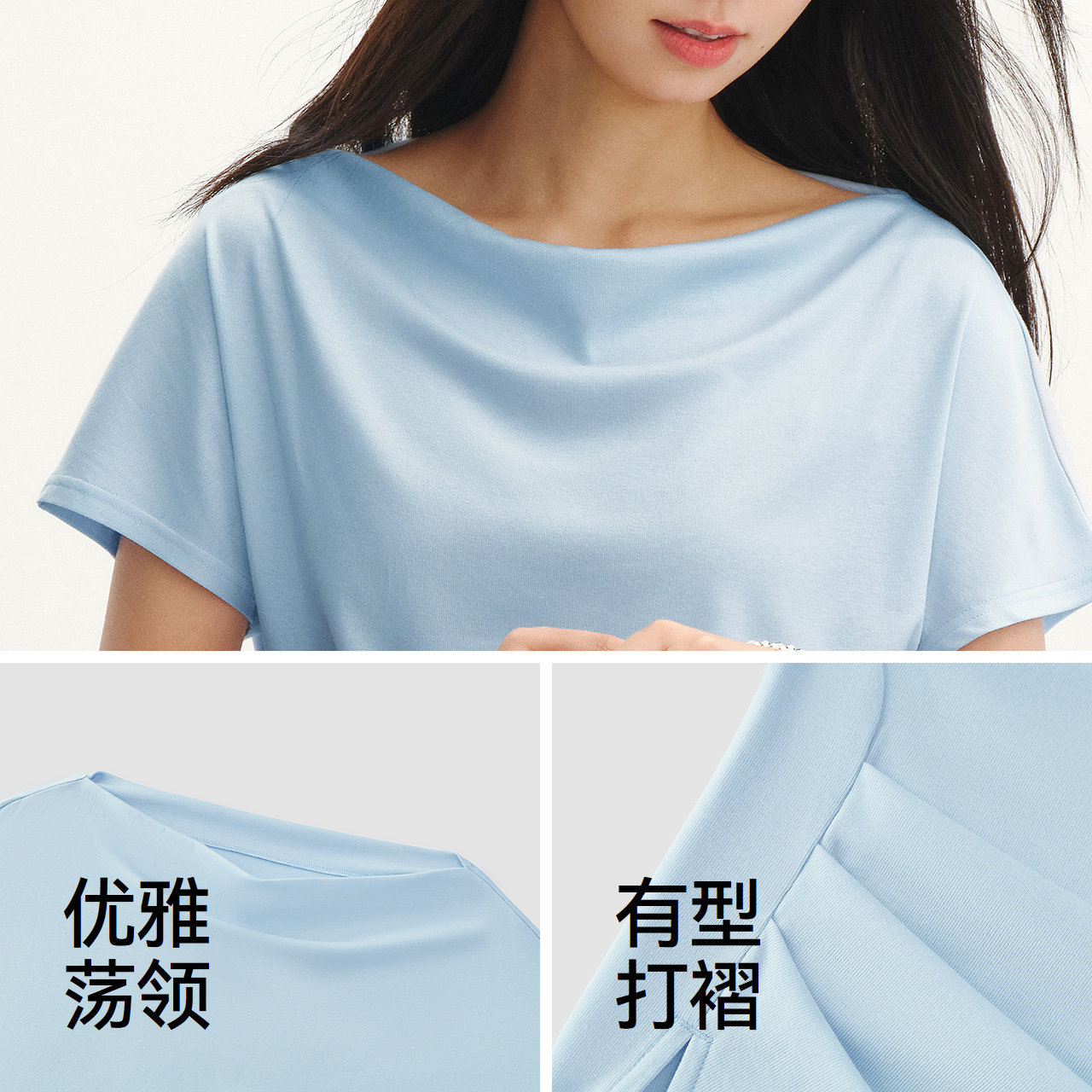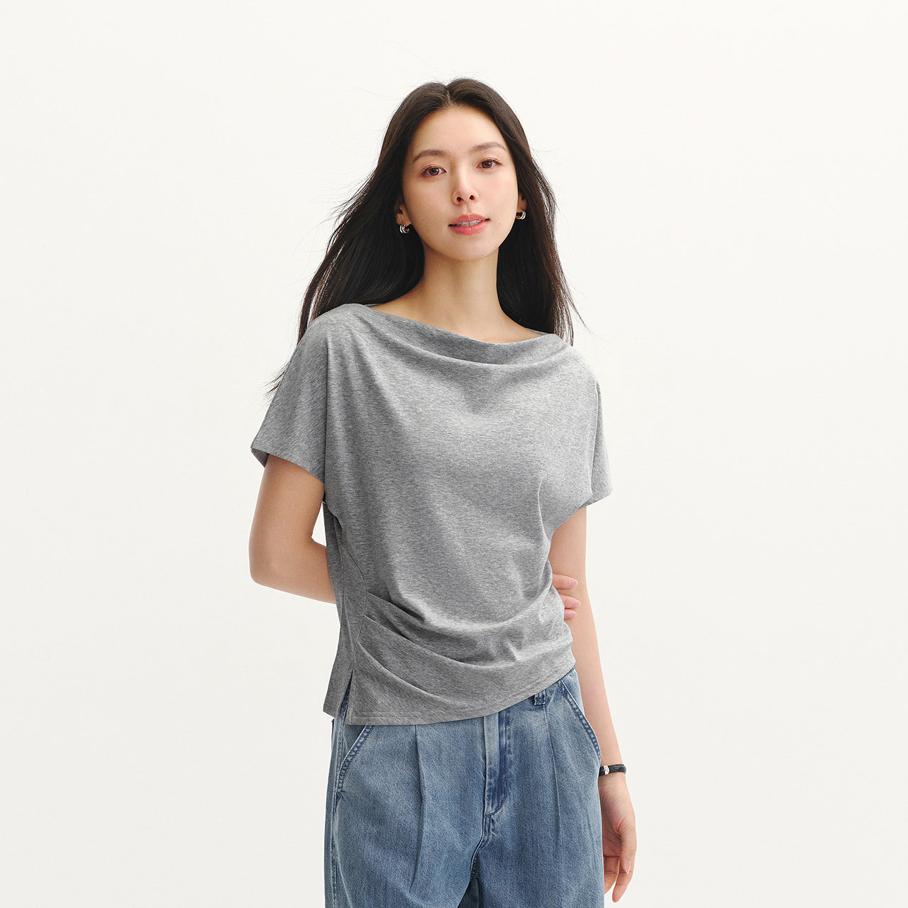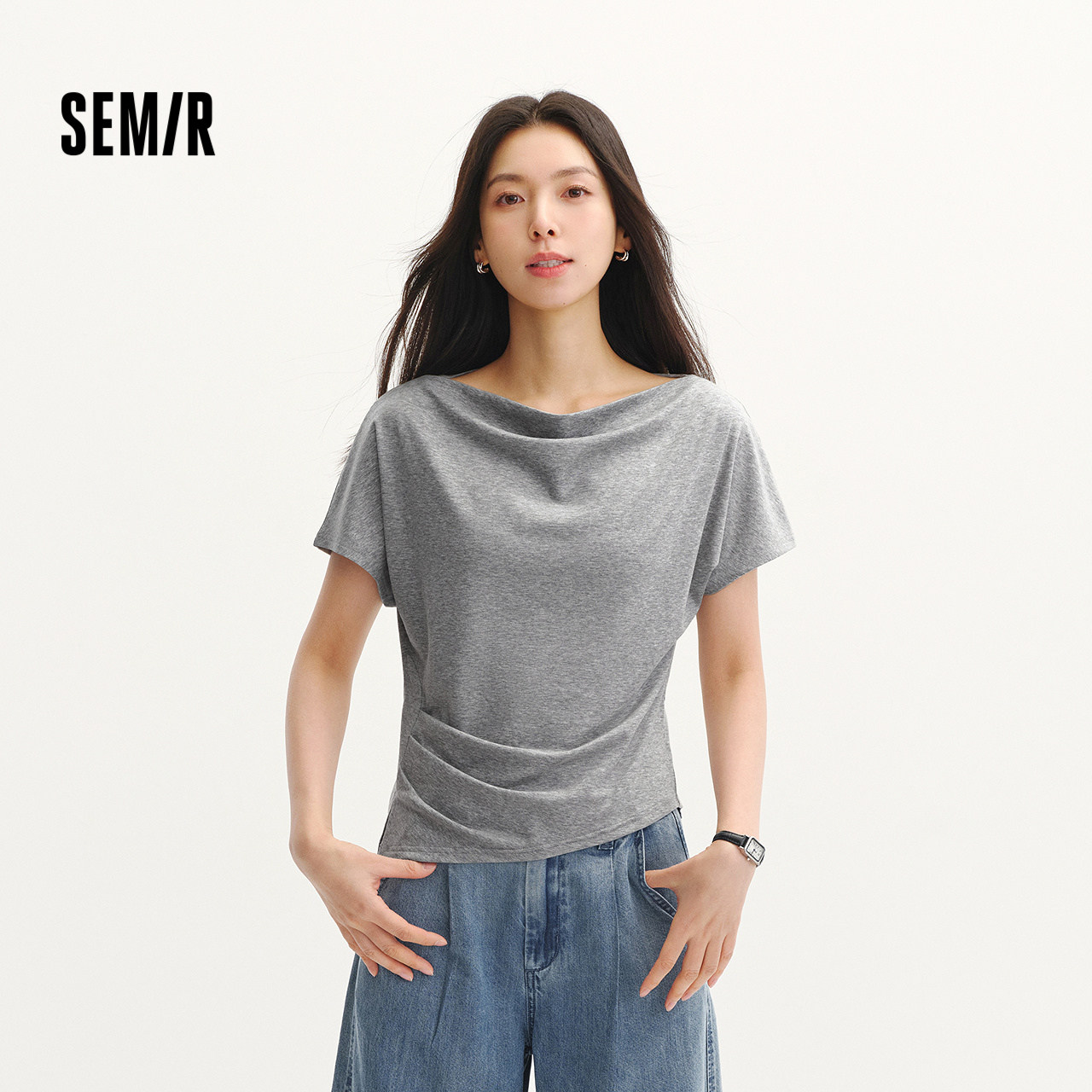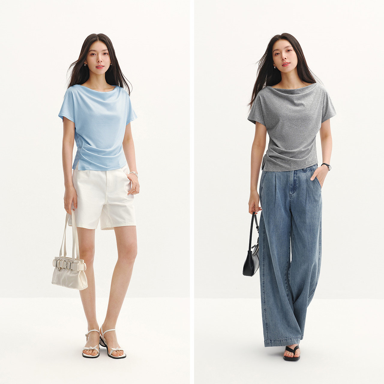 --------------------- 陈都灵|森马T恤女夏季短款荡领褶皱修身斜肩开叉短袖2026新款上衣 【原售价】99元 【现售价】69元 【推荐理由】