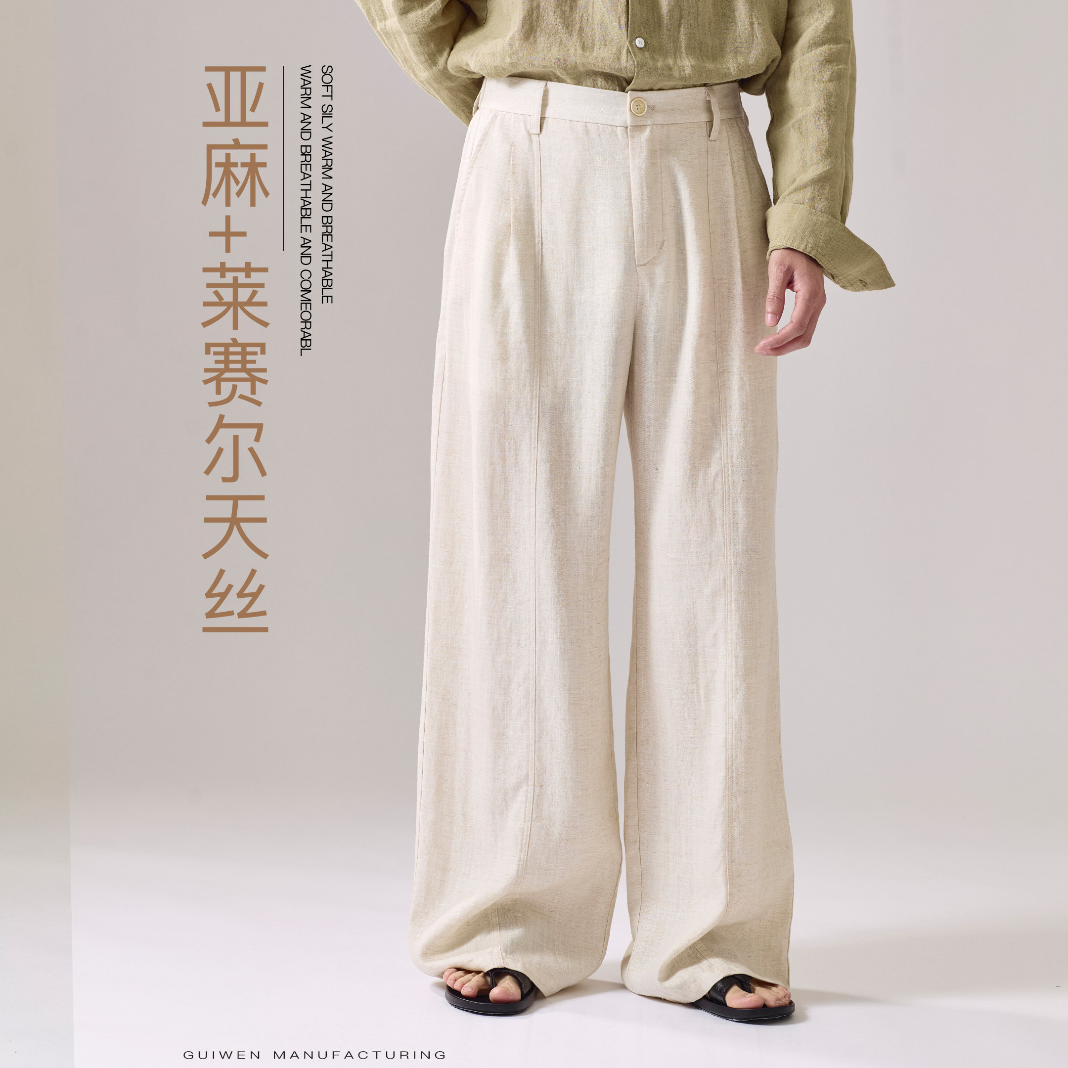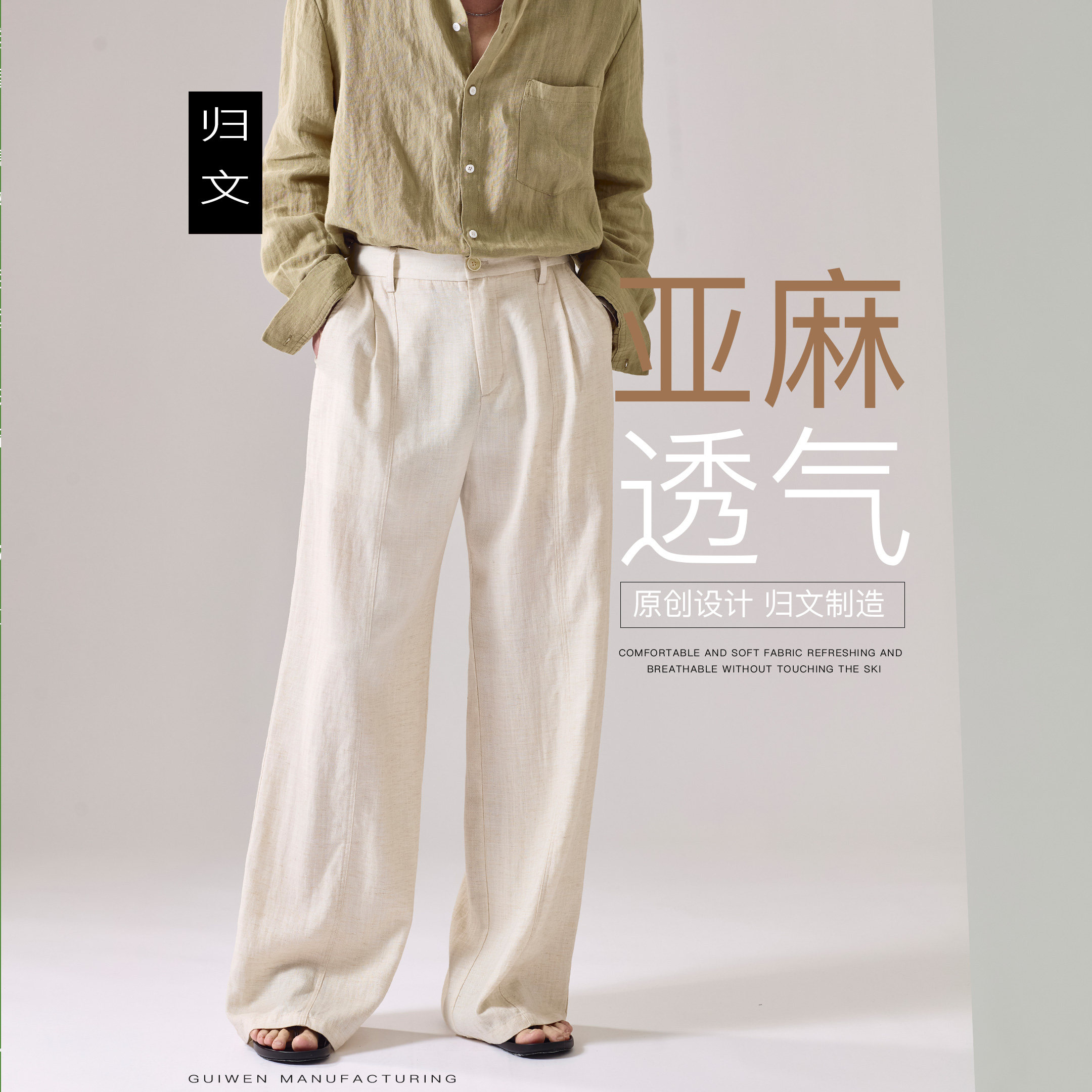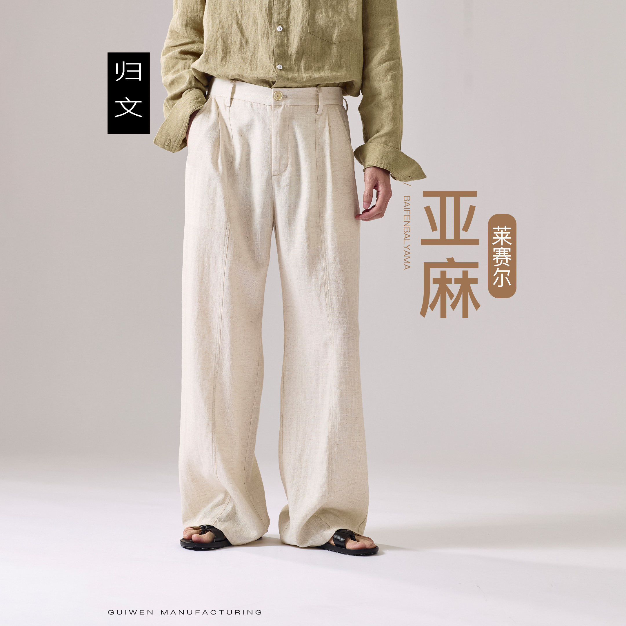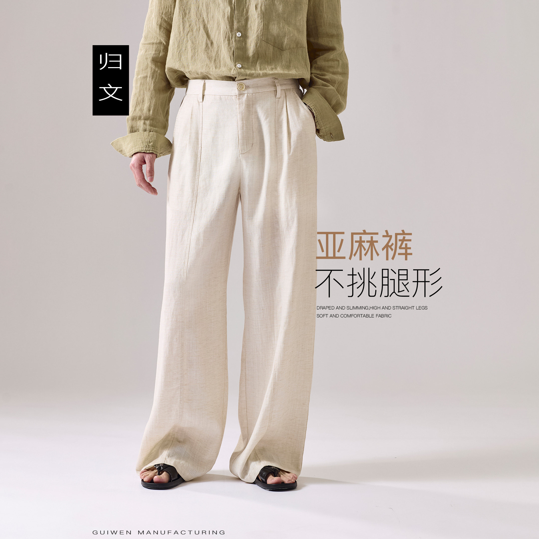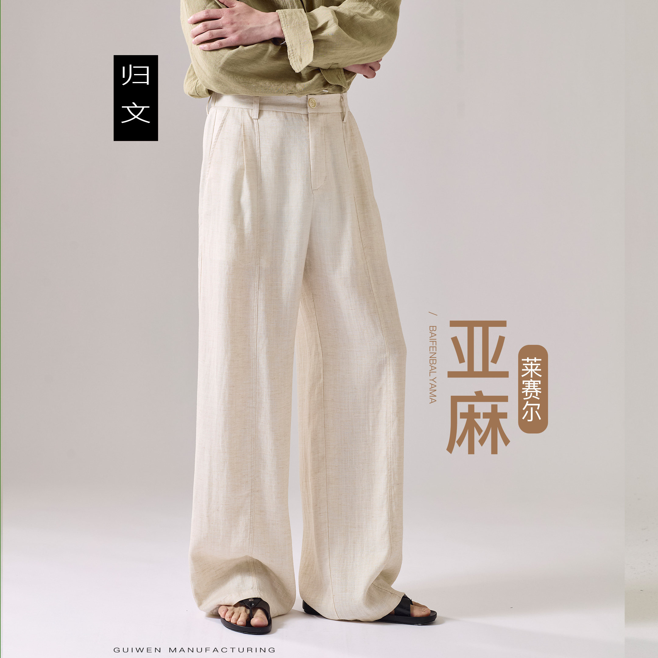 淘宝老钱风亚麻阔腿裤男宽松高腰休闲长裤透气高级感直筒裤米白色裤子