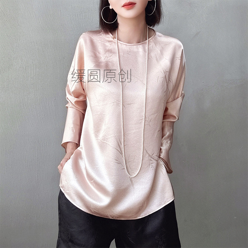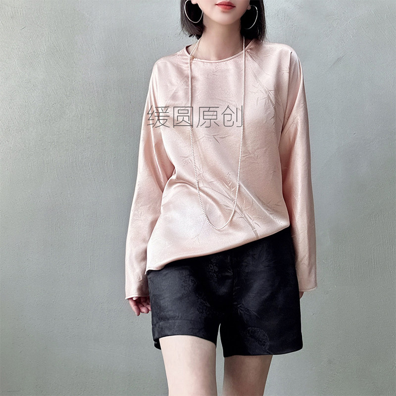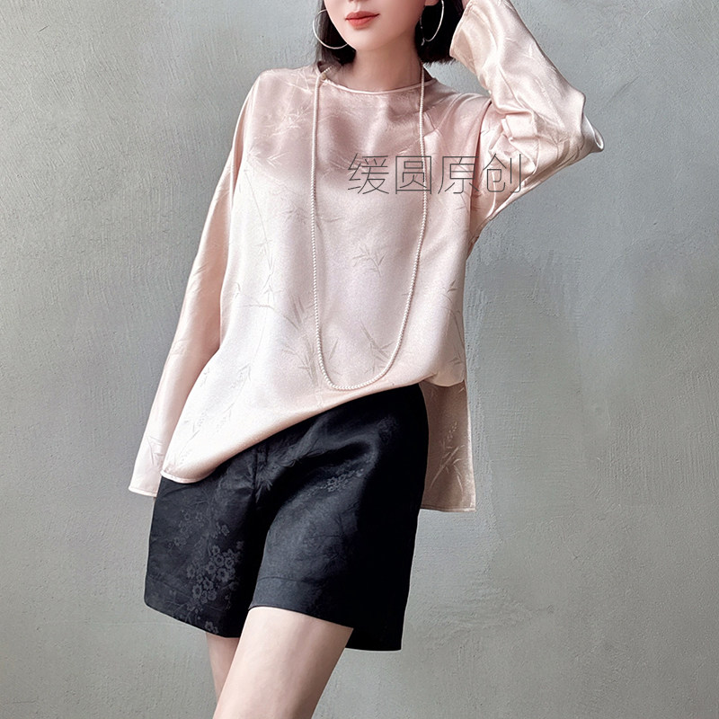 缓圆原创桑蚕丝衬衫女25春夏季竹影金线提花粉色显瘦无领国潮上衣