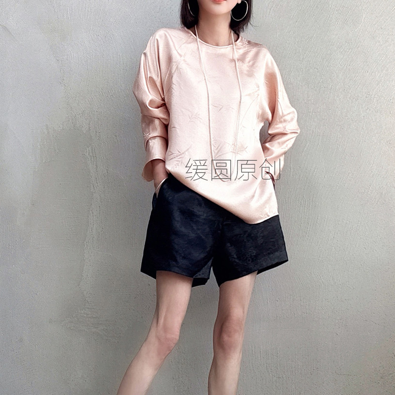 --------------------- 缓圆原创桑蚕丝衬衫女25春夏季竹影金线提花粉色显瘦无领国潮上衣 【原售价】590元 【现售价】519元 【推荐理由】
