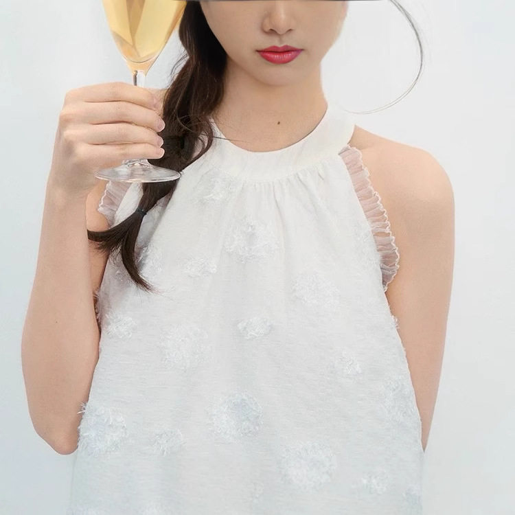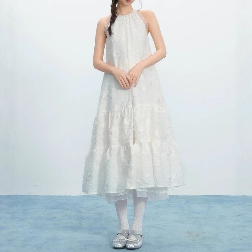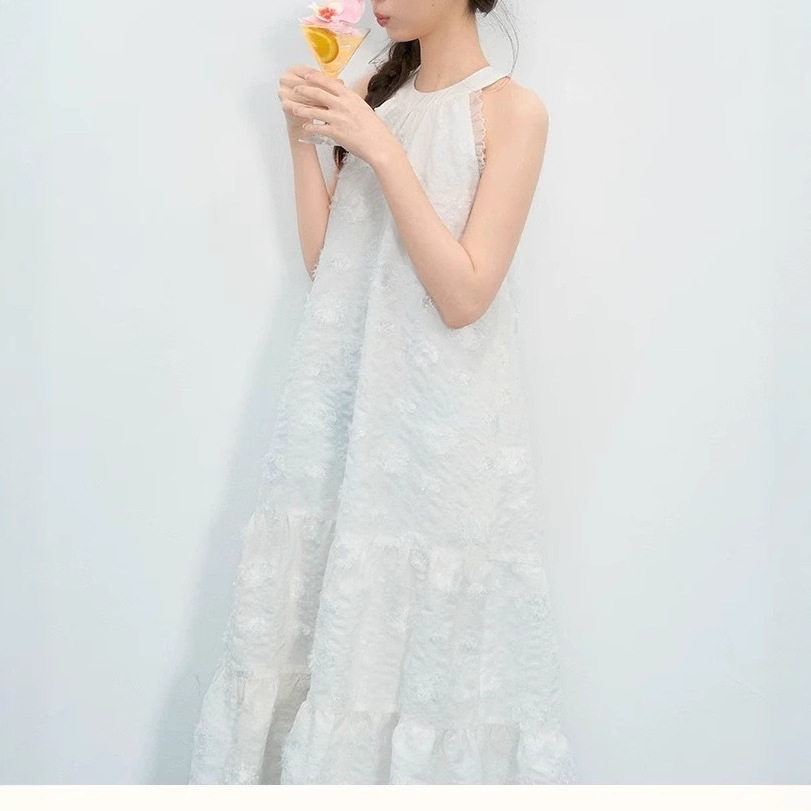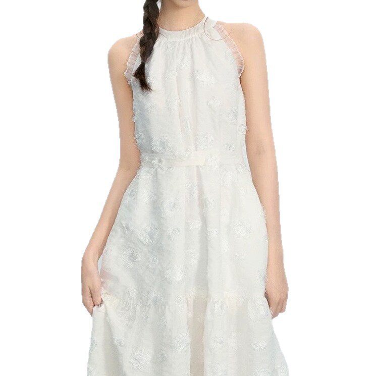 淘宝法式温柔风白色流苏肌理提花挂脖抽皱连衣长裙