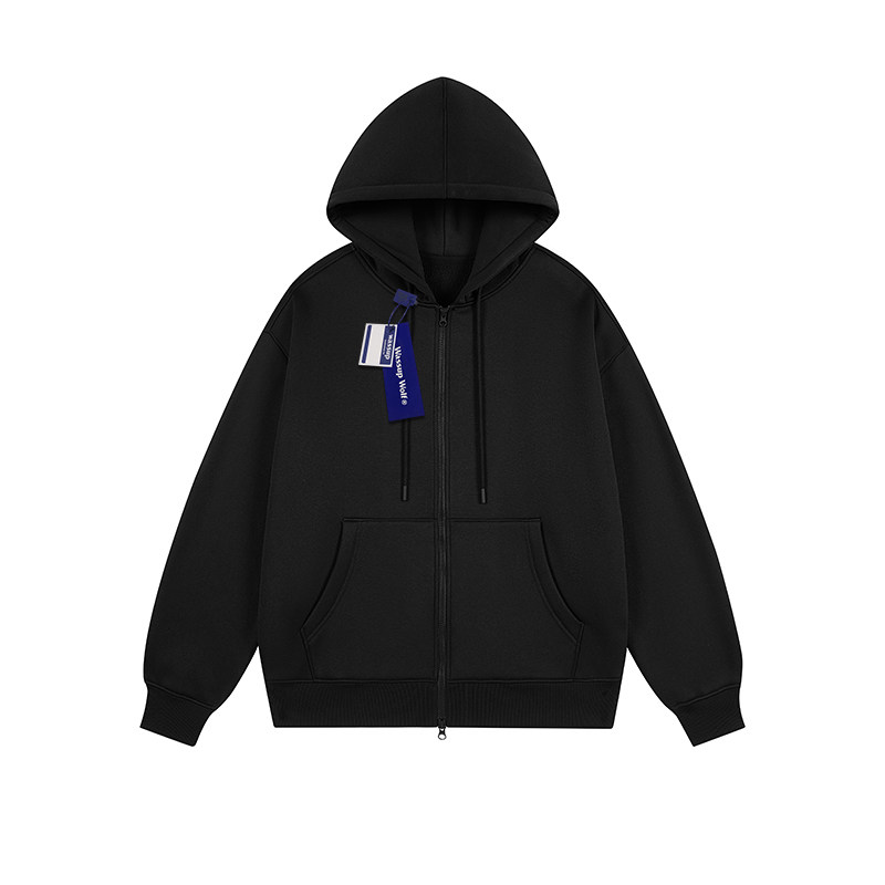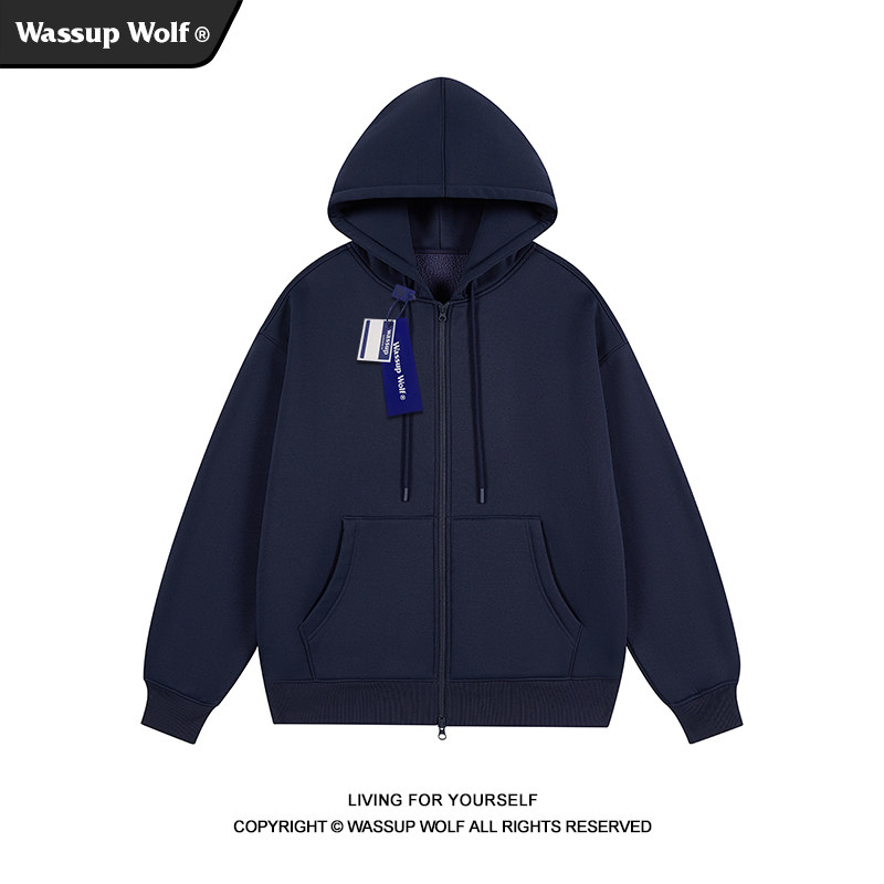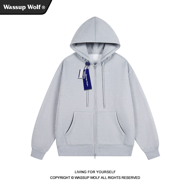 Wassup Wolf运动连帽开衫卫衣男女秋冬加绒美式休闲拉链纯色外套