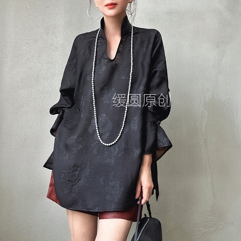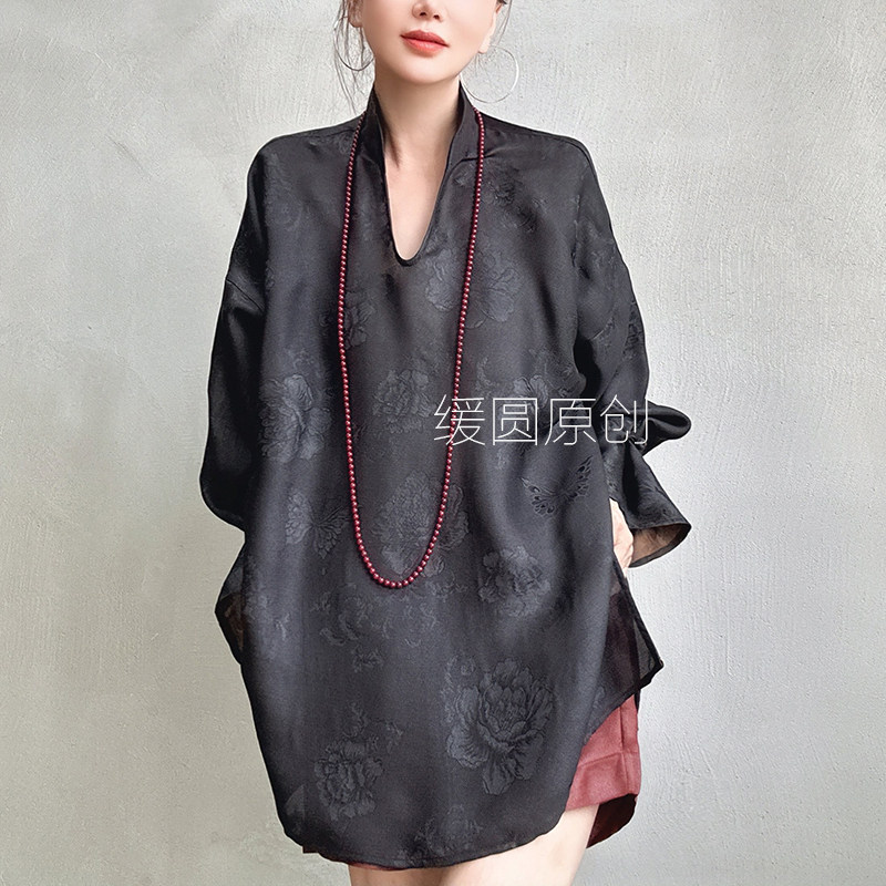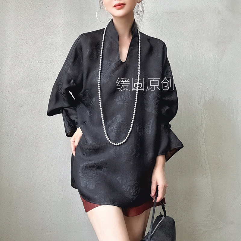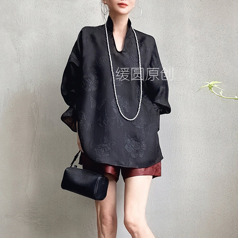 缓圆原创26早春松驰感香云纱透孔罗立V领国风复古提花衬衫女上衣