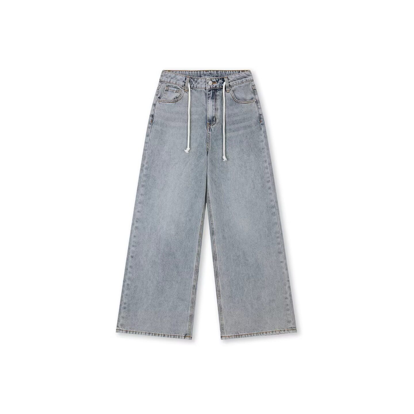 BONELESS抽绳阔腿牛仔裤宽松复古百搭洗水设计感皮牌直筒休闲长裤