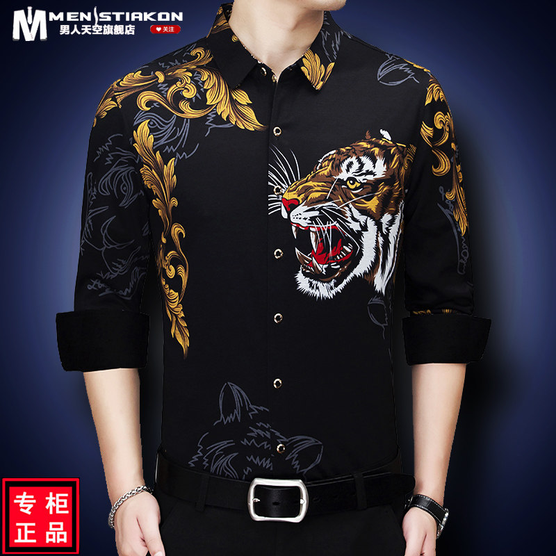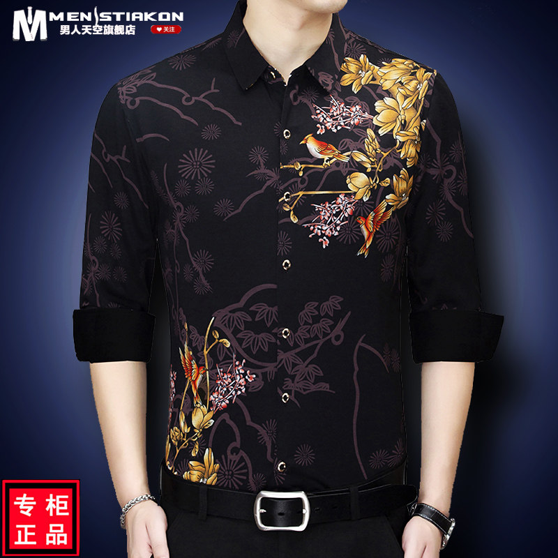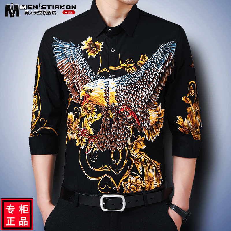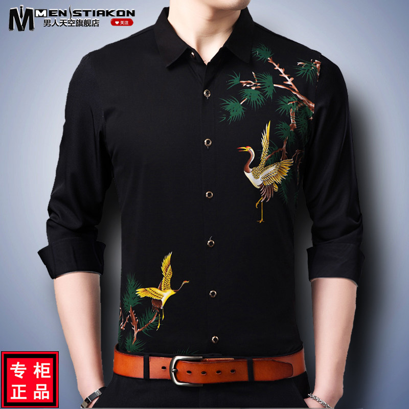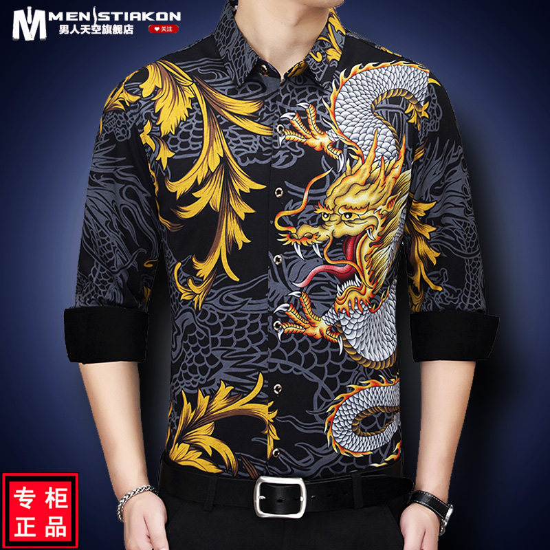 中国风个性印花长袖衬衫男士中青年国潮春季花衬衣男装宽松上衣潮