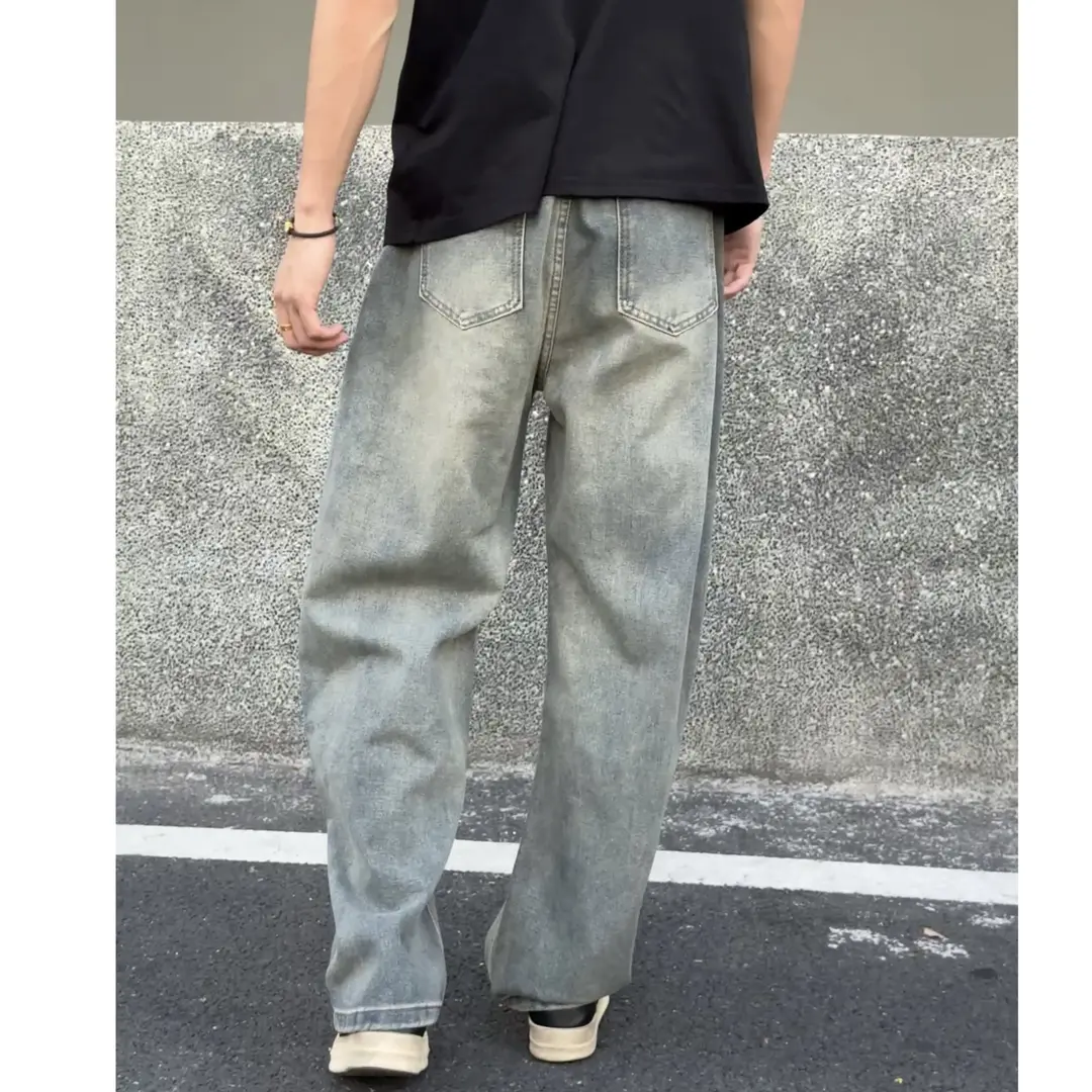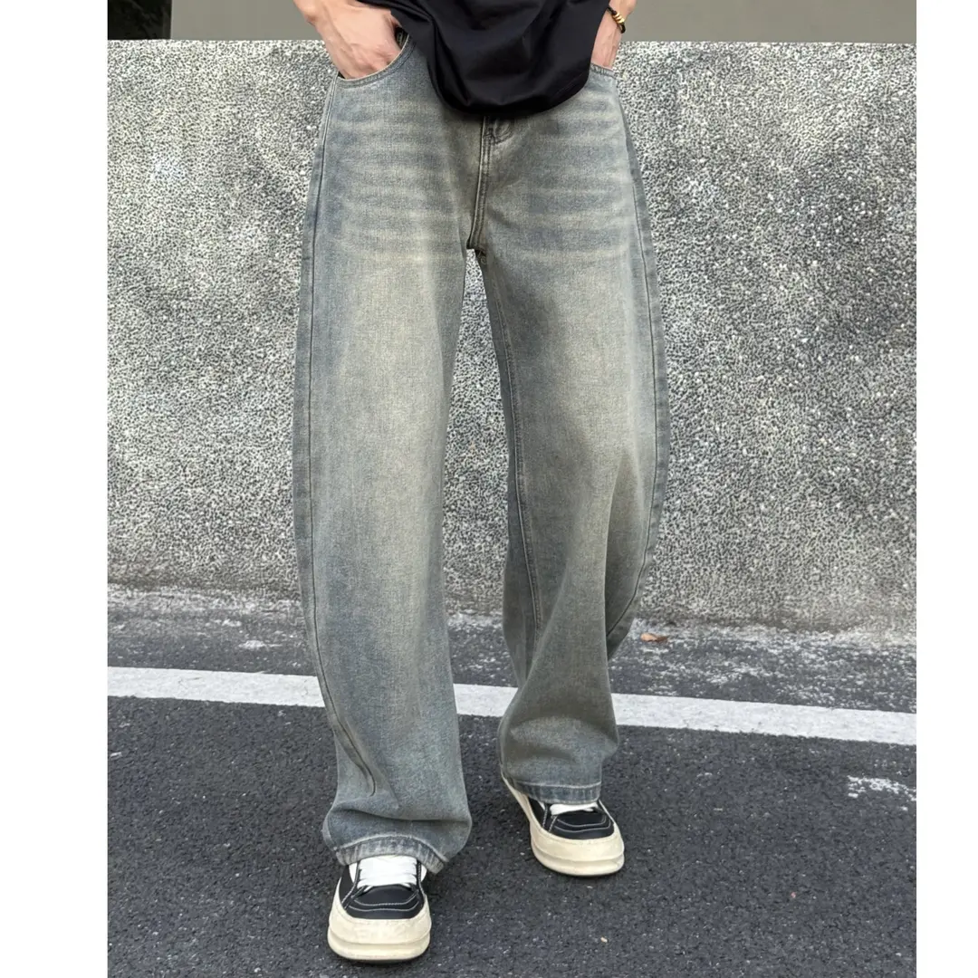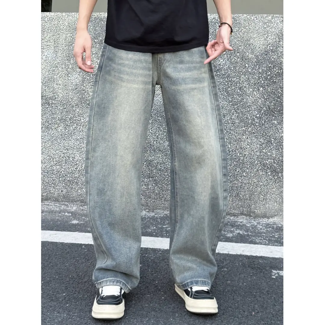 Ay美式复古弯刀做旧蓝牛弯刀时尚百搭直筒宽松显瘦牛仔裤SHAPOES