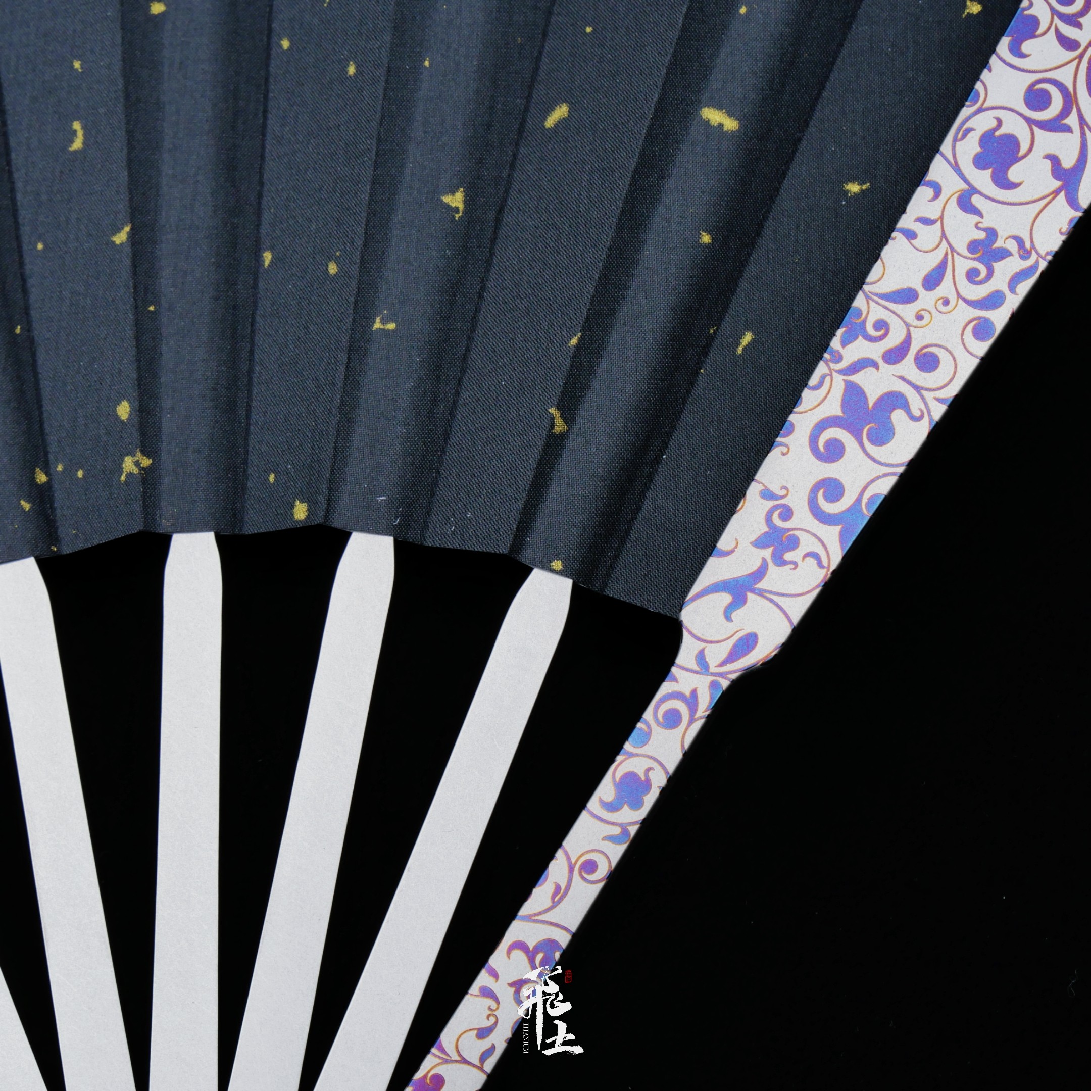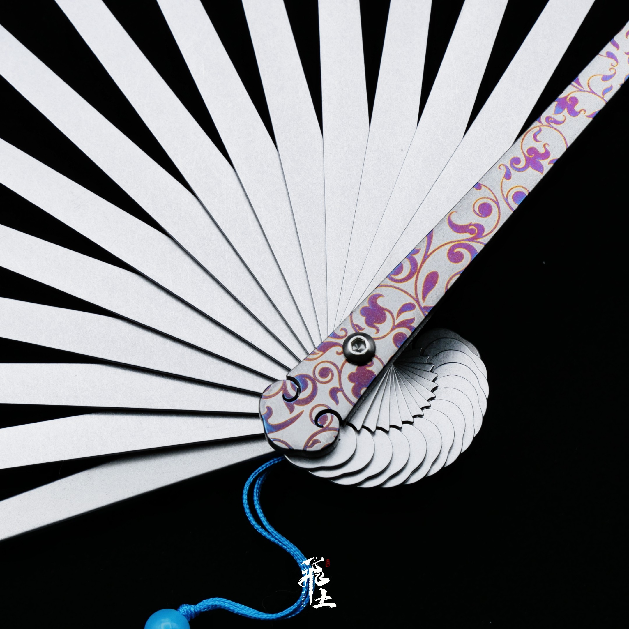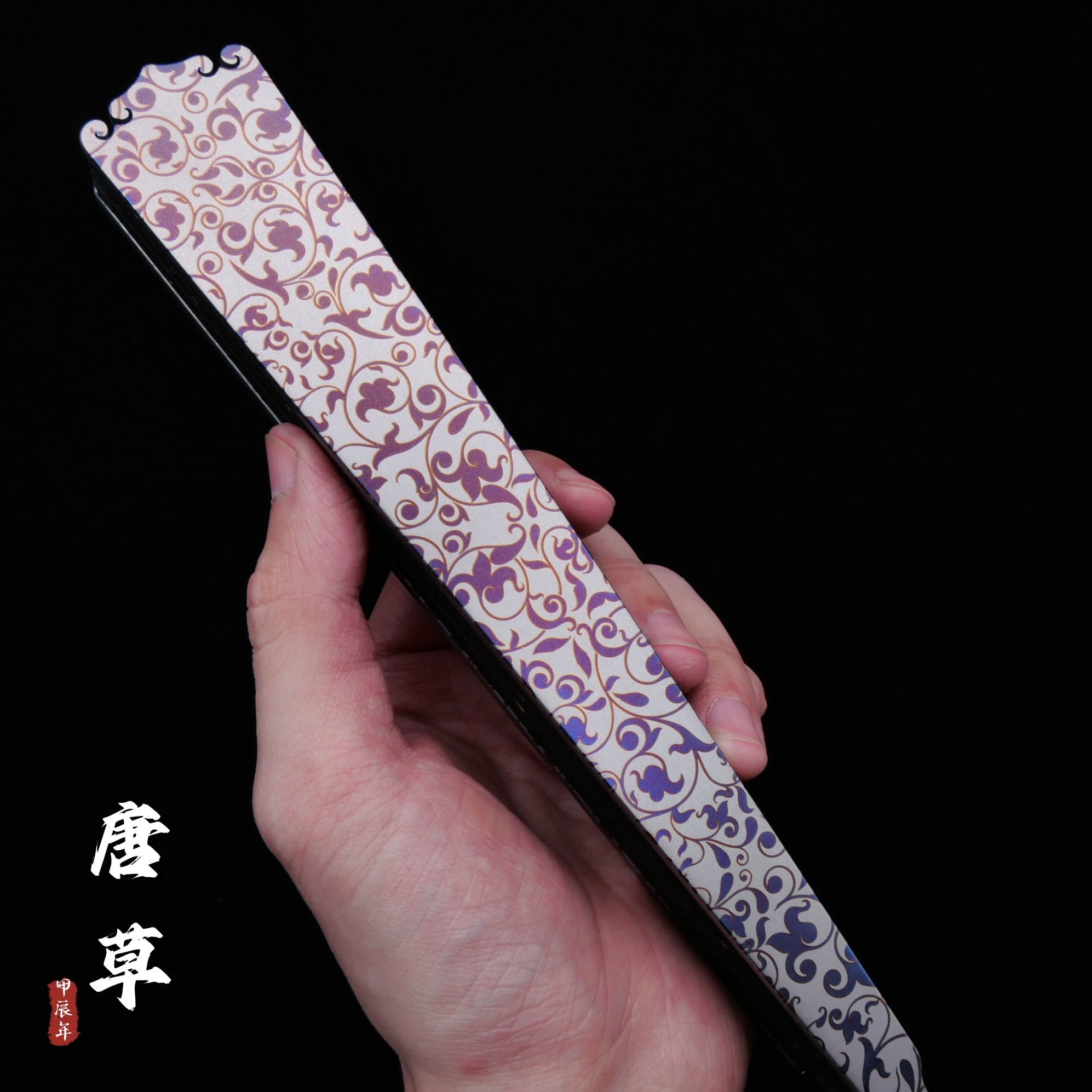 --------------------- 唐草钛合金雕刻折扇全金属扇骨渐变烤蓝古风国潮文玩洒金绢布扇子 【原售价】298元 【现售价】298元 【推荐理由】