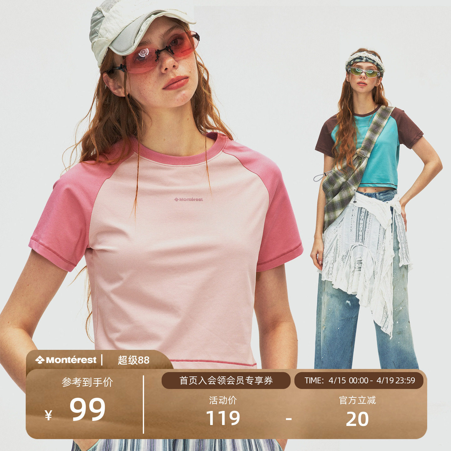 --------------------- 瞬时山野Monterest户外复古7A抗菌凉感插肩拼色短袖圆领修身T恤女 【原售价】149元 【现售价】99元 【推荐理由】
