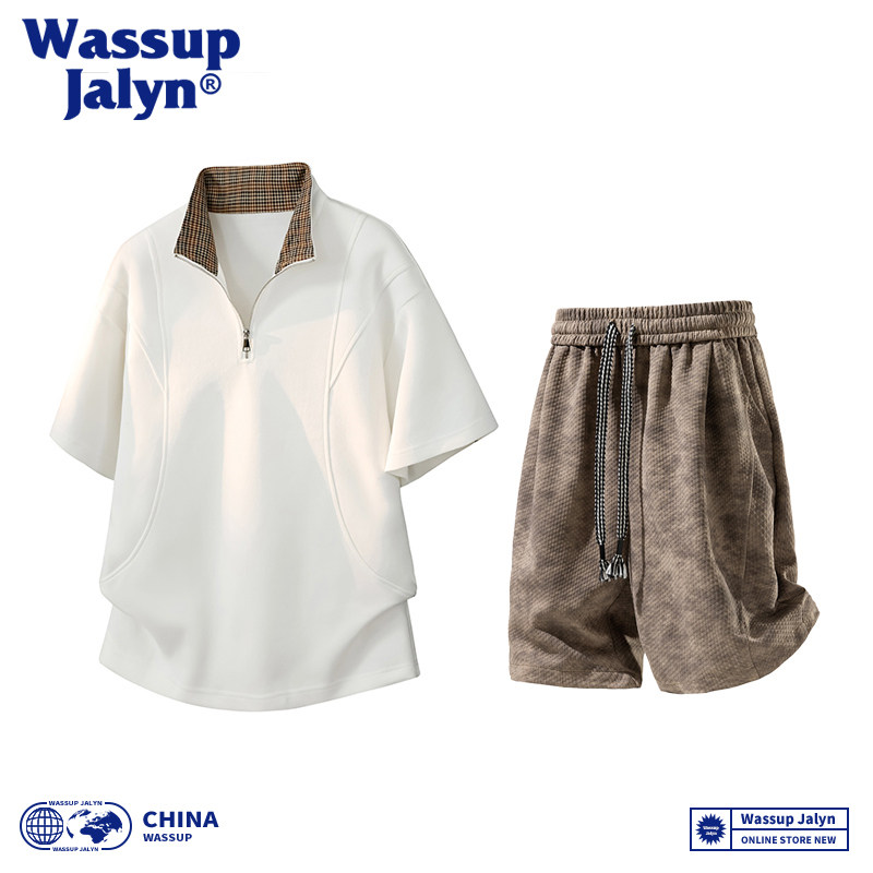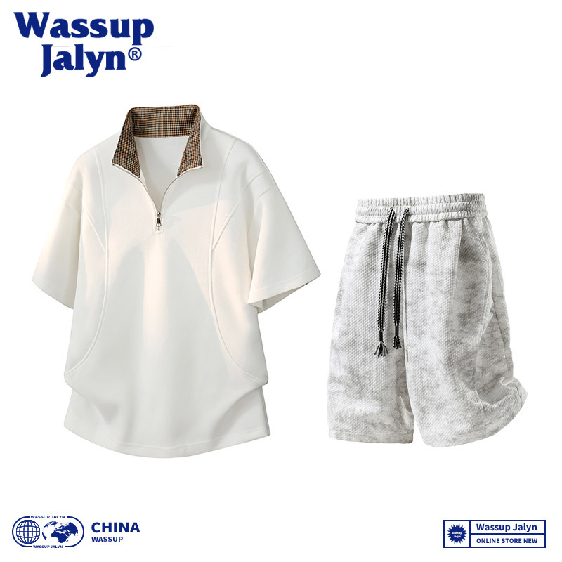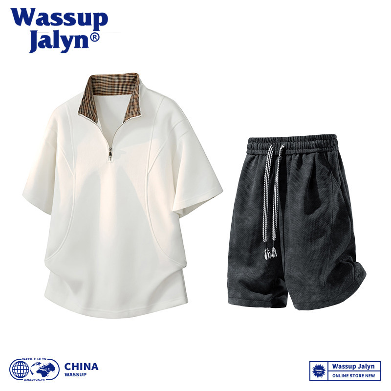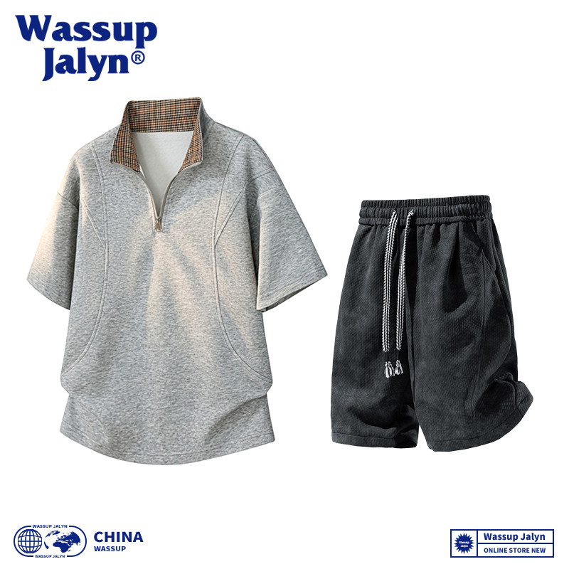 WASSUP JALYN美式解构半拉链立领短袖T恤男夏季潮牌宽松半袖套装