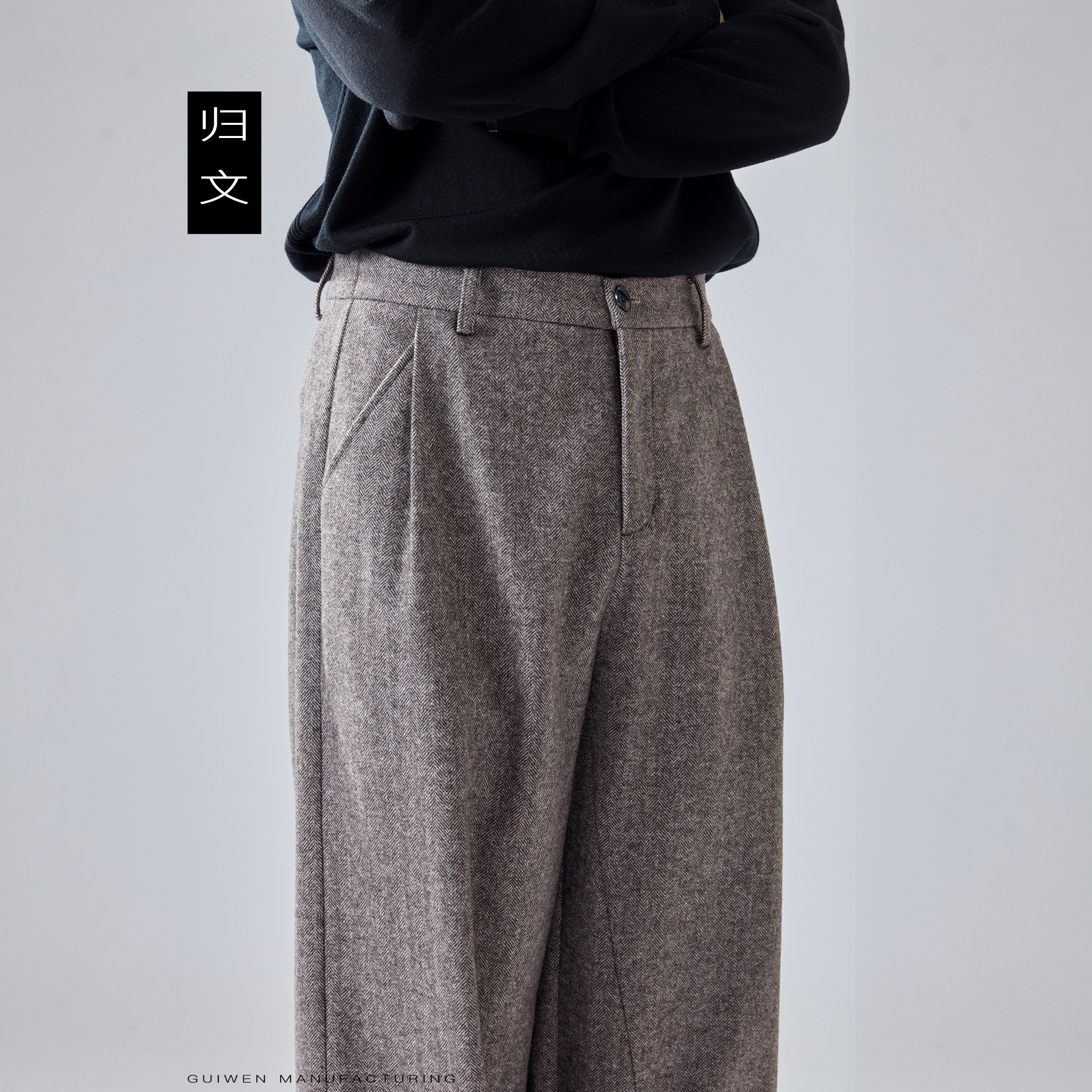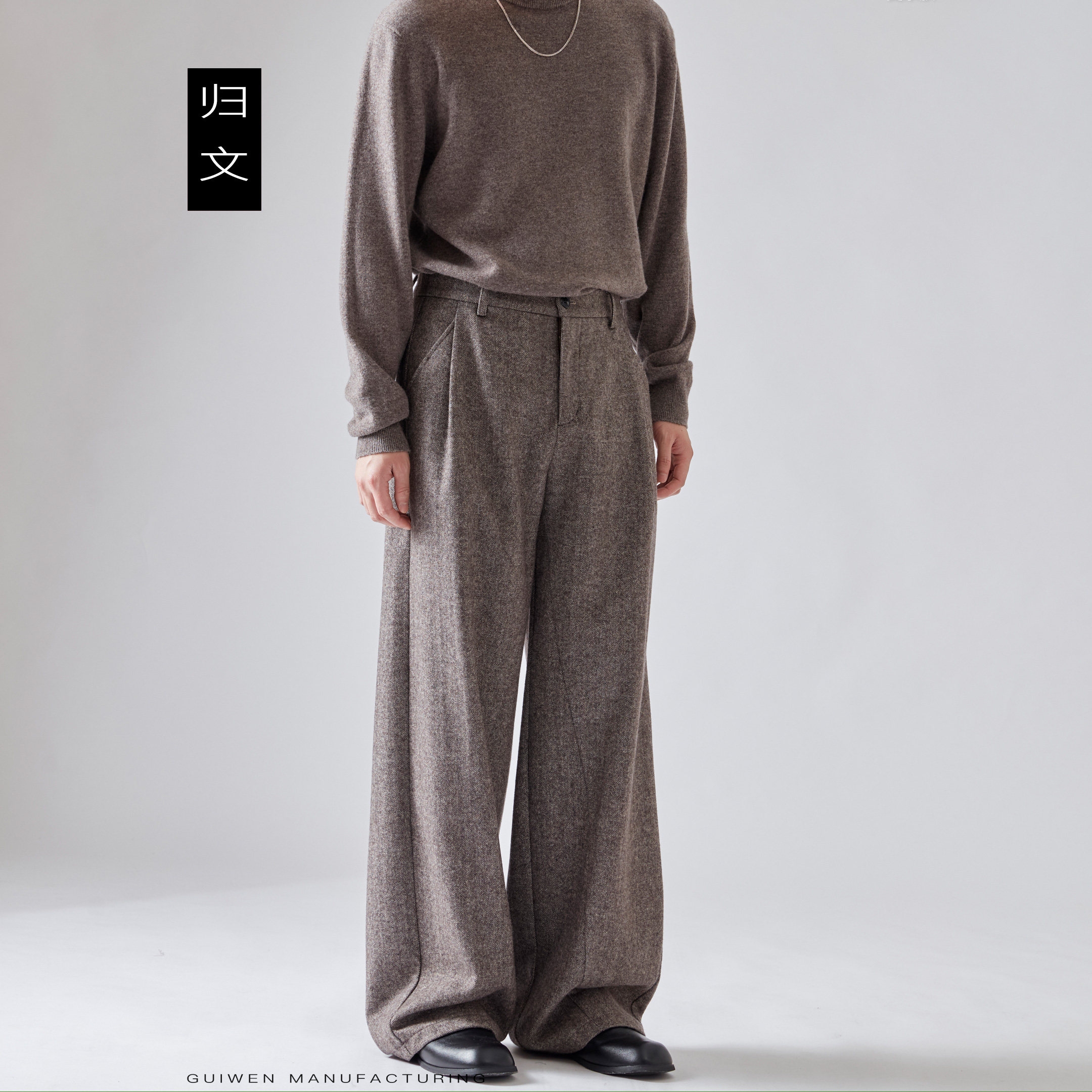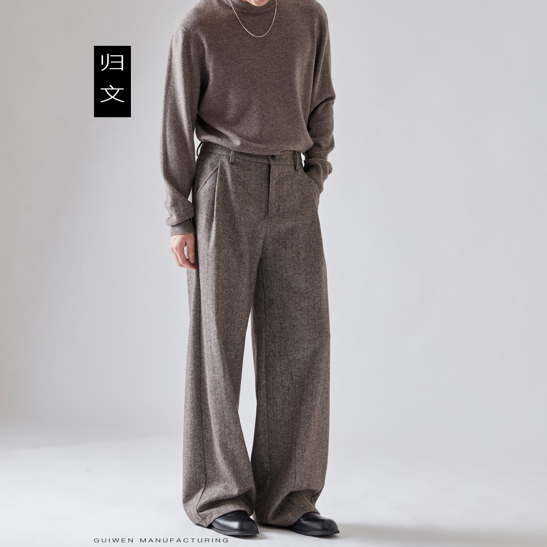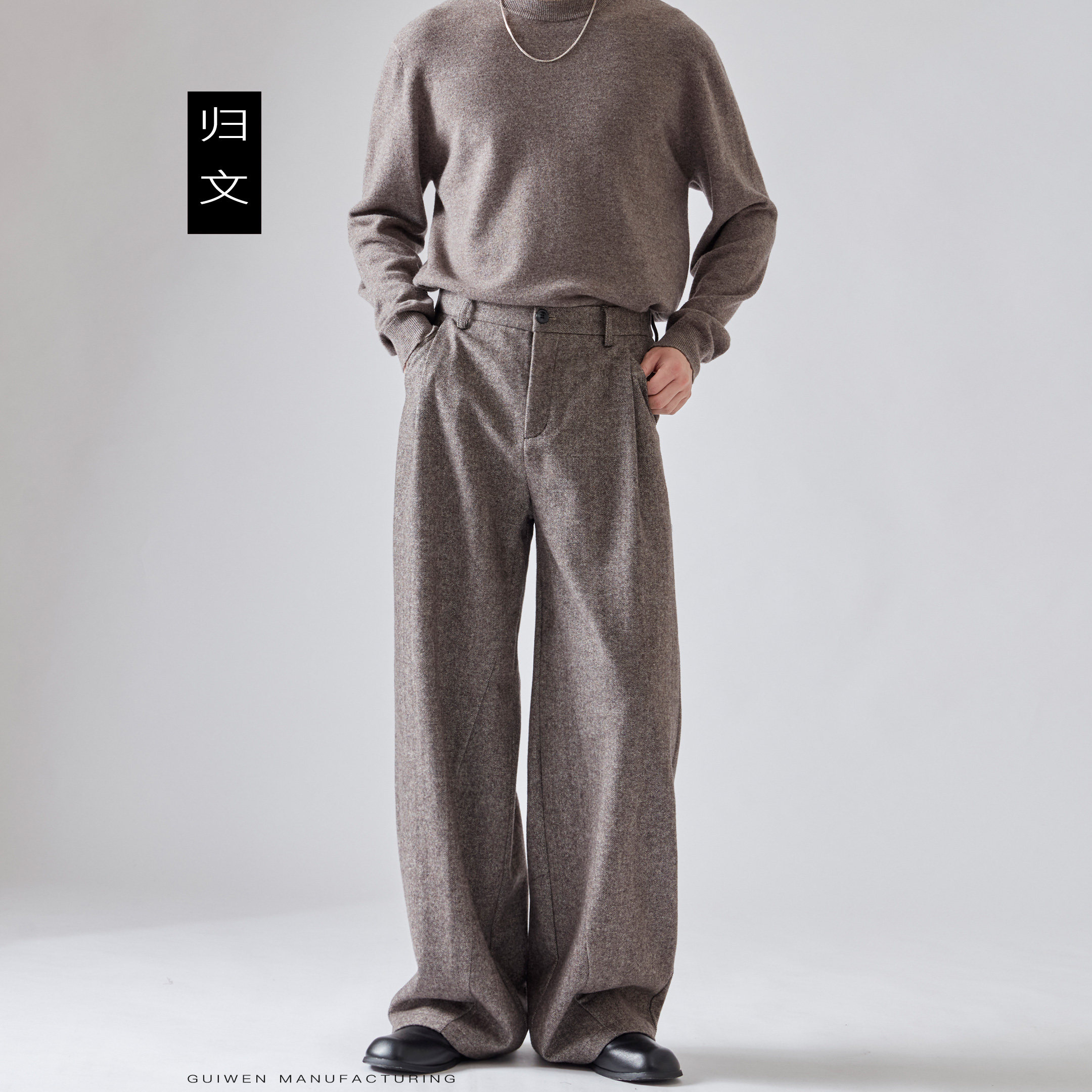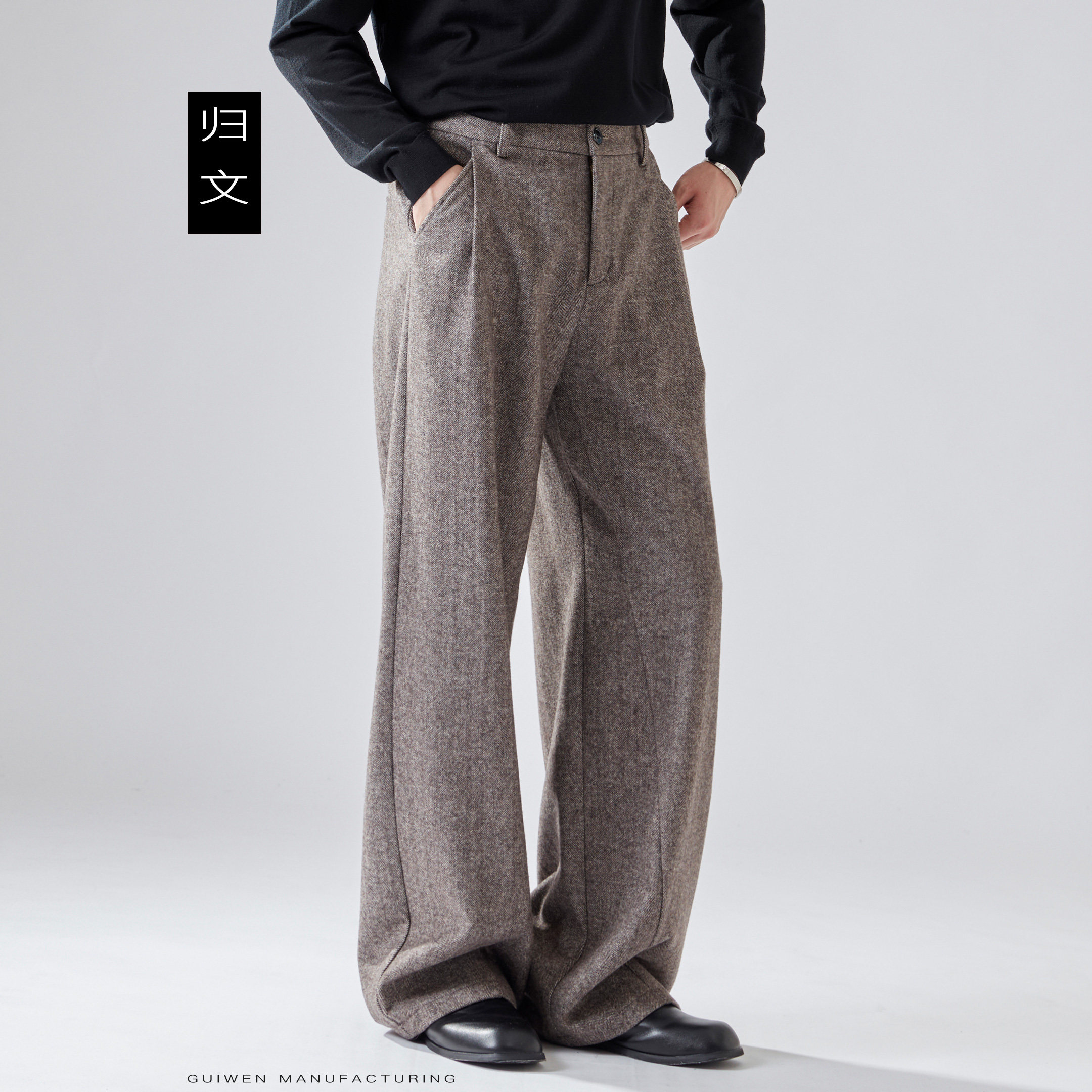 深咖色人字纹毛呢裤子男春秋新款加厚羊毛裤宽松直筒裤男个性男裤