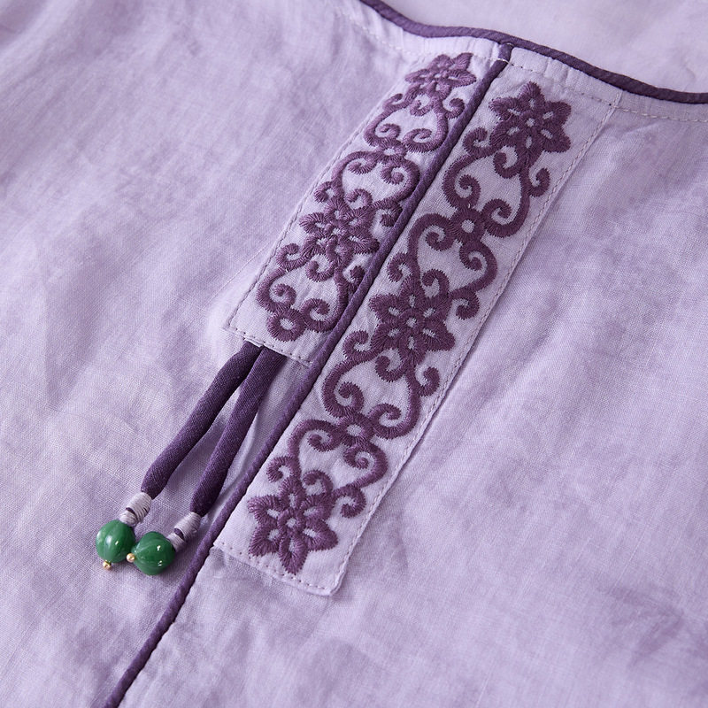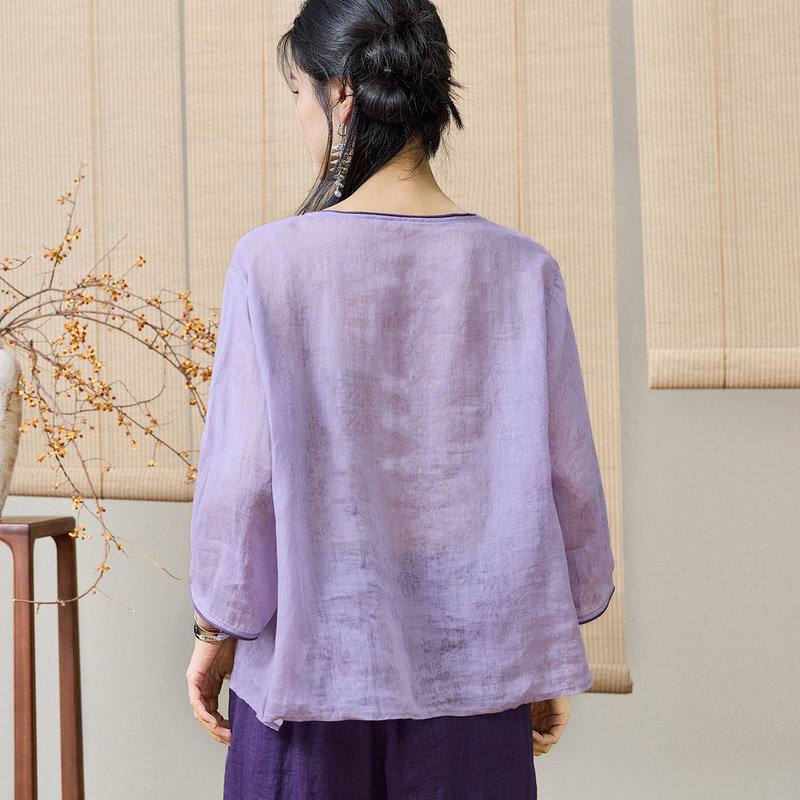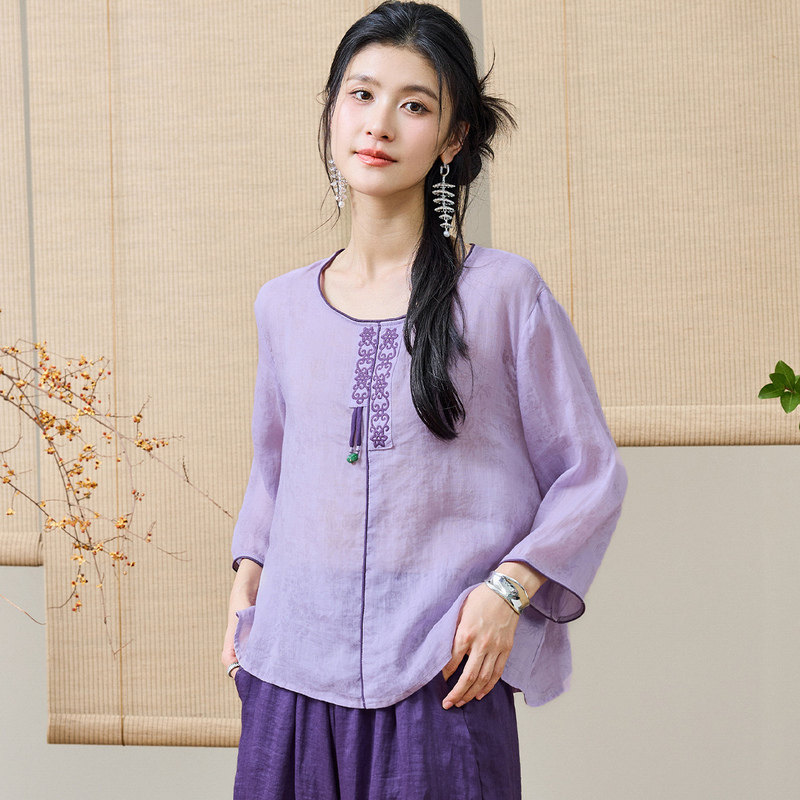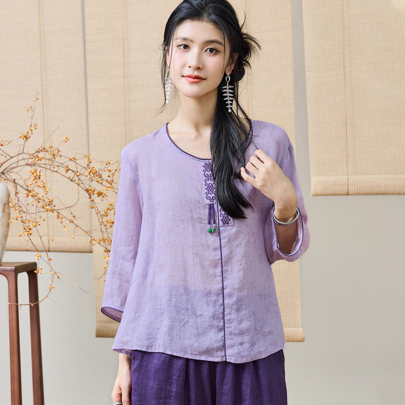【李夫人粉丝专享】新中式夏圆领刺绣流苏苎麻烧花宽松九分袖T恤