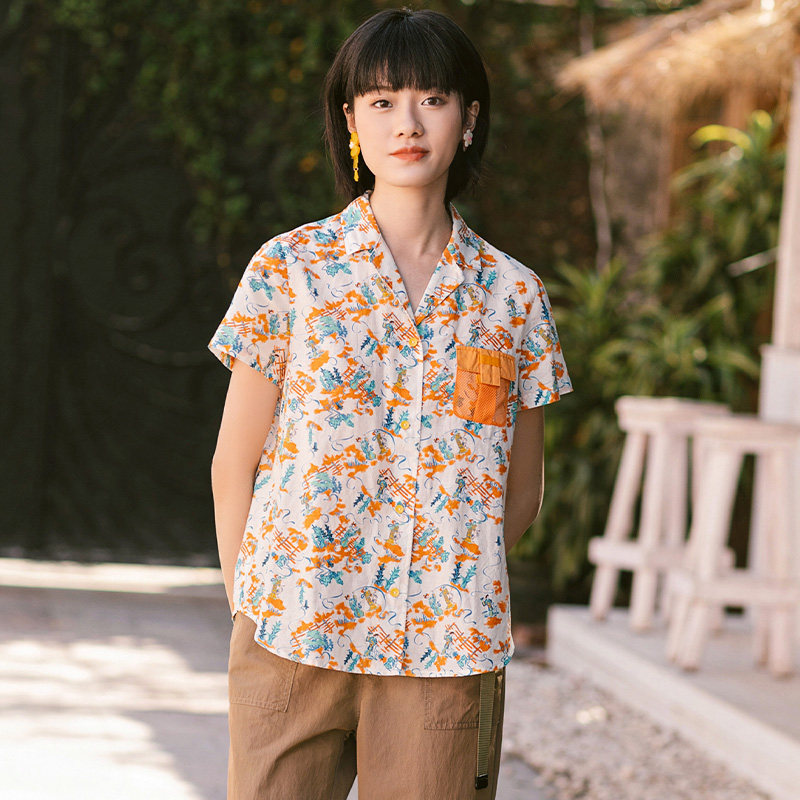 非鱼夏季新款威夷短袖衬衫设计感国潮印花衬衫女装丝绵上衣