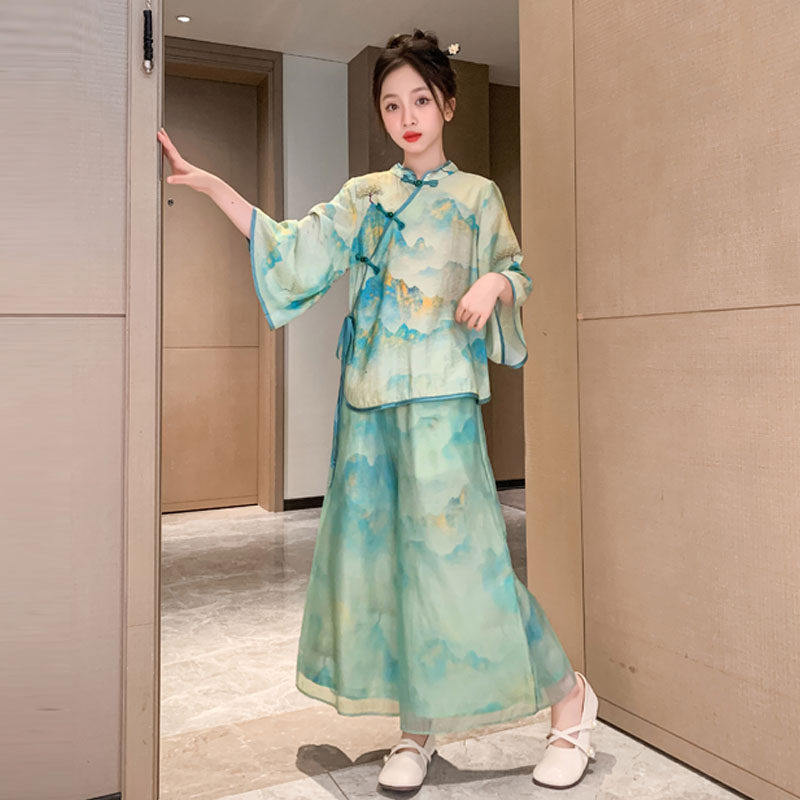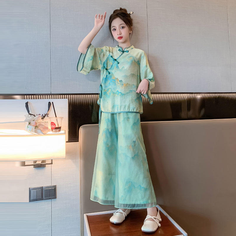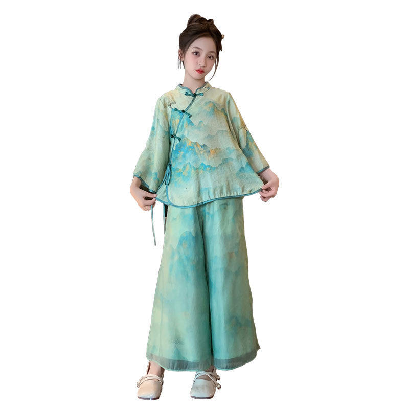 NEXT JANSO女童中国风汉服套装夏季复古立领上衣阔腿裤两件套洋气