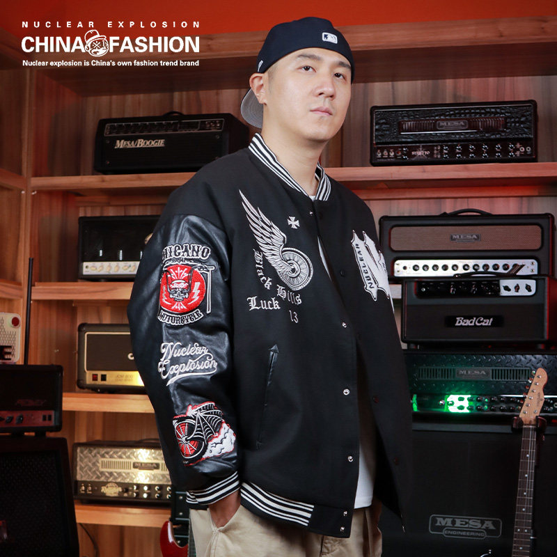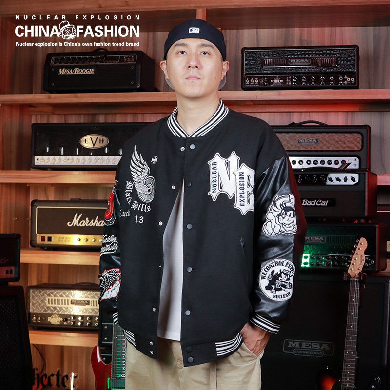 核爆炸大码男装国潮原创设计重工刺绣棒球服美式复古徽章夹克外套