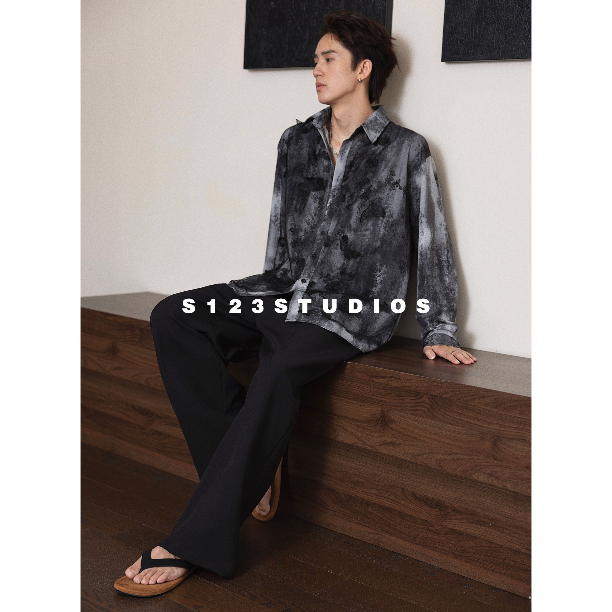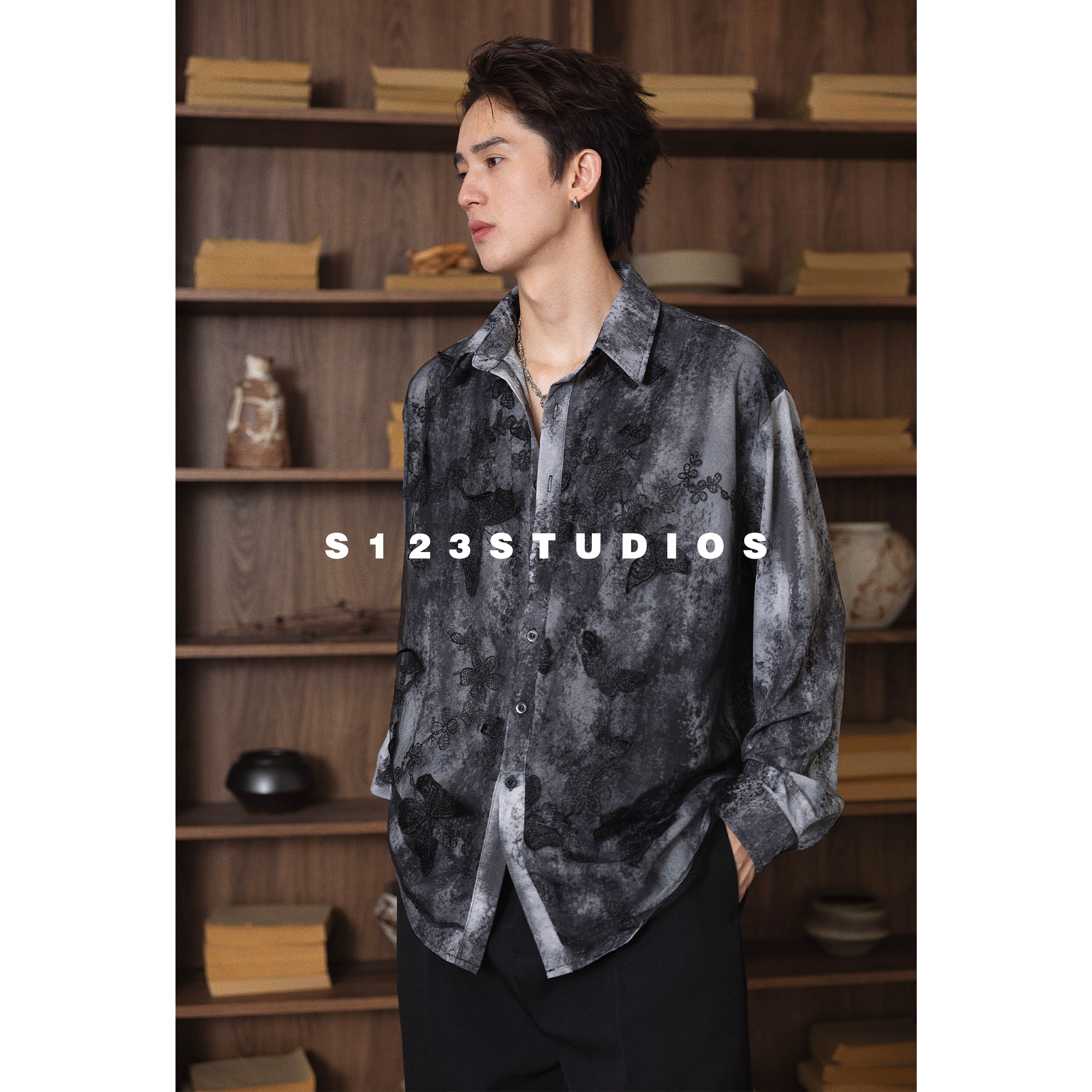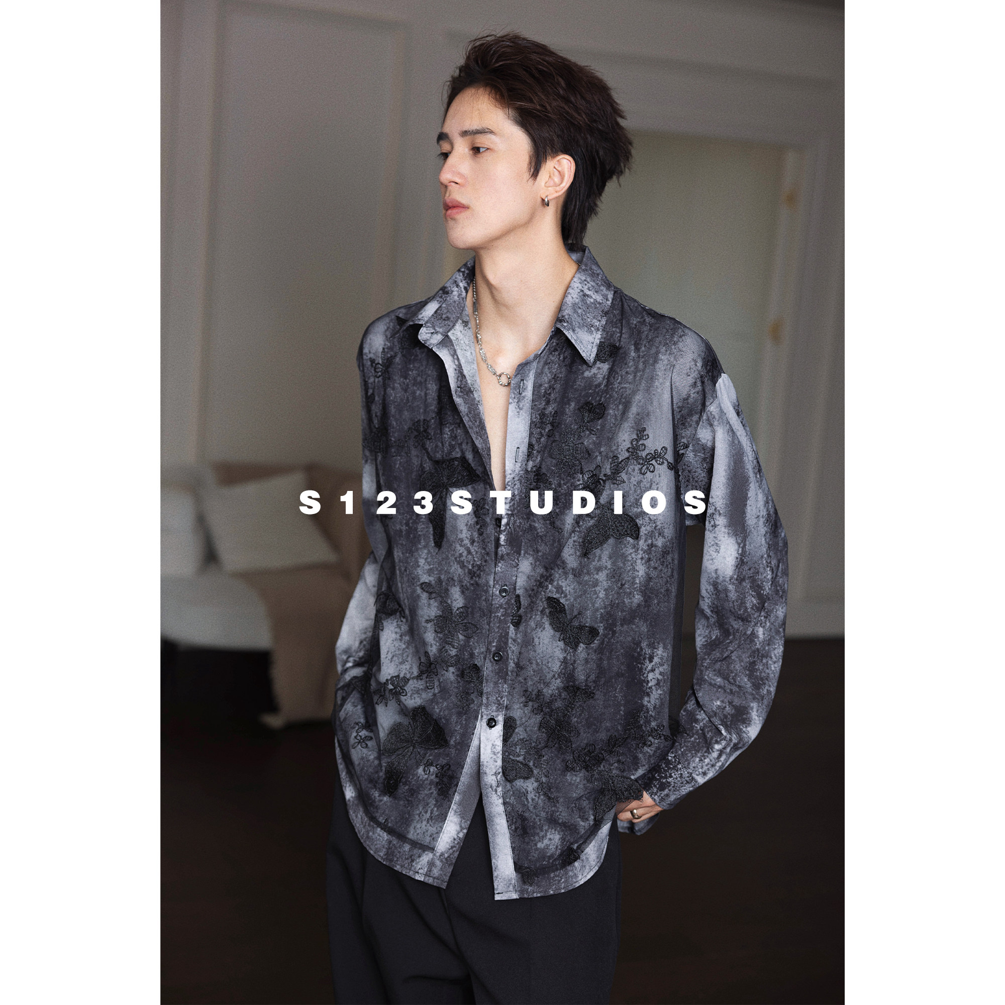 S123聪明陈【雾南山蝶】立体蝴蝶扎染网纱双层长袖衬衫暗黑风开衫