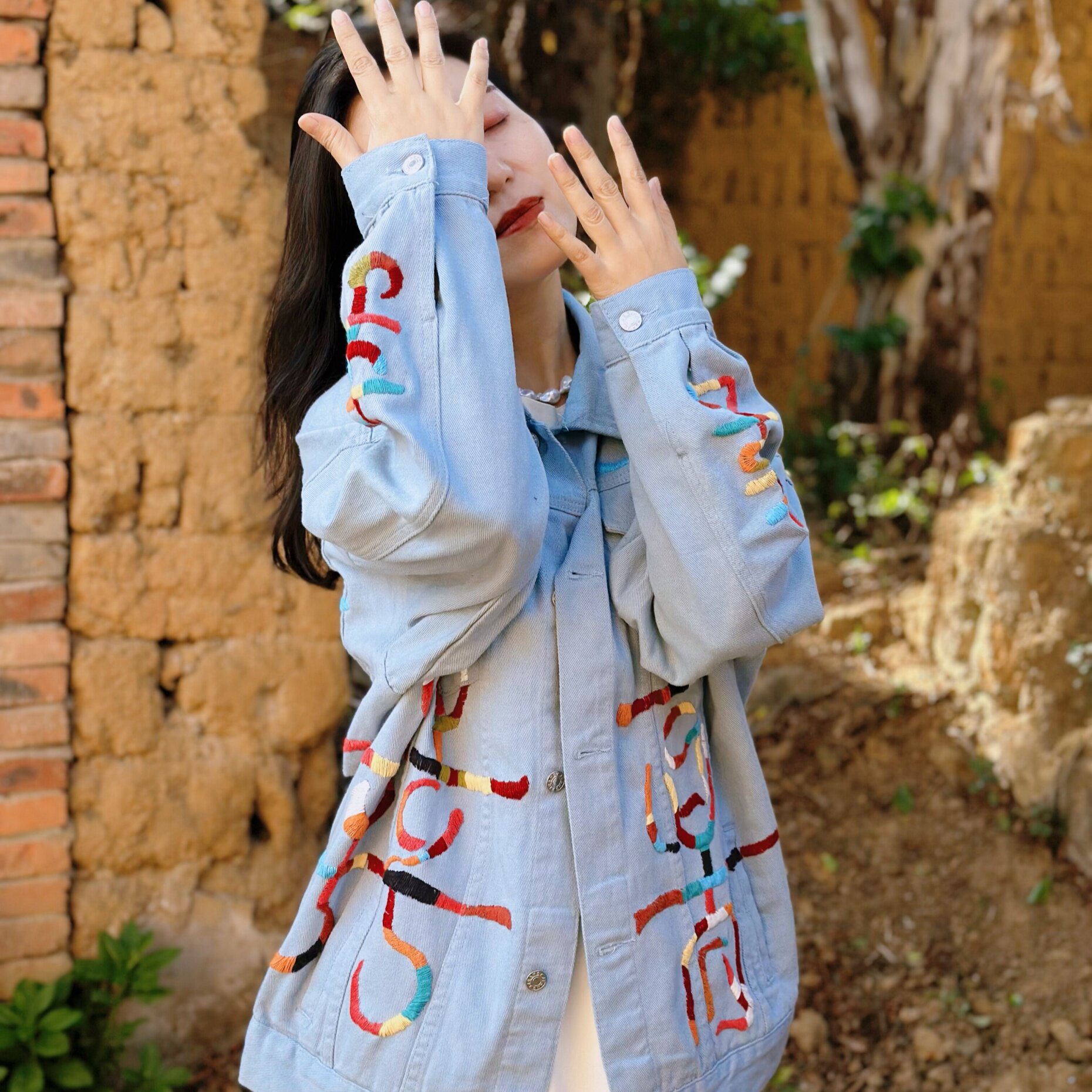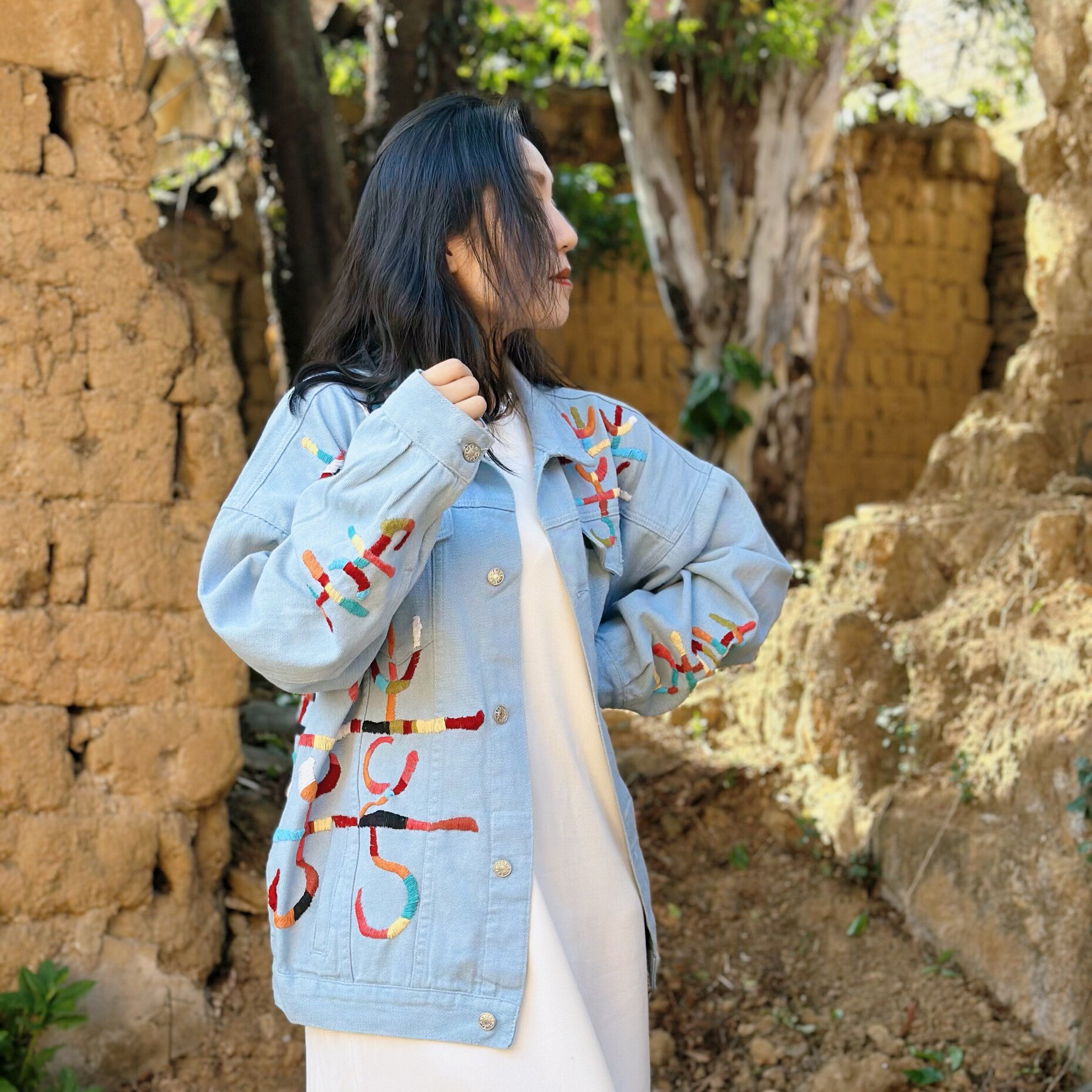 民族风彩色刺绣牛仔外套 宽松落肩新中式国潮古着感休闲外衣