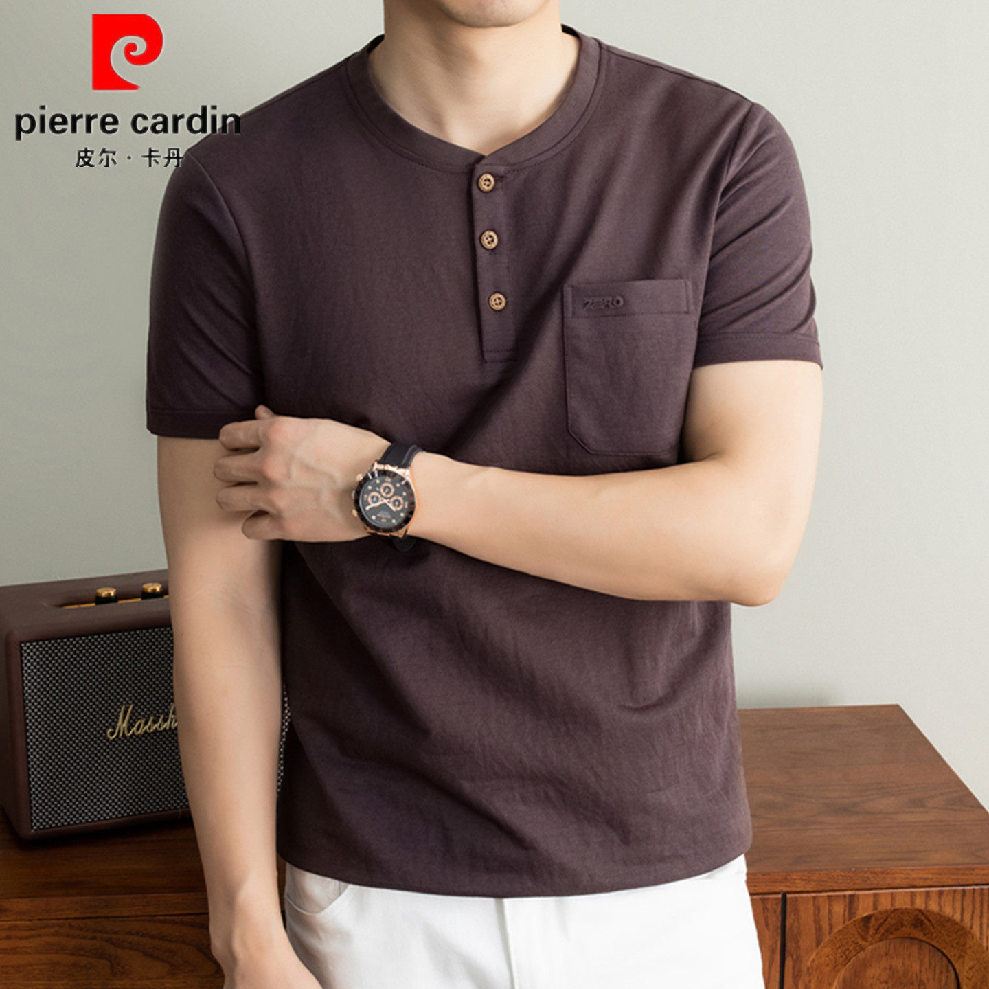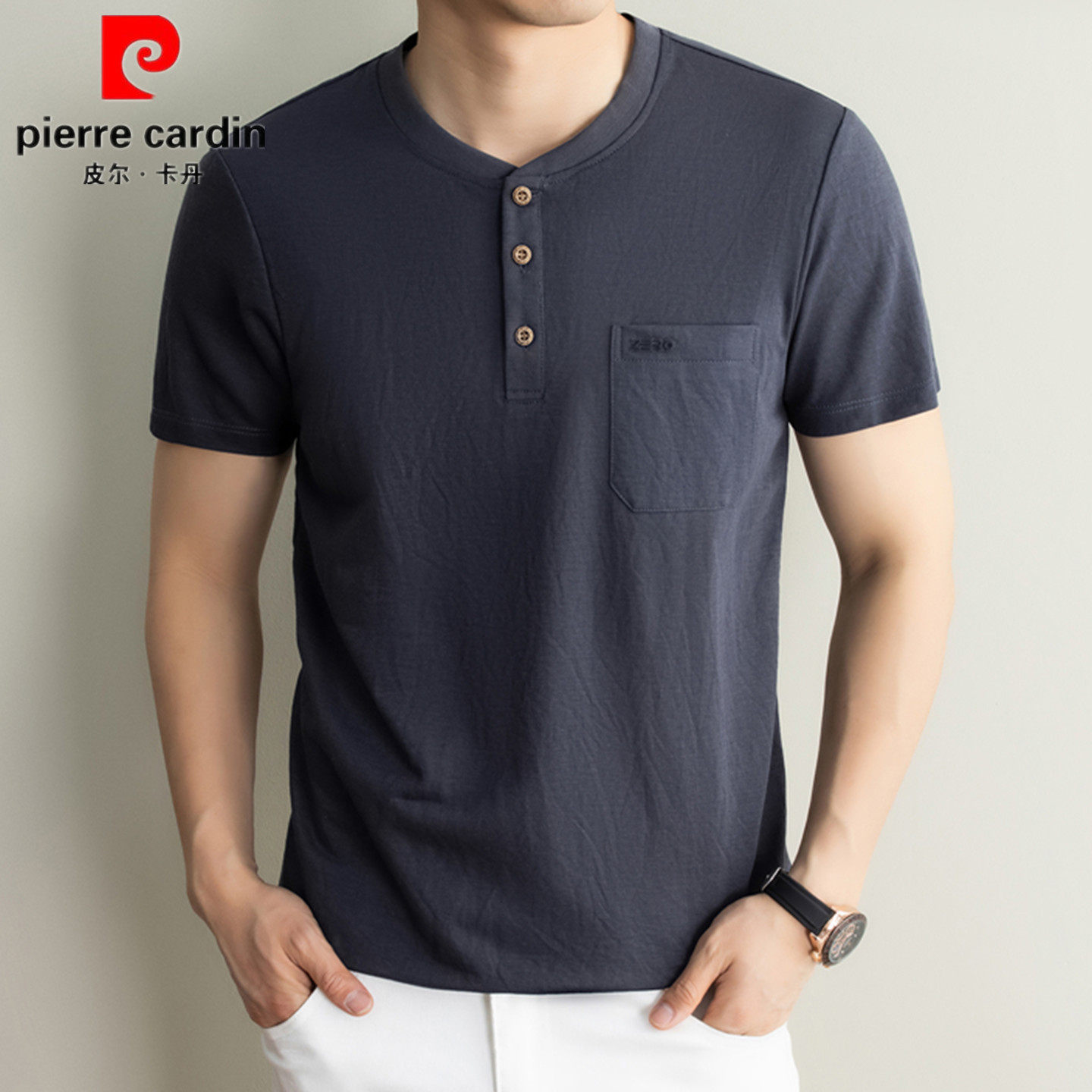 --------------------- 皮尔卡丹男士短袖棉麻T恤休闲圆立领宽松透气纯色口袋上衣中年潮 【原售价】388元 【现售价】130元 【推荐理由】