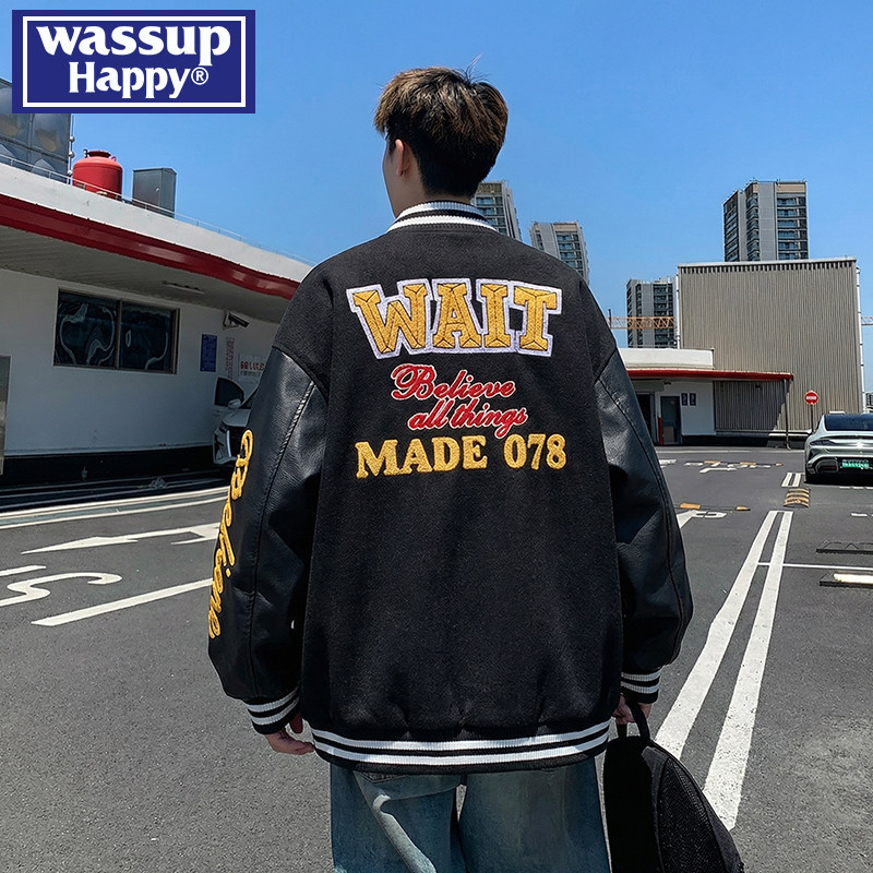 wassup happy美式毛巾绣字母棒球服外套男春秋季复古宽松情侣夹克