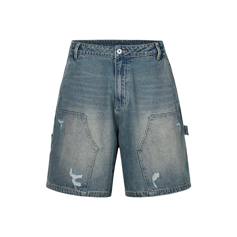 GuukaTech户外水洗做旧阔腿牛仔五分裤男 复古磨破工装伐木短裤女