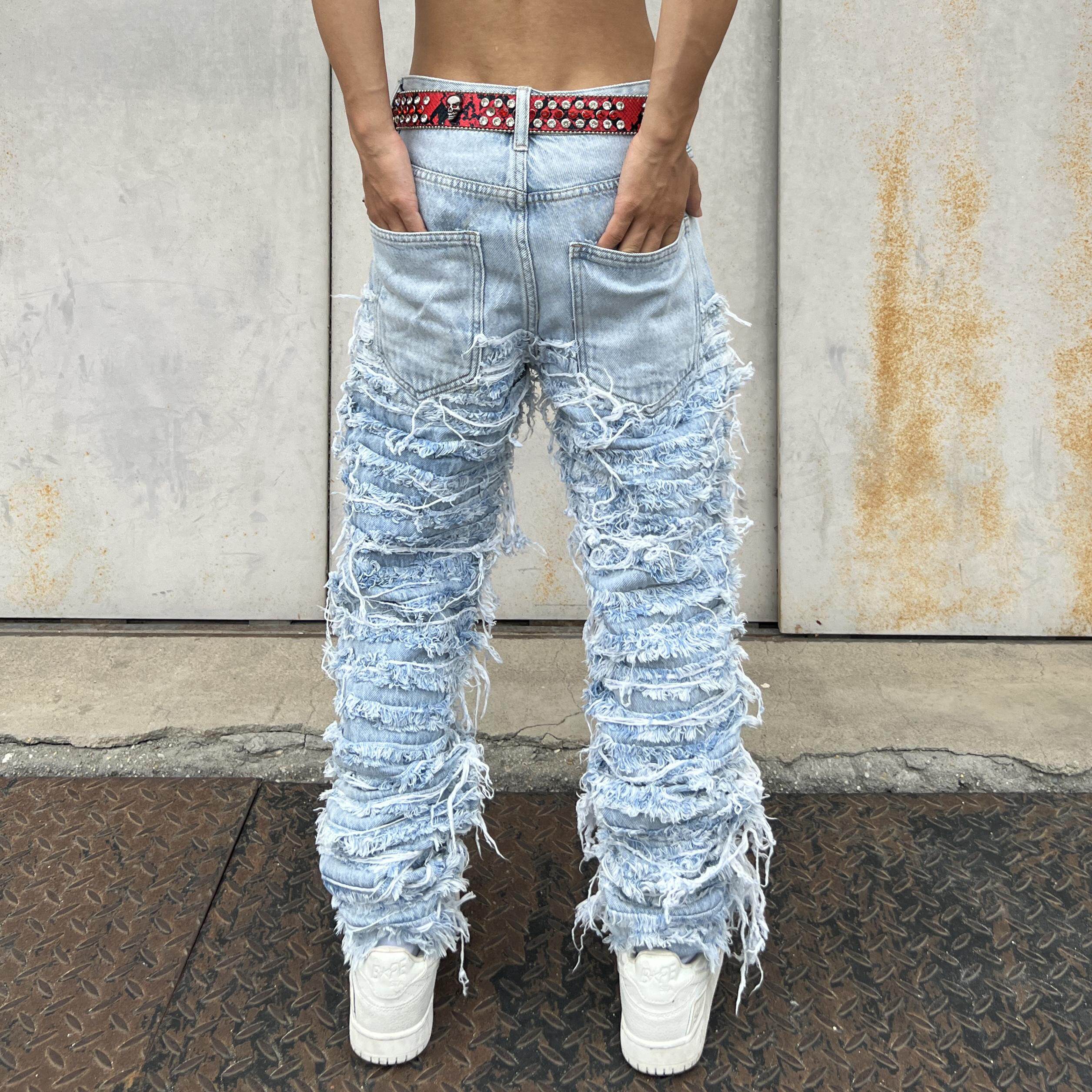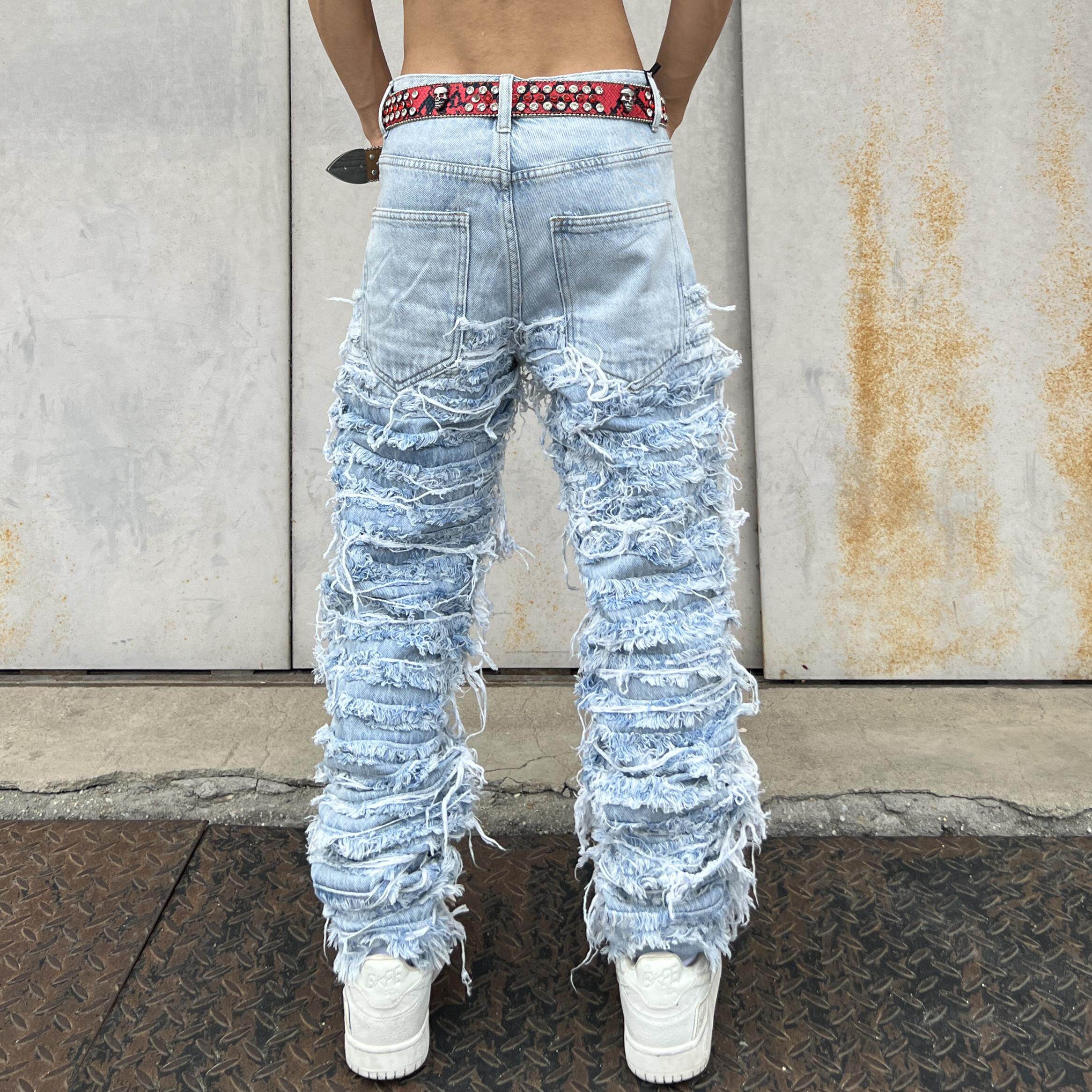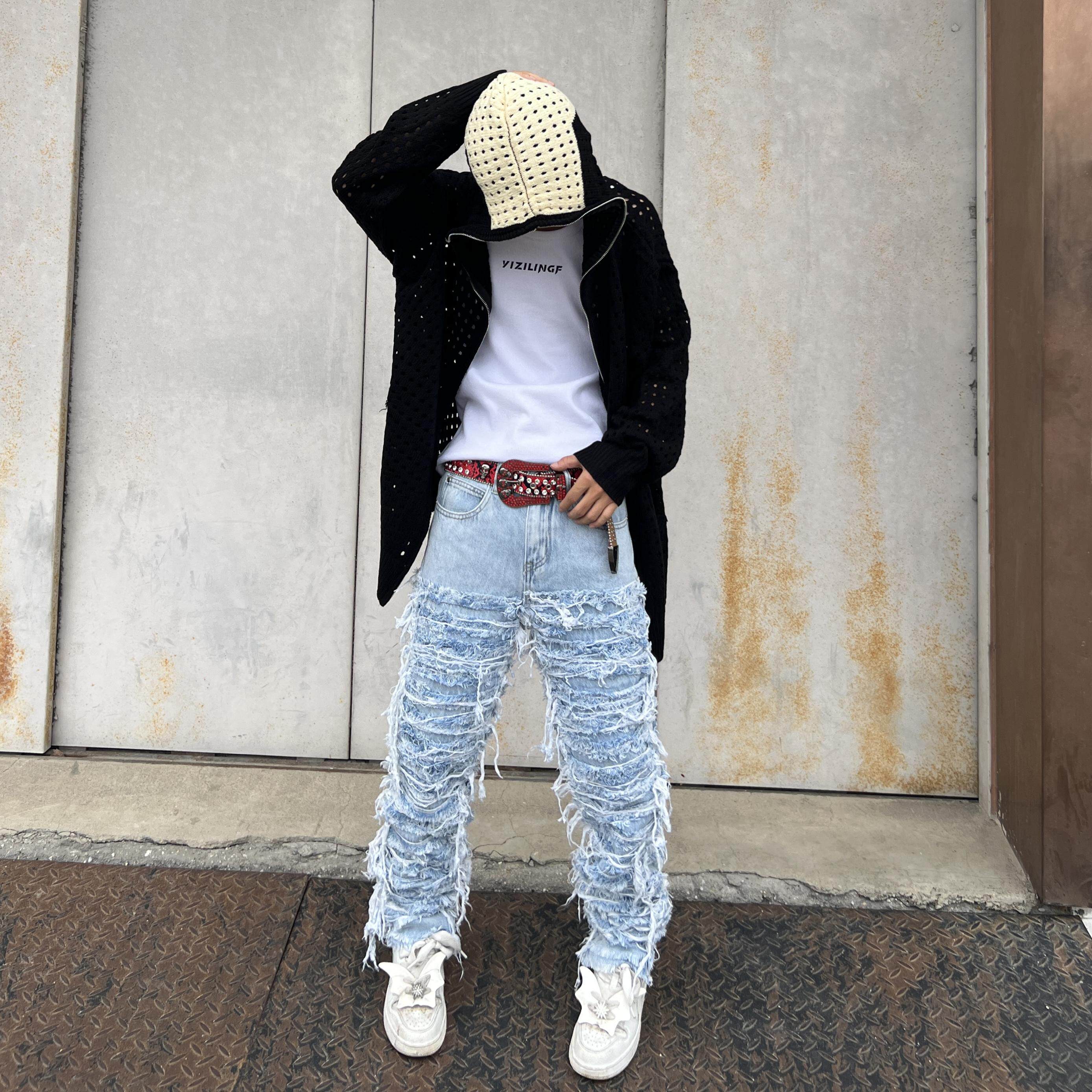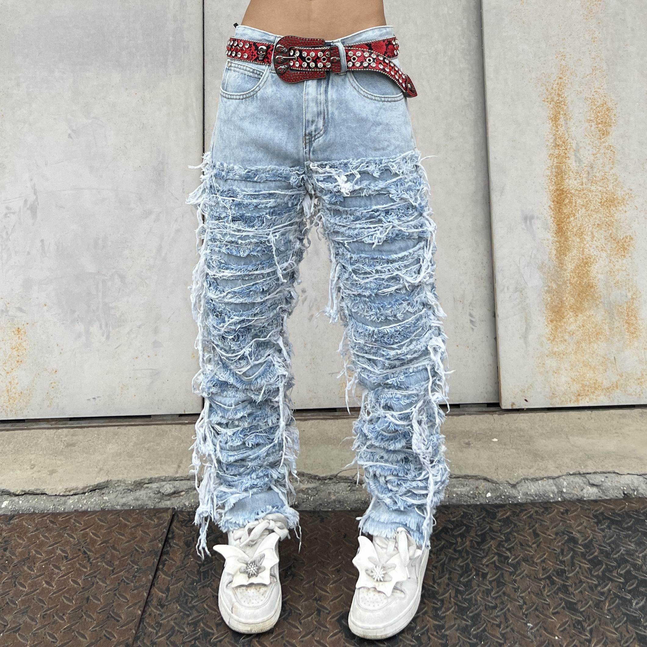 YIZILINGF 原创蓝色水洗重工四季宽松直脚流行高街流苏牛仔裤男女
