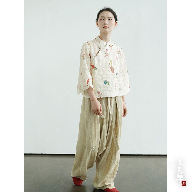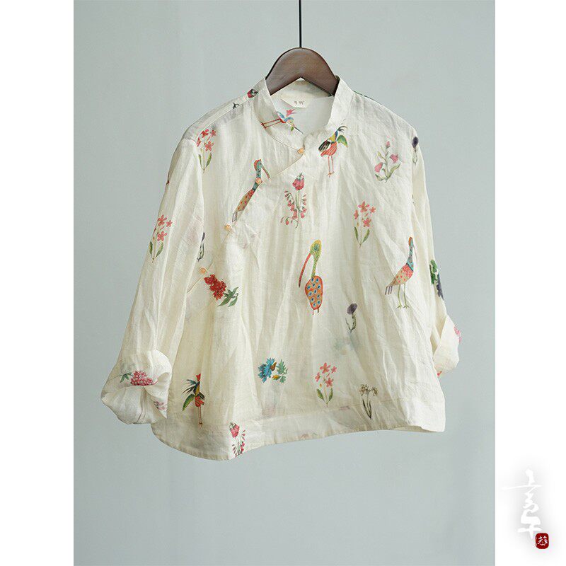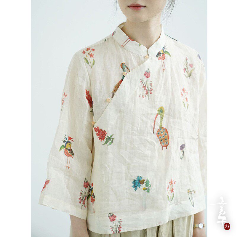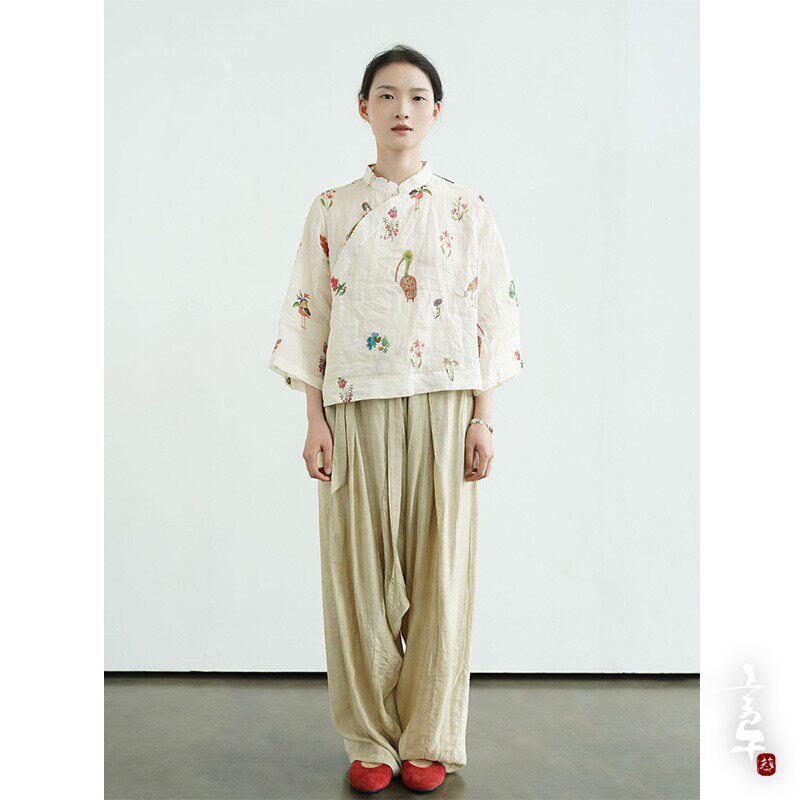 言午葵原创茶室新中式立领苎麻上衣 国潮宽袖数码印花遮阳衬衫