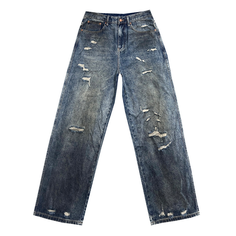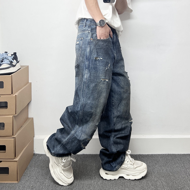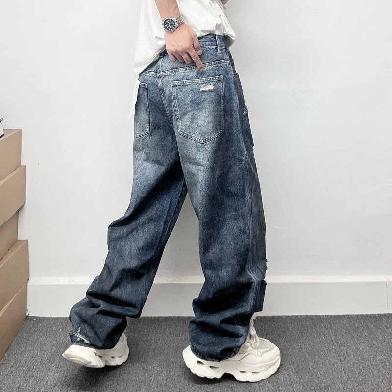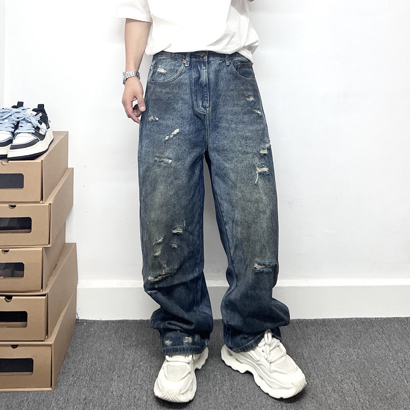 潮牌痞帅脏脏做旧刮烂破洞牛仔裤男士休闲宽松直筒大码阔腿长裤子