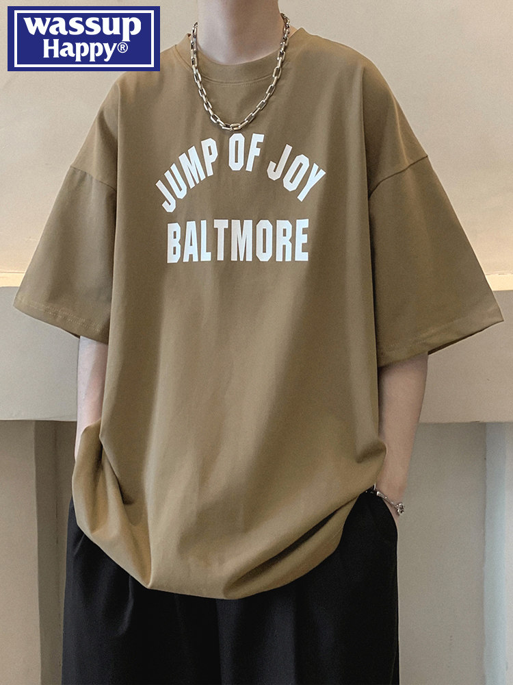wassup happy酒红色短袖t恤男夏季潮牌五分袖美式宽松百搭体恤衫
