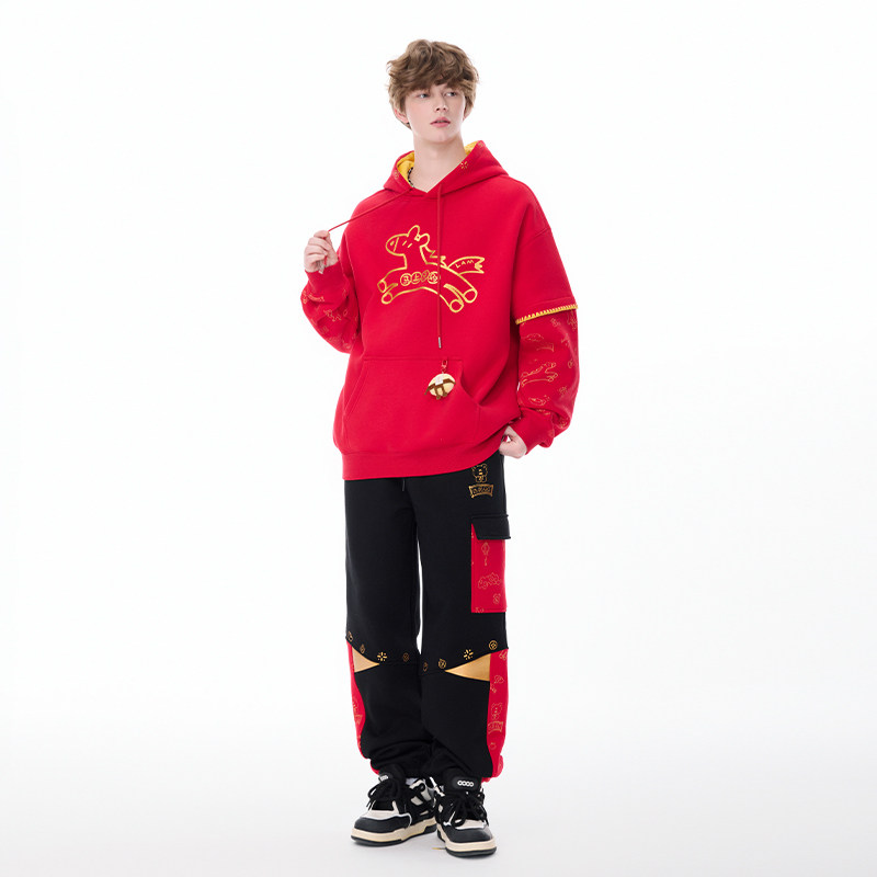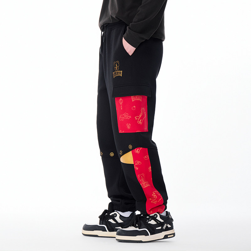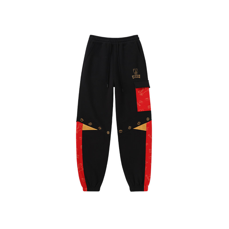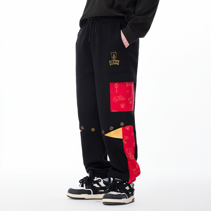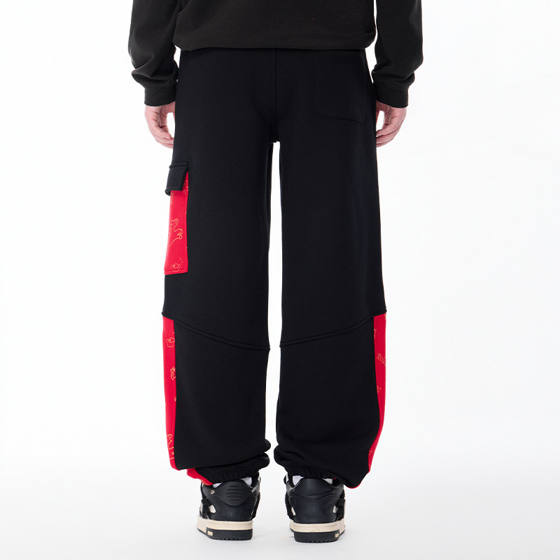 淘宝LAMLICKA马年印花休闲裤加绒加厚国潮拼接撞色卫裤宽松束脚长裤