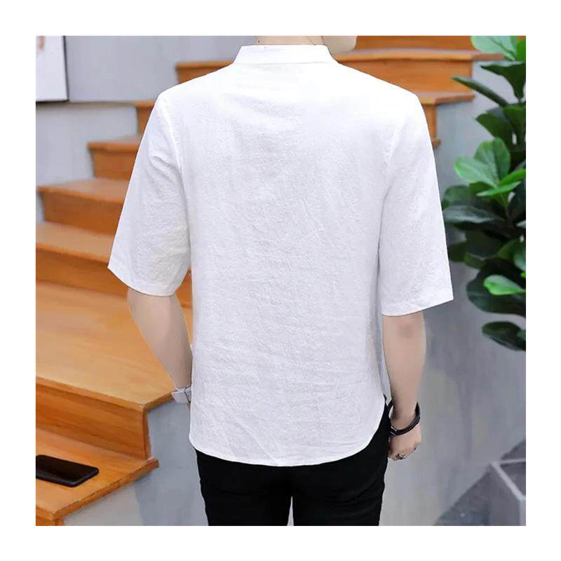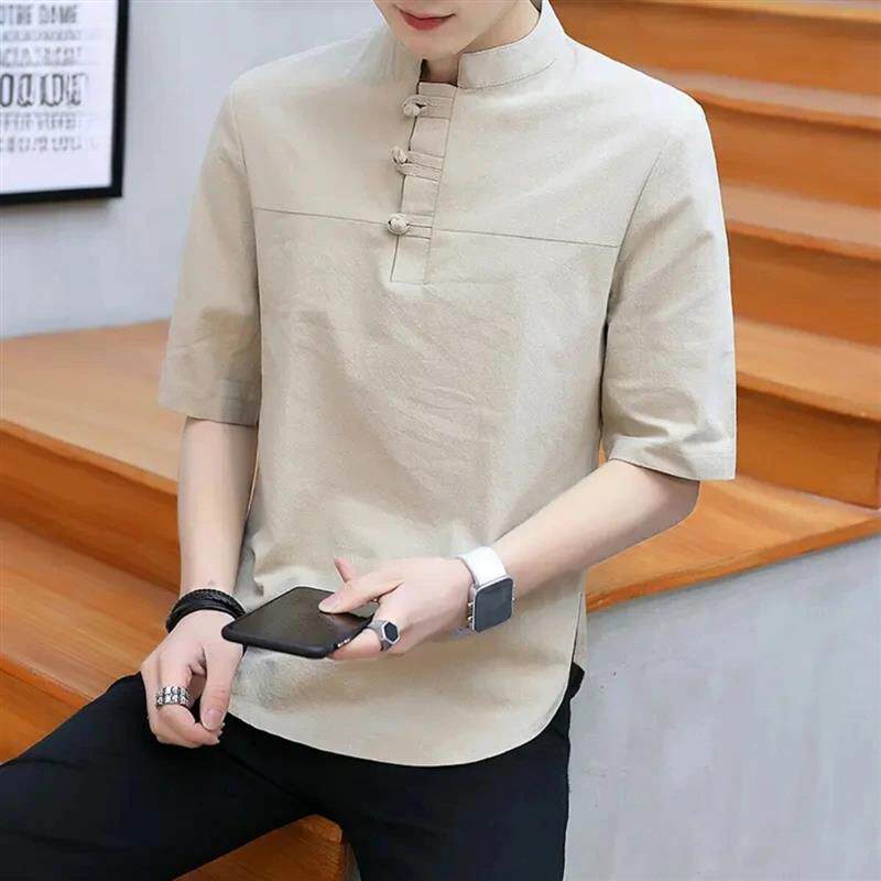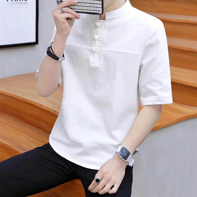青云衣阁新中式立领五分袖衬衫男复古盘扣亚麻体恤休闲国潮短袖
